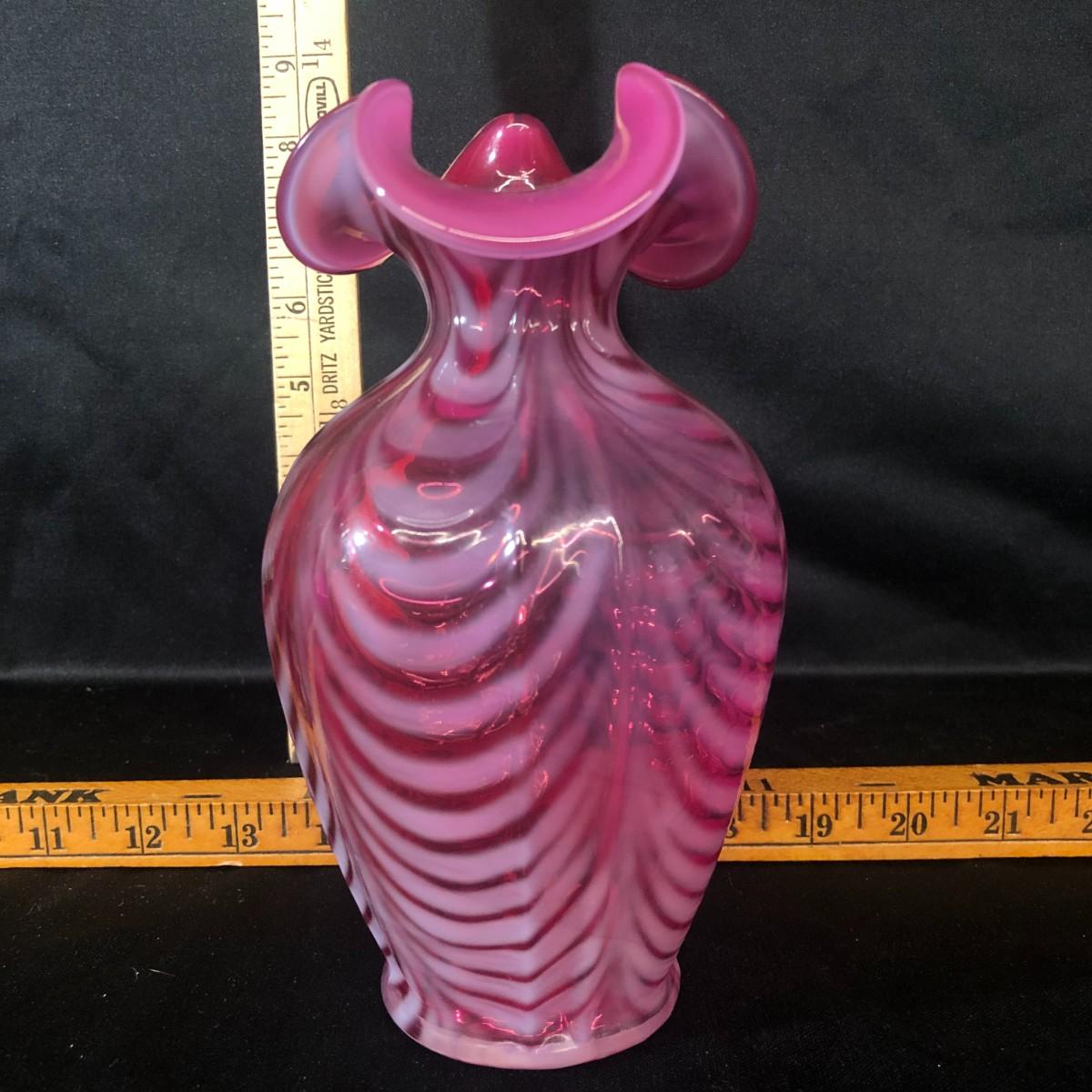 Fenton Cranberry Opalescent Drapery Ruffled Rim Vase