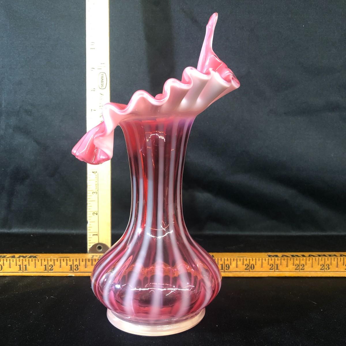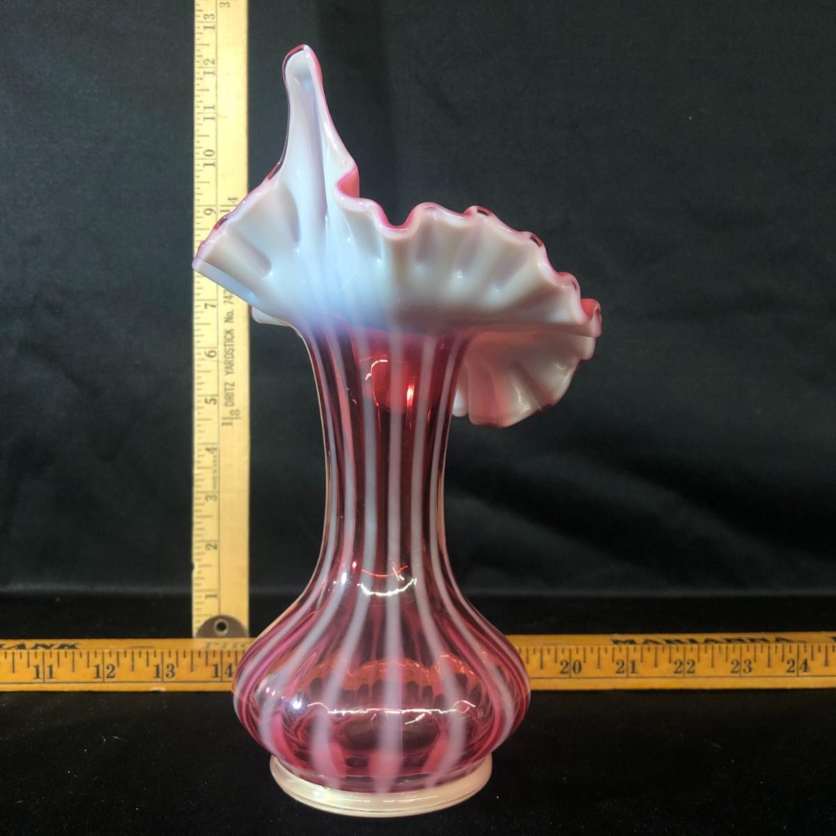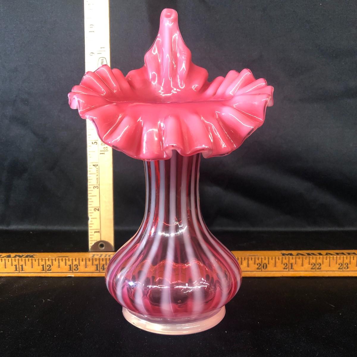 Fenton Cranberry Jack in the Pulpit Opalescent Stripe Ruffled Edge Glass Vase