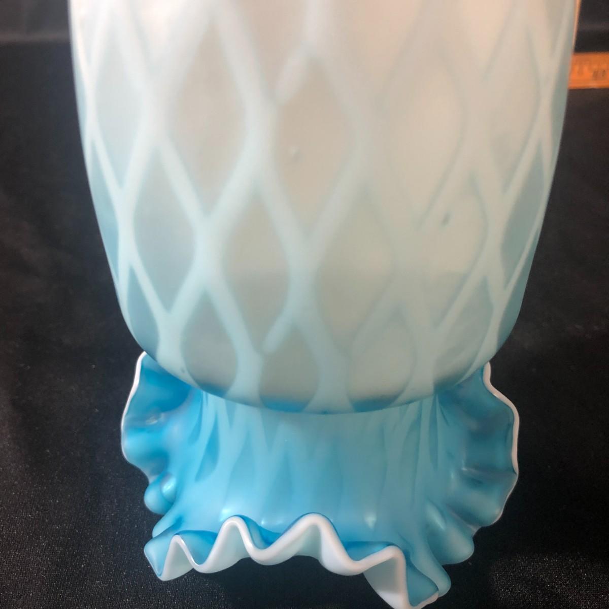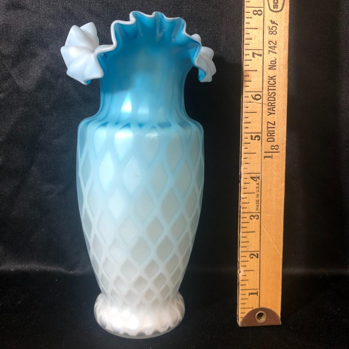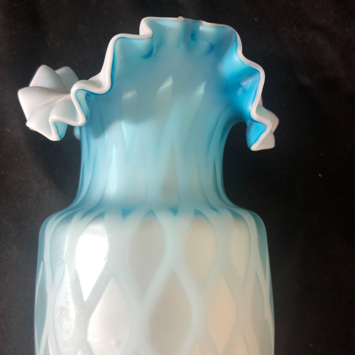Fenton Blue Mother of Pearl Diamond Quilted Double Ruffled Satin Glass Vase