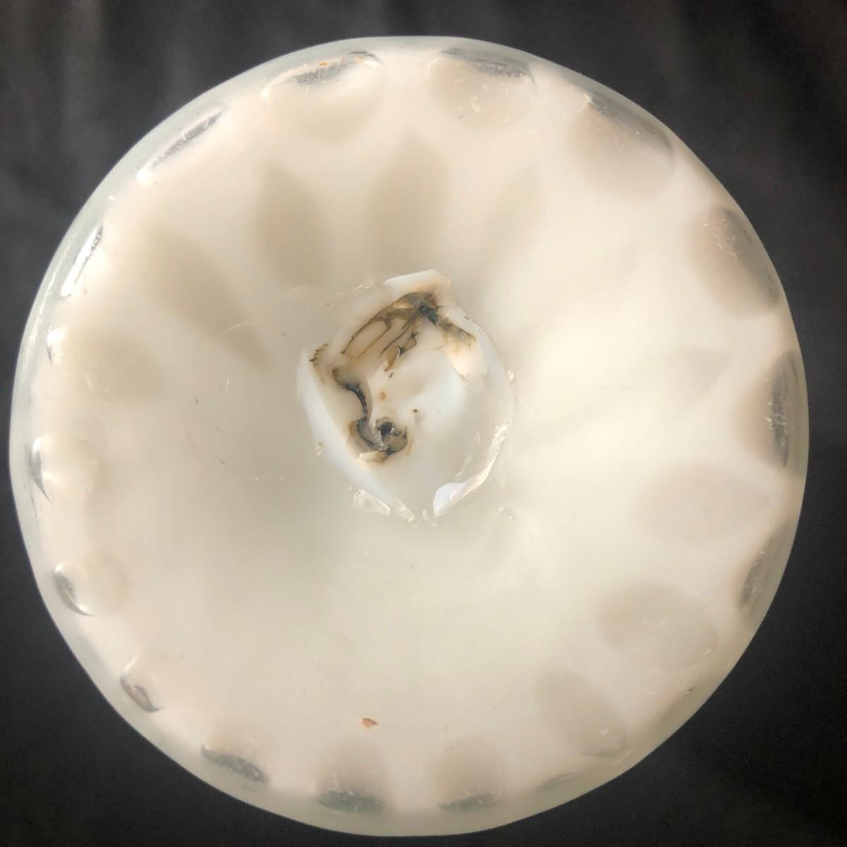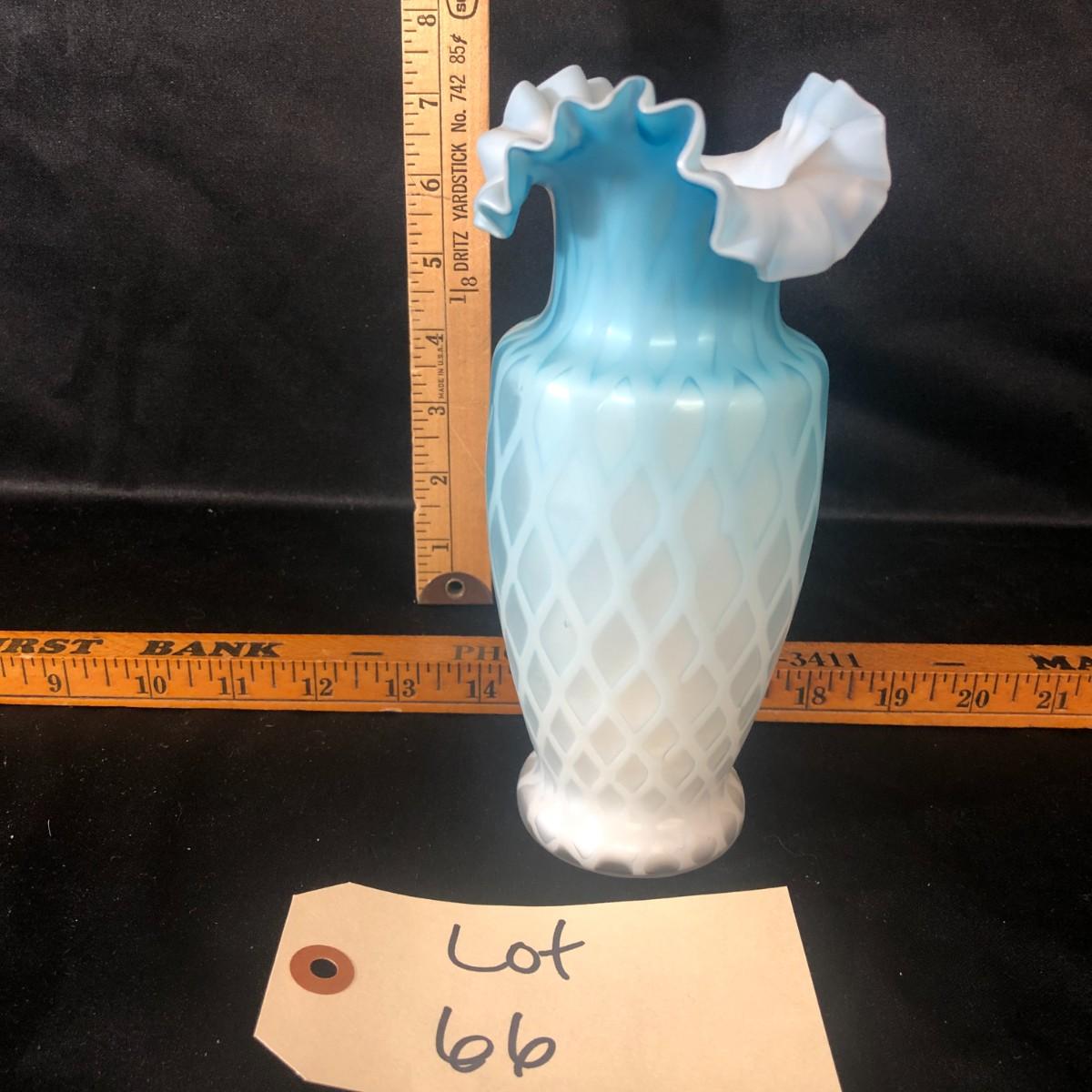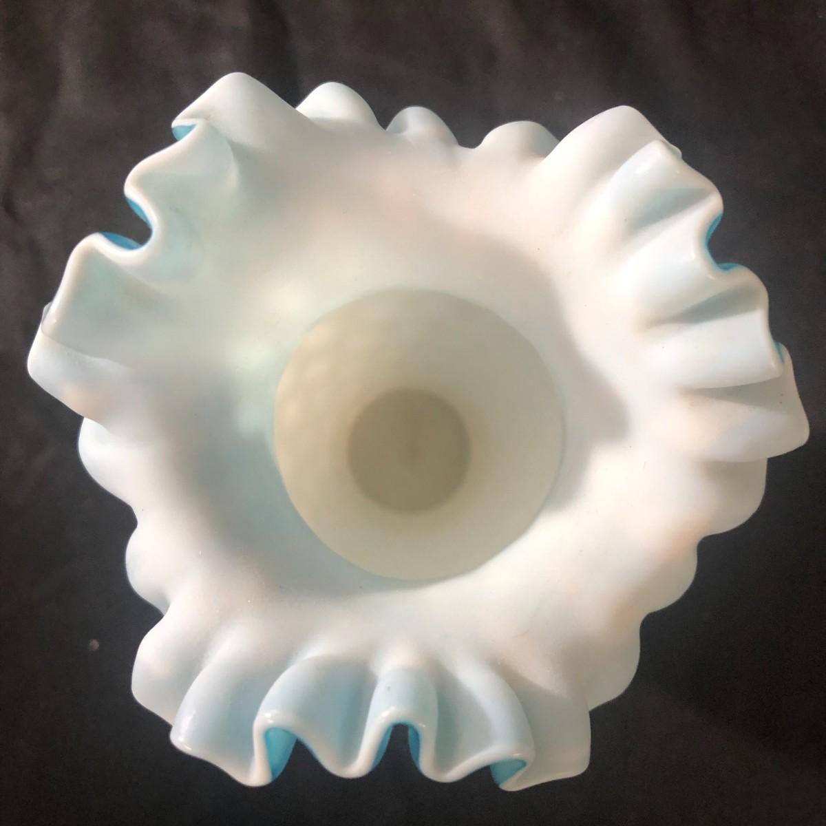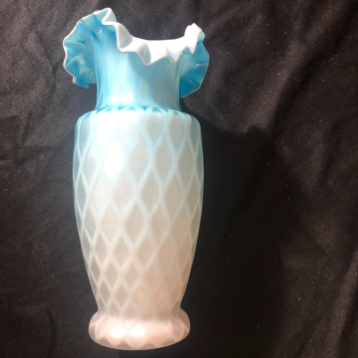 Fenton Blue Mother of Pearl Diamond Quilted Double Ruffled Satin Glass Vase