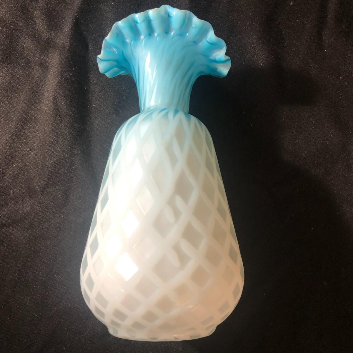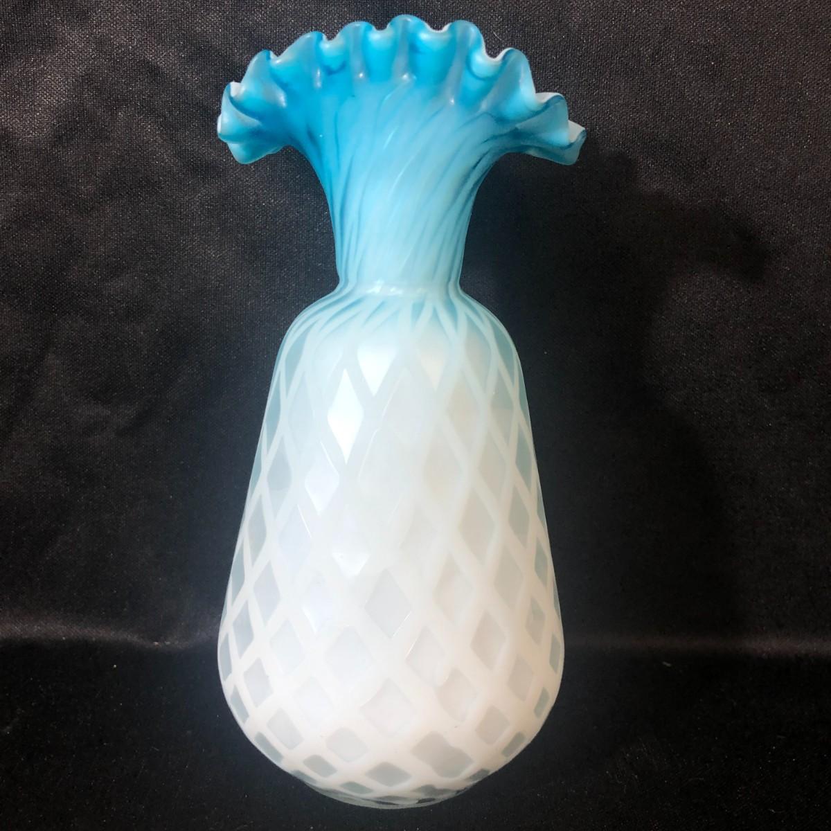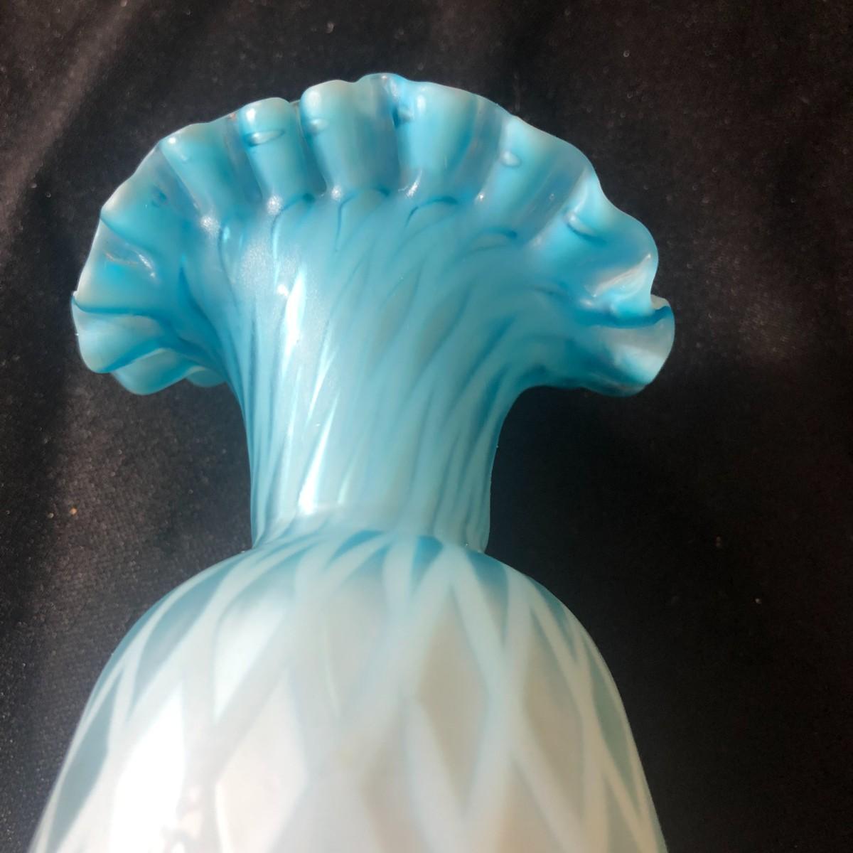 Fenton Blue Mother of Pearl Diamond Quilted Ruffled Satin Glass Vase