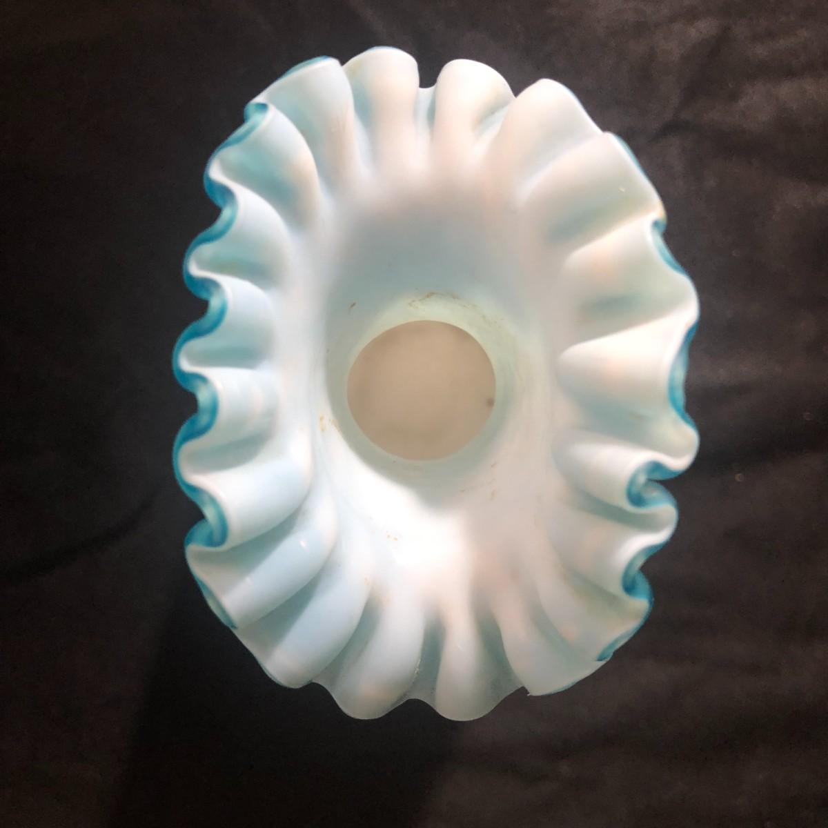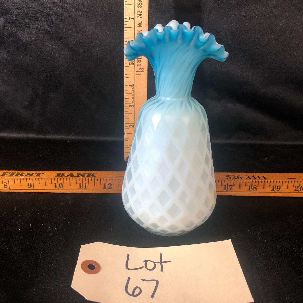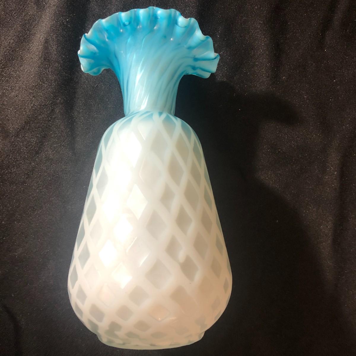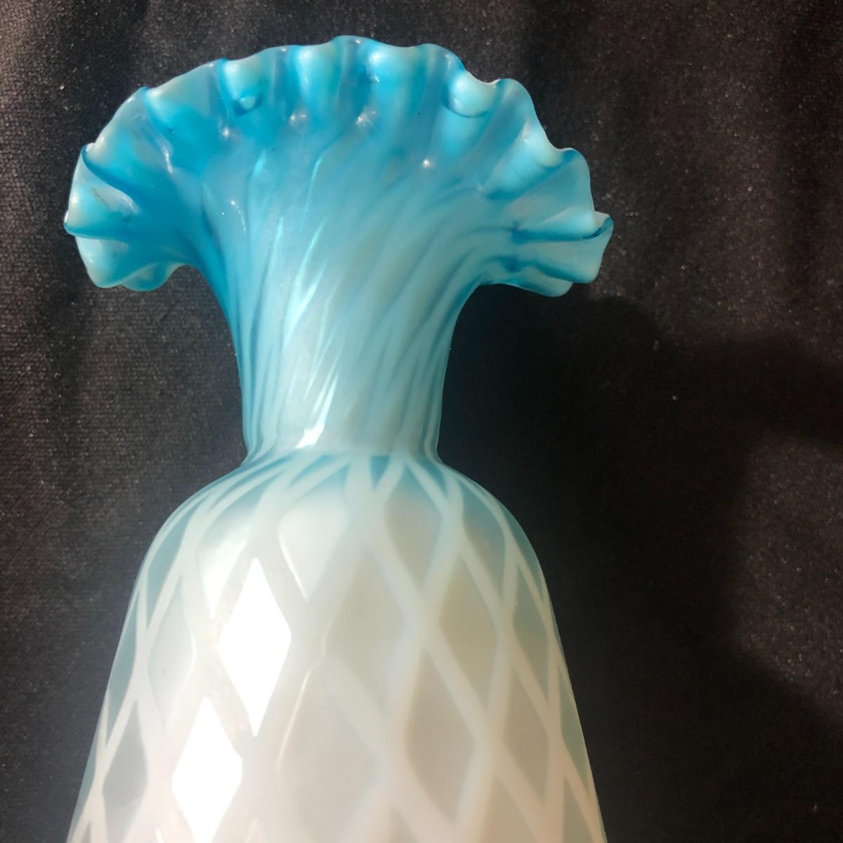 Fenton Blue Mother of Pearl Diamond Quilted Ruffled Satin Glass Vase