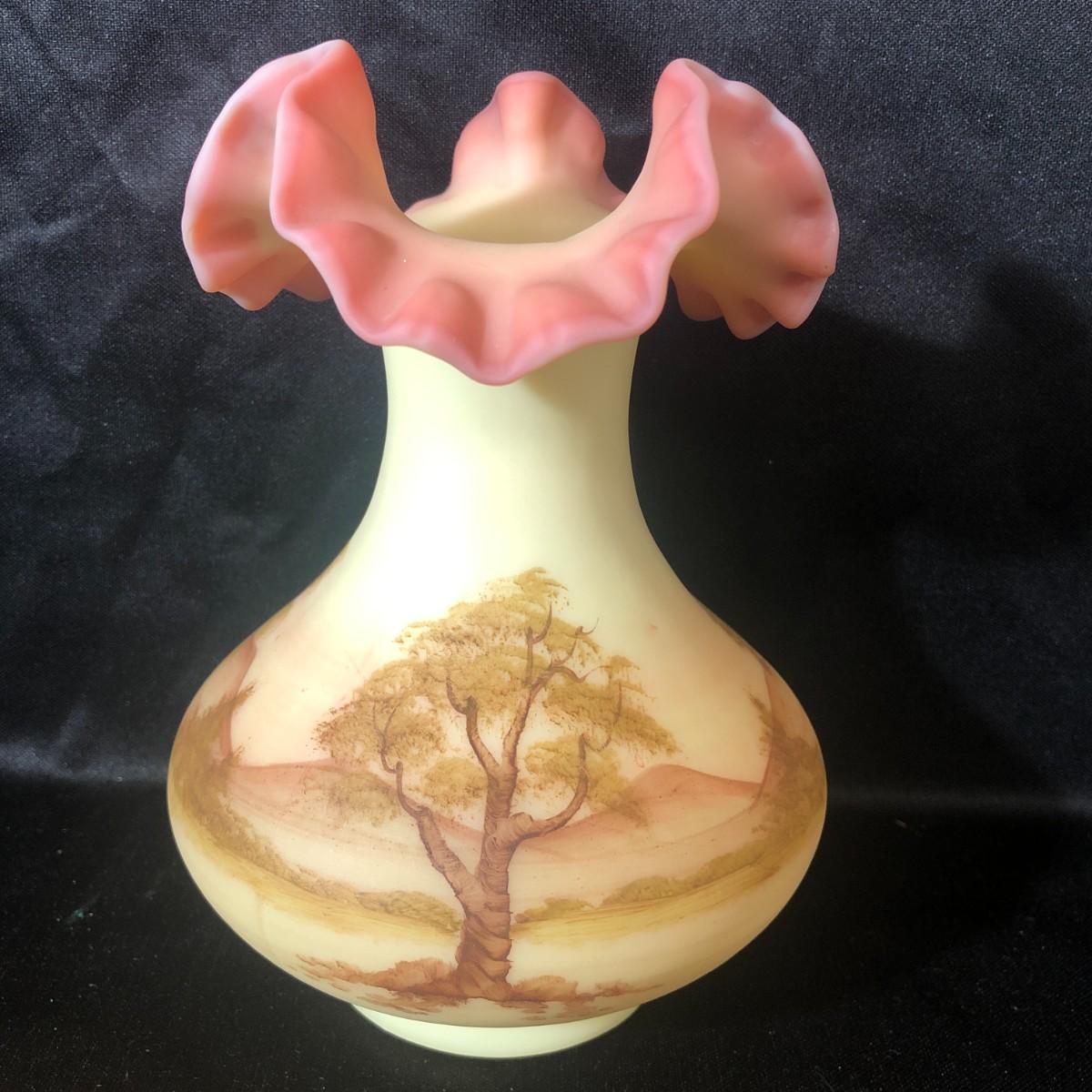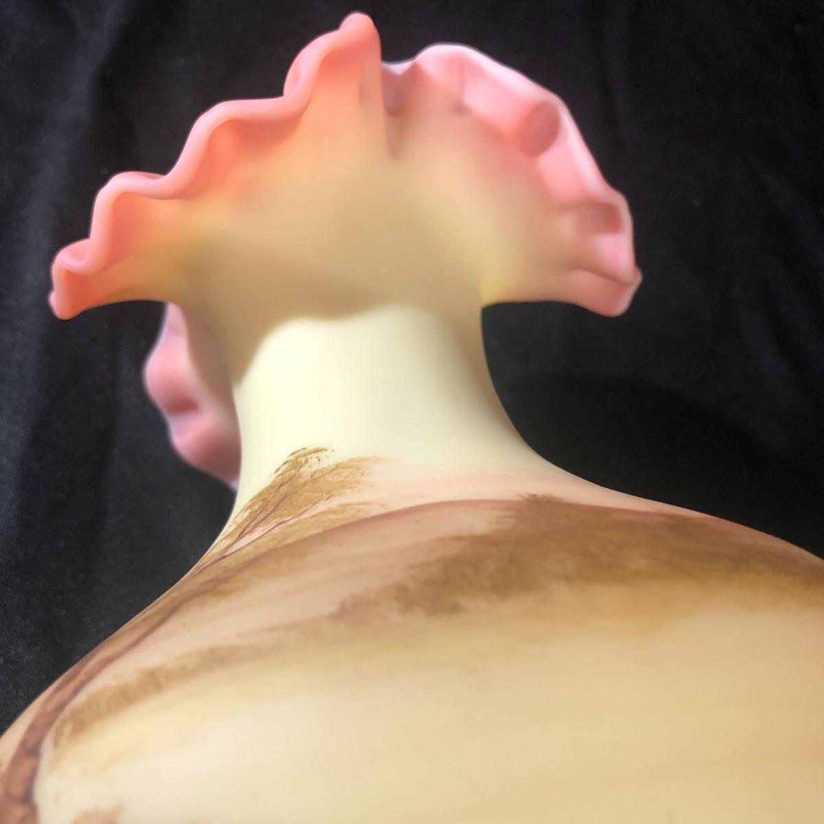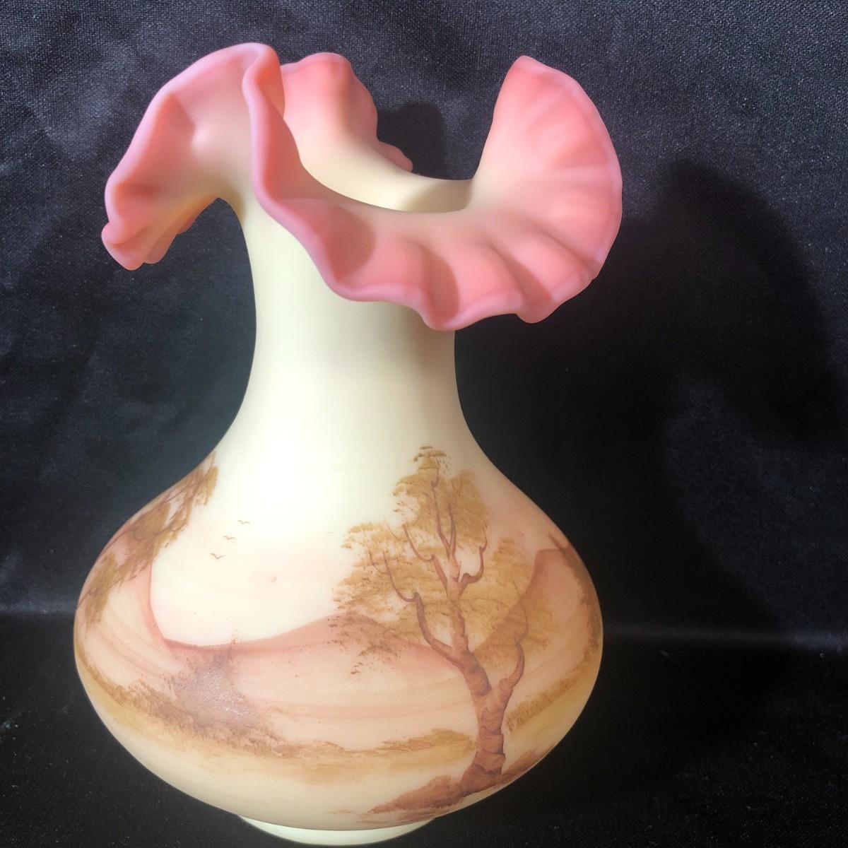 Fenton Hand Painted Burmese Vase Double Ruffled Edge