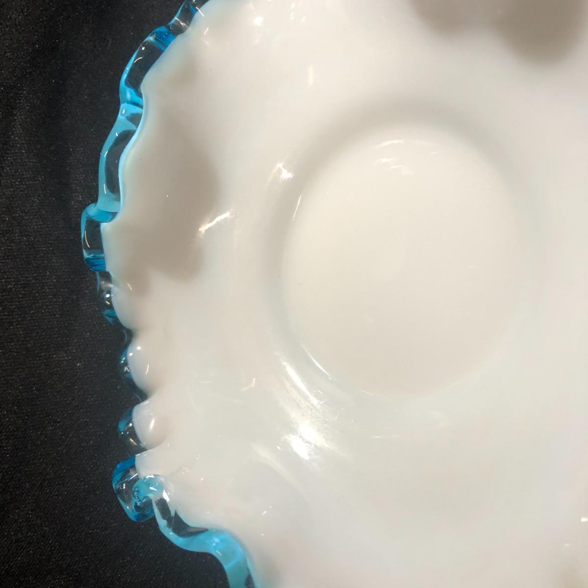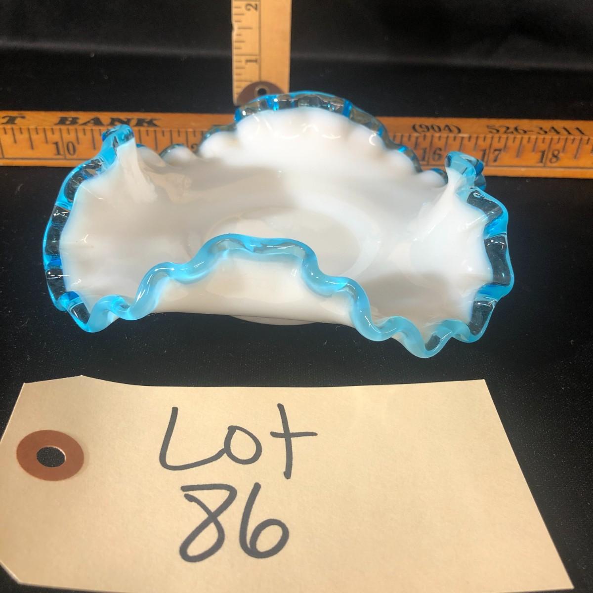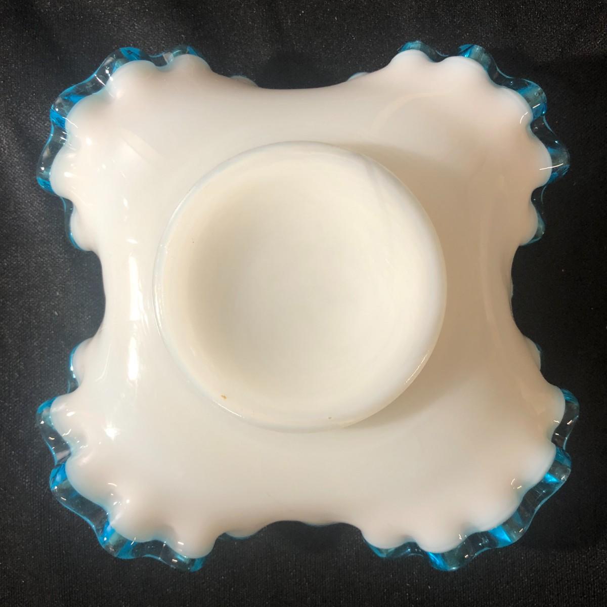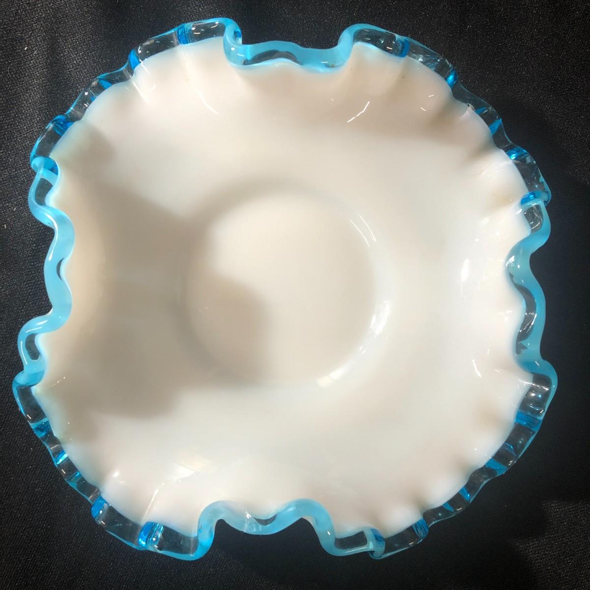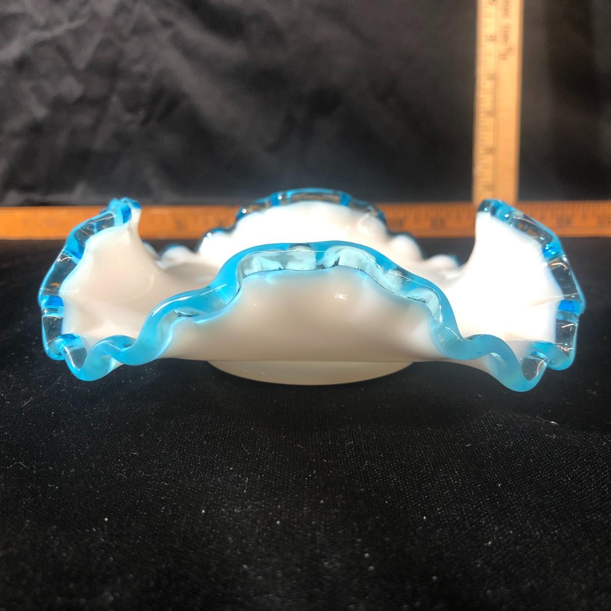Fenton White/Blue Rim Ruffled Candy/Trinket Dish