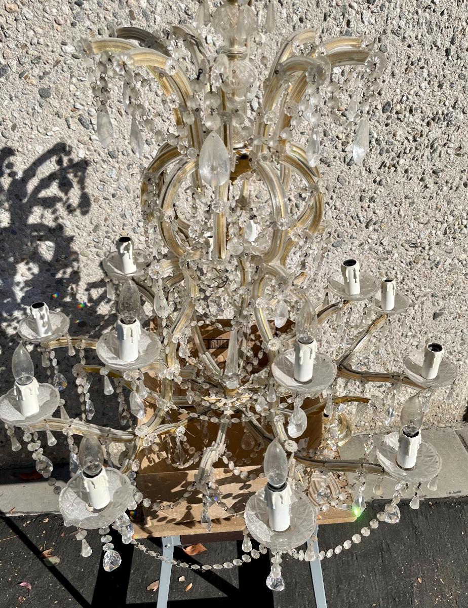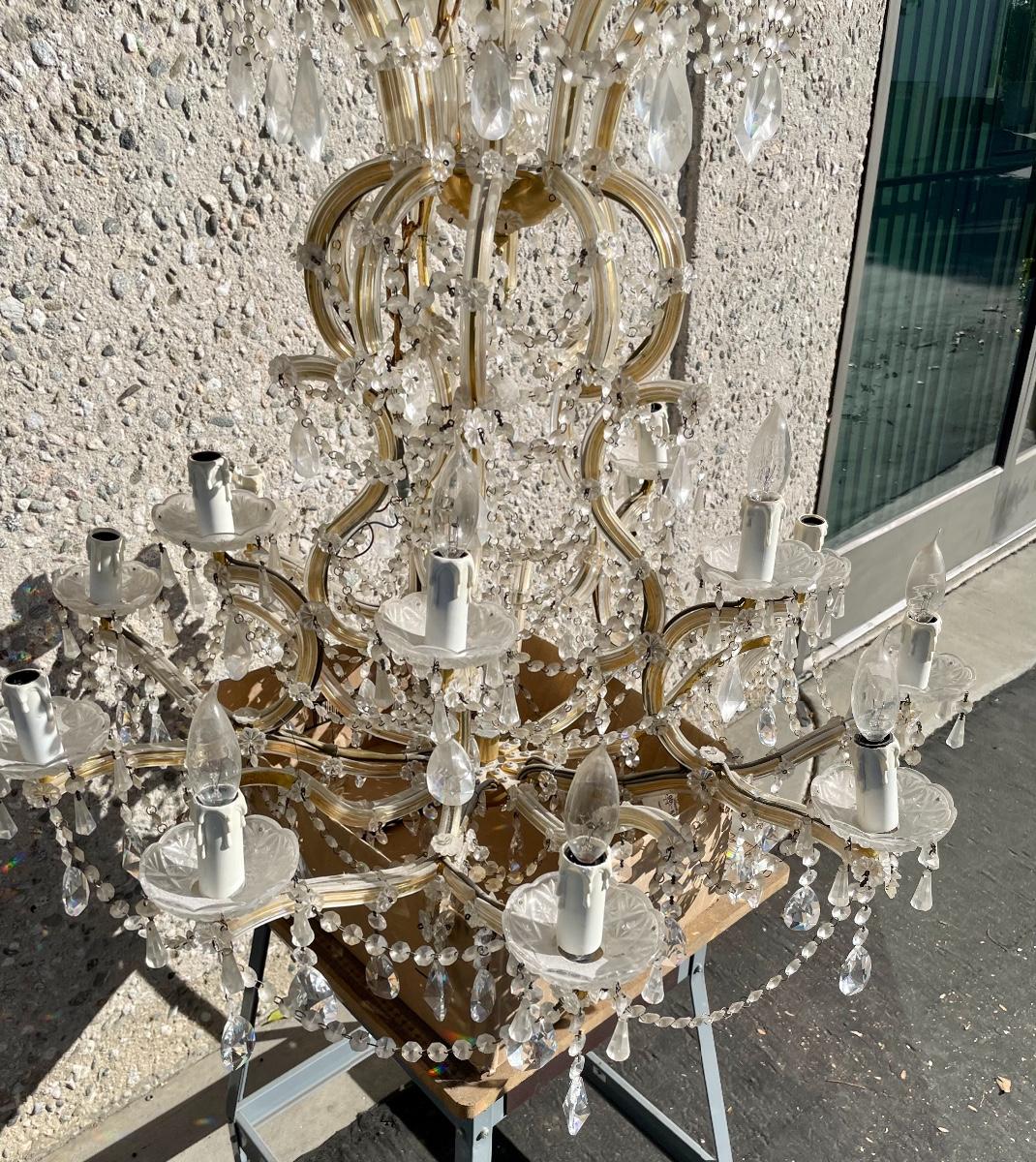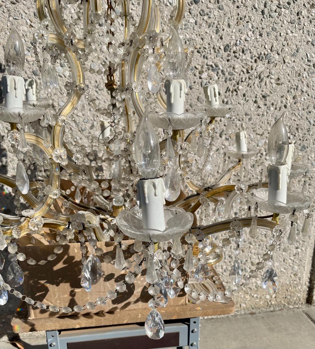 Large vintage chandelier with 15 lights on 2 tiers. There are 2 broken glass “drip trays”, the other 13 are undamaged. Some of the bead strings need repair. Approx 34” tall and 34” across.