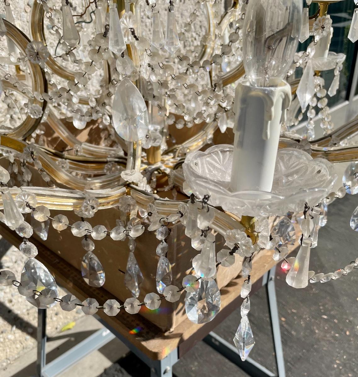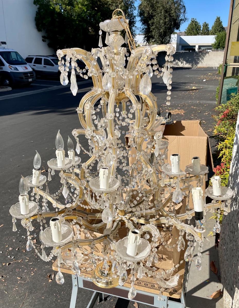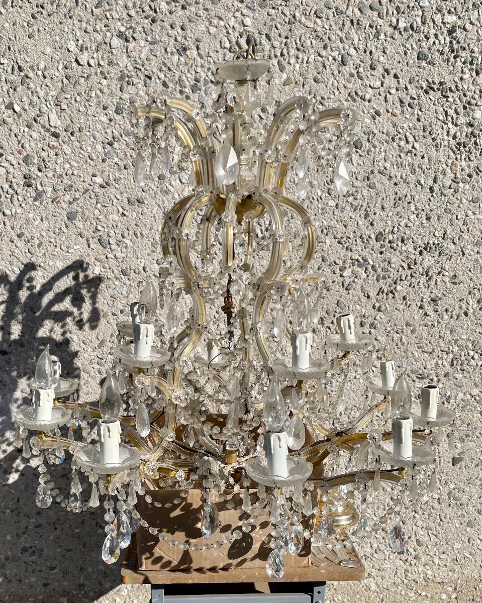 Large vintage chandelier with 15 lights on 2 tiers. There are 2 broken glass “drip trays”, the other 13 are undamaged. Some of the bead strings need repair. Approx 34” tall and 34” across.