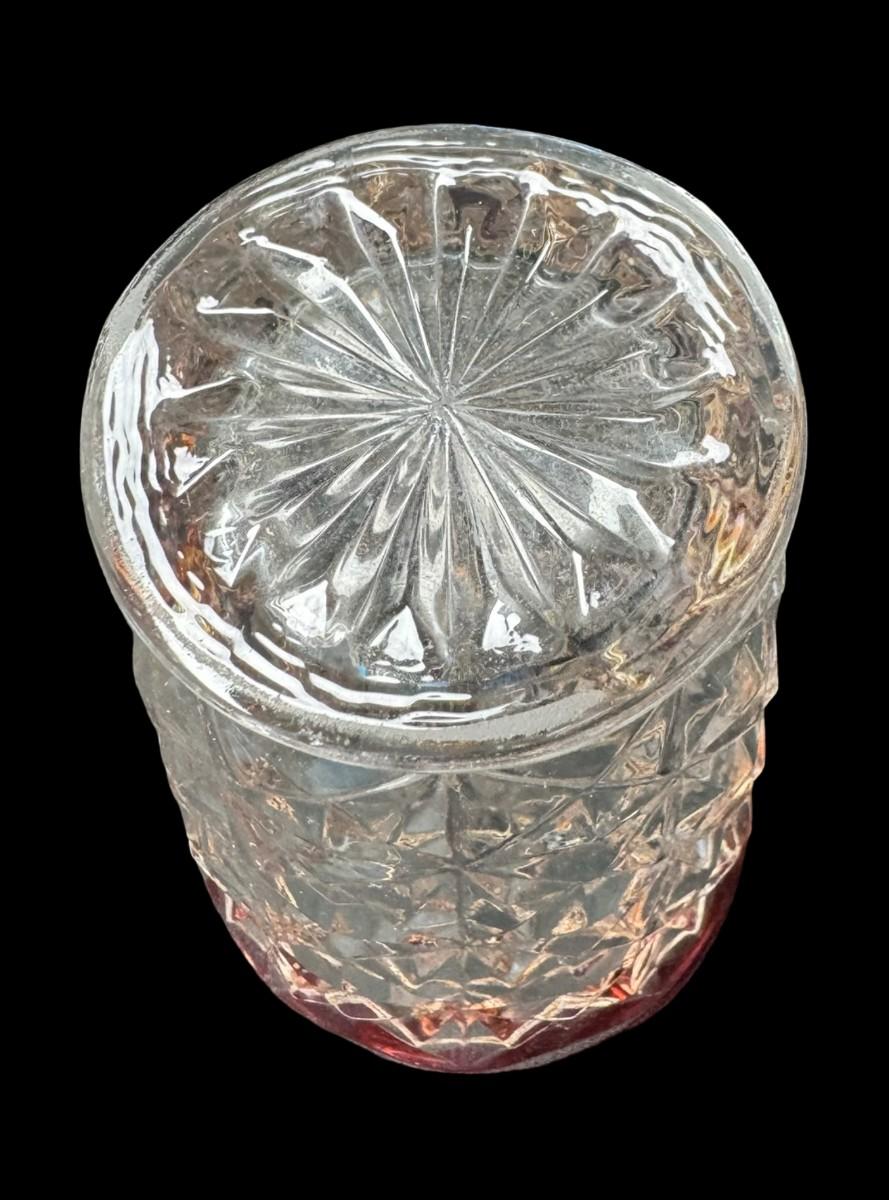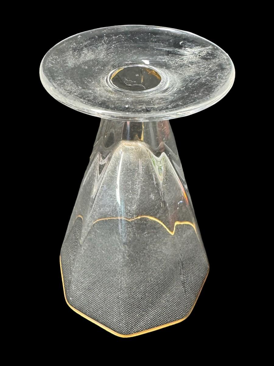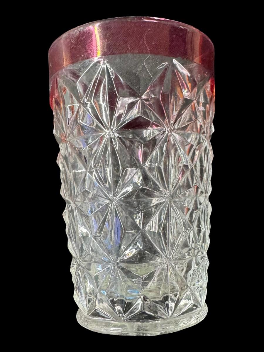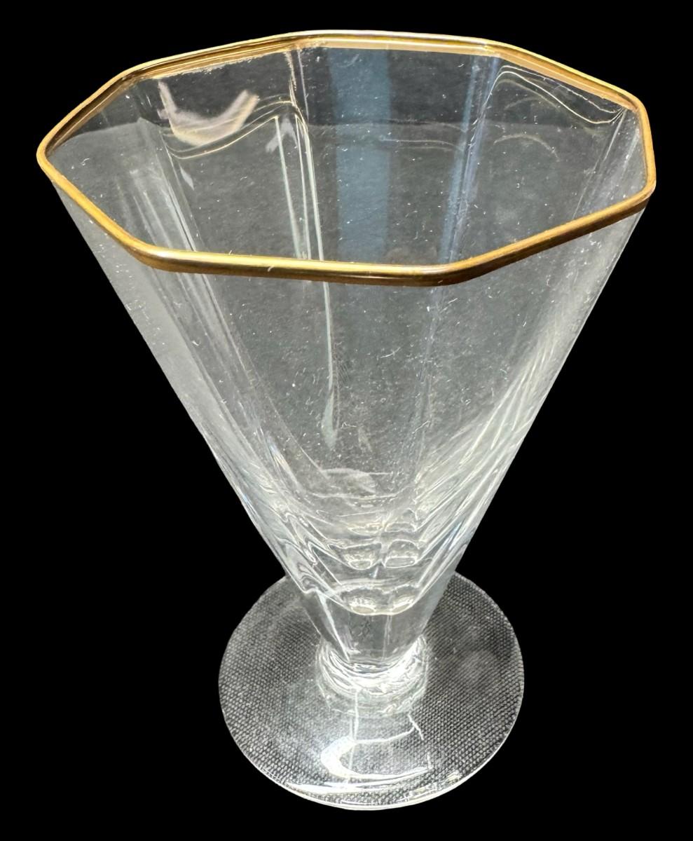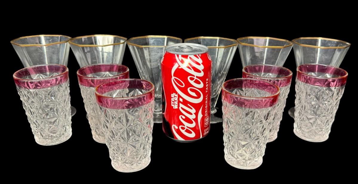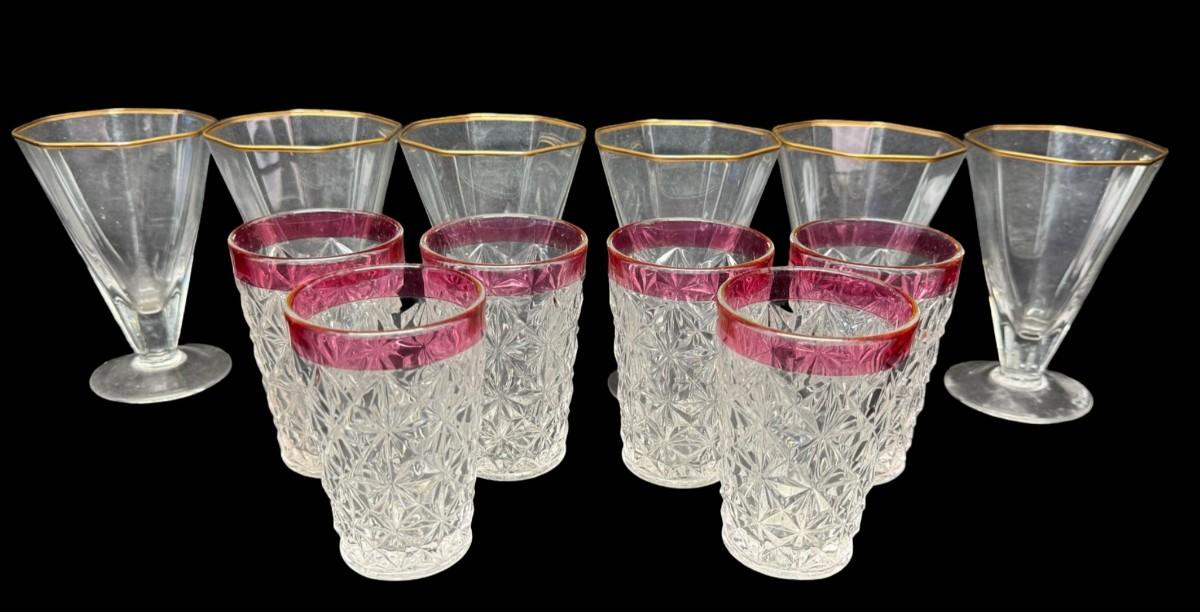 Includes six Kings Crown cranberry flash tumblers, and six octagon cocktail glasses with gold rims. Total of 12 pieces. Measurement of largest: 4.5”H. [MA]