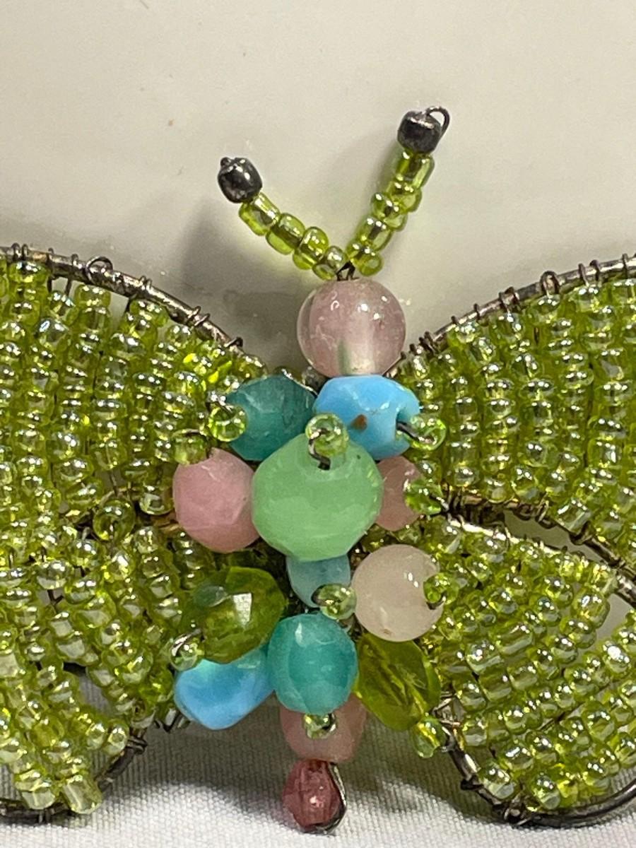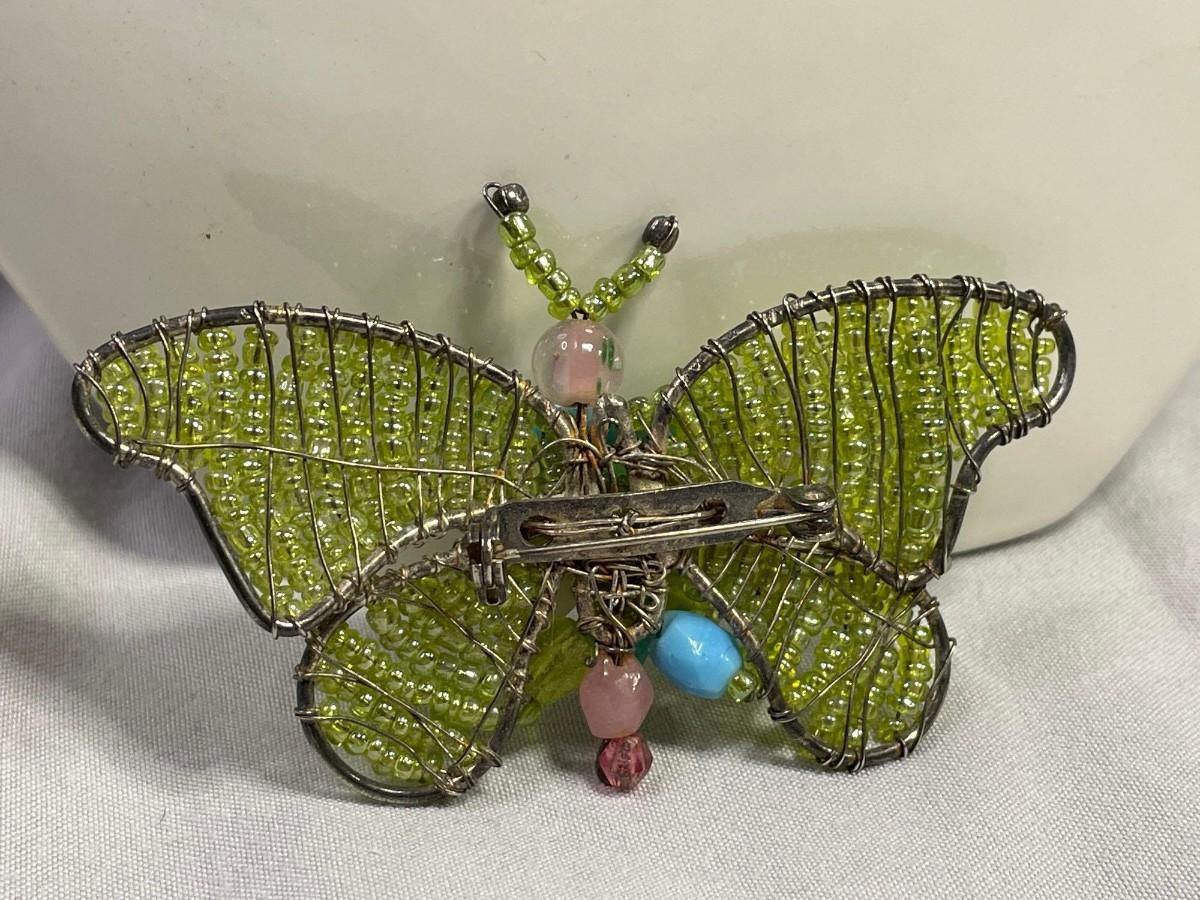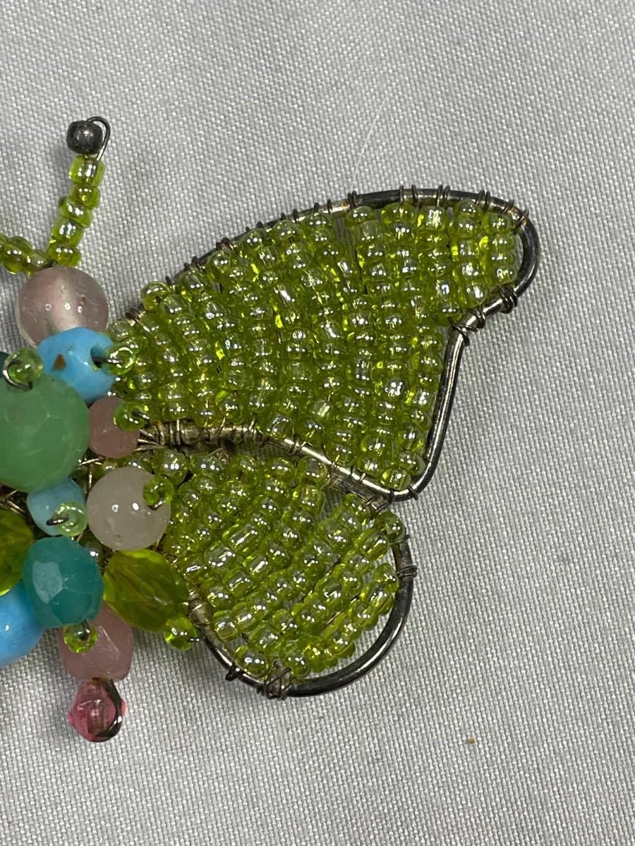 This butterfly brooch is made of glass beads strung on metal wires. It is about The exterior wire looks like it could be tarnished like silver, but I&#39;m not sure. The brooch is about 3 inches from wing tip to wing tip.<br />