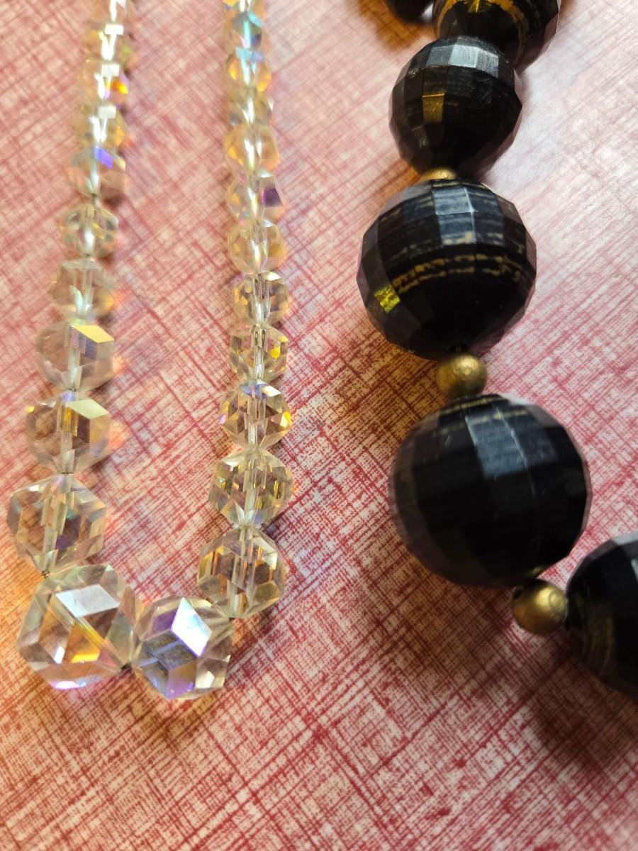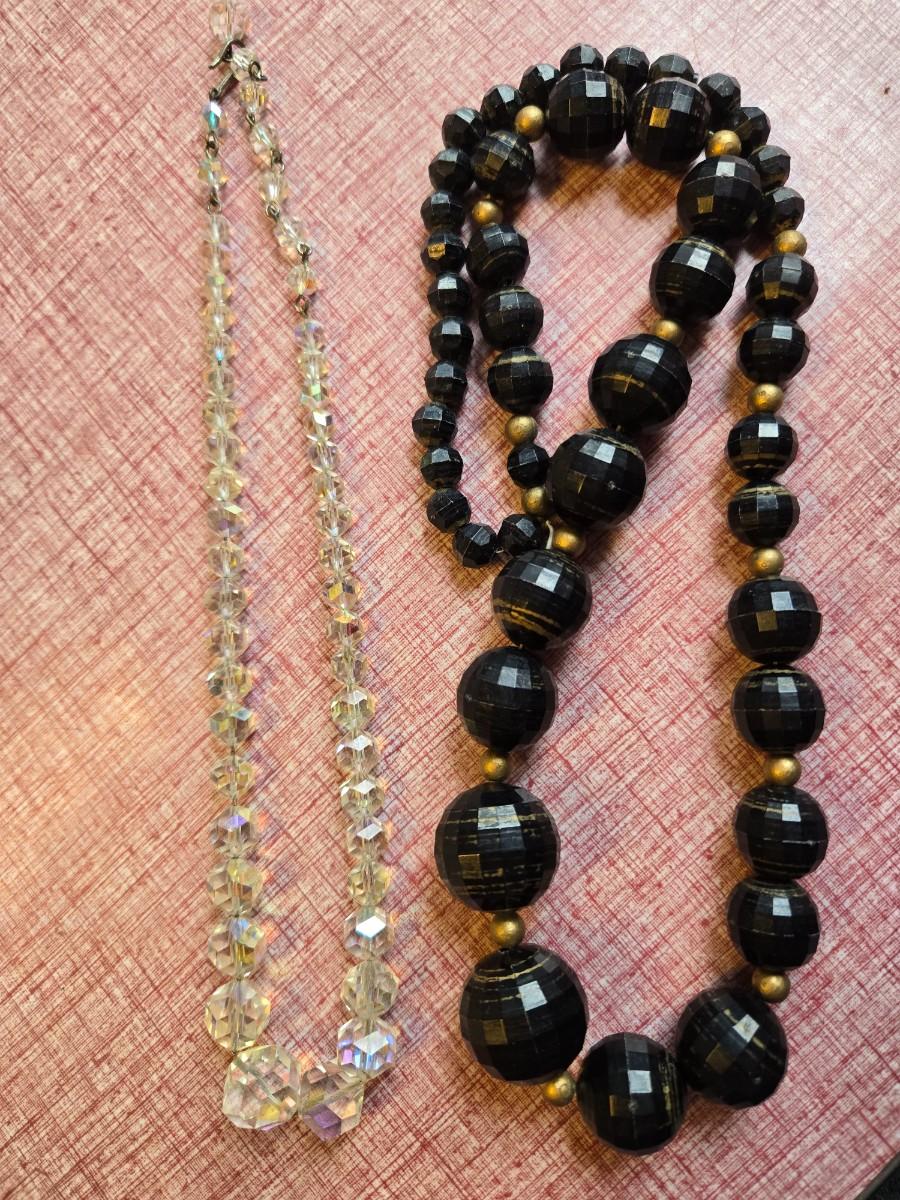 Shimmering multi faceted necklace is 18" total length metal threaded with a hook clasp. Black is 24" total lengthfabric threaded slip over, no clasp.