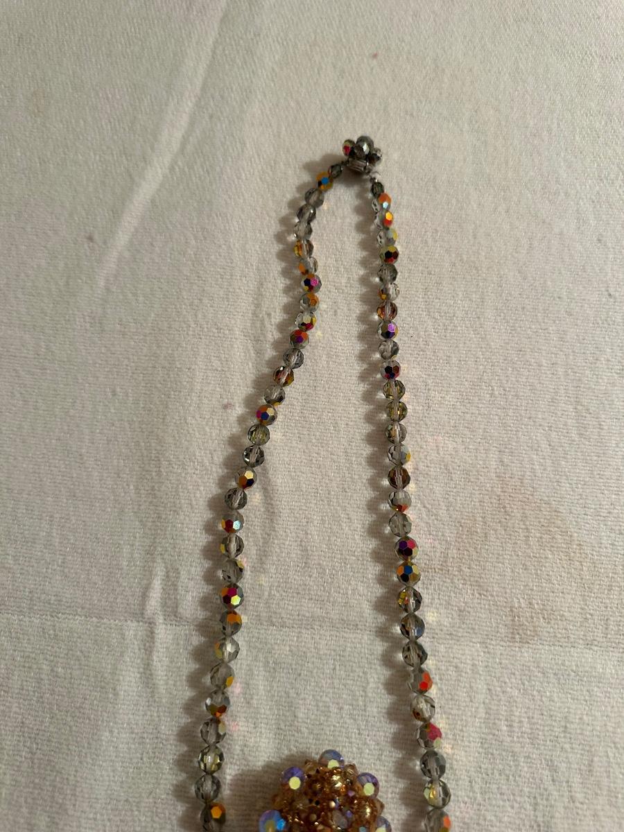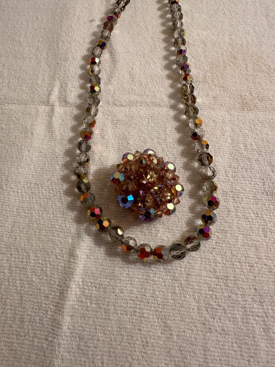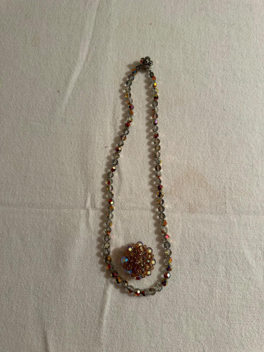 VINTAGE GLASS BEADED AURORA BOREALIS NECKLACE AND PIN