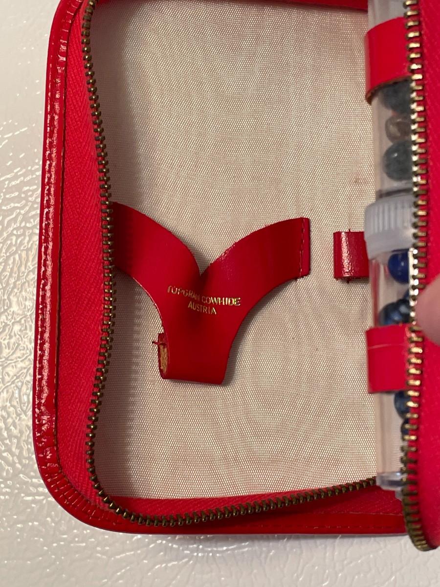 The case was made in Austria and of cowhide. The zipper works smoothly and the beads are glass and primarily from pieces of broken vintage jewelry.