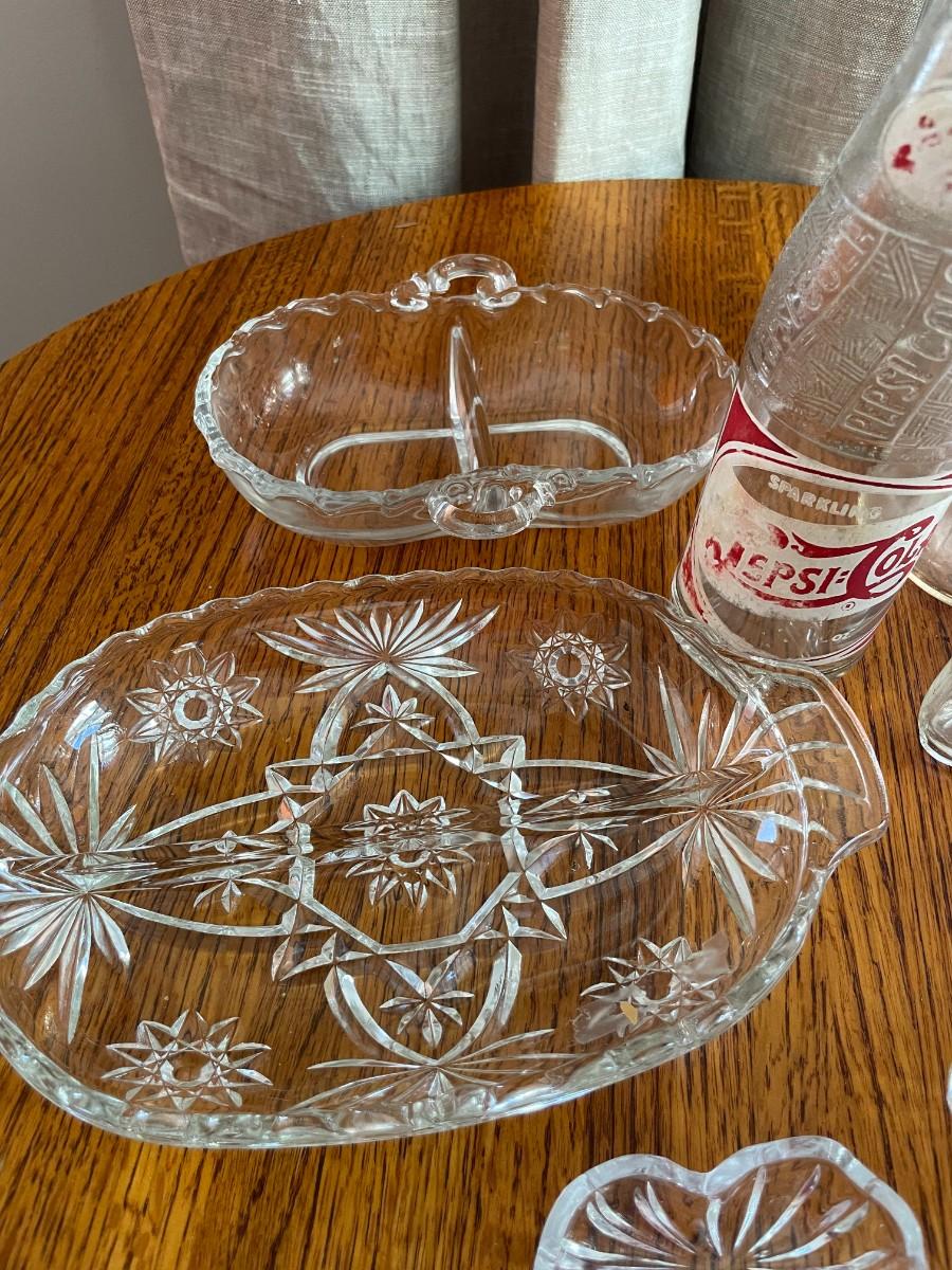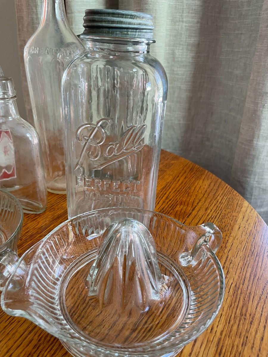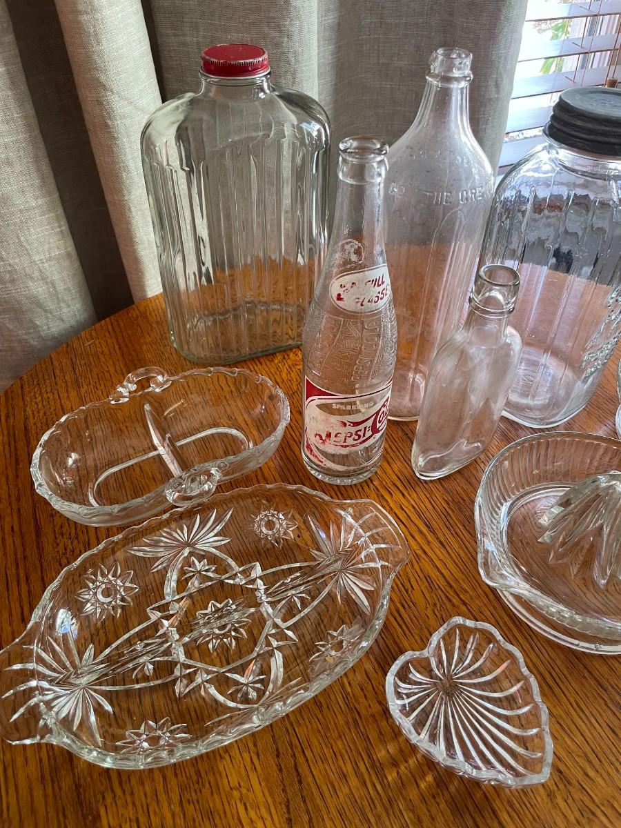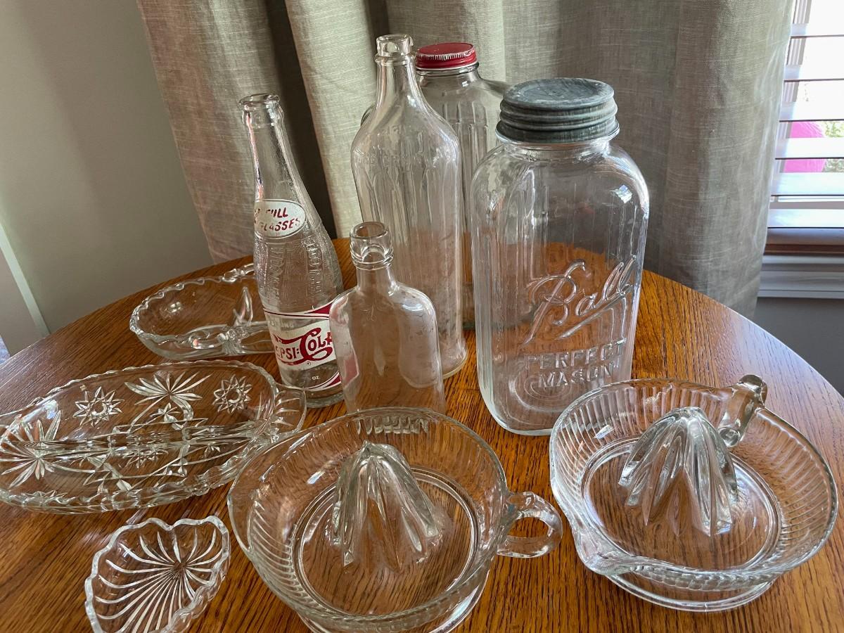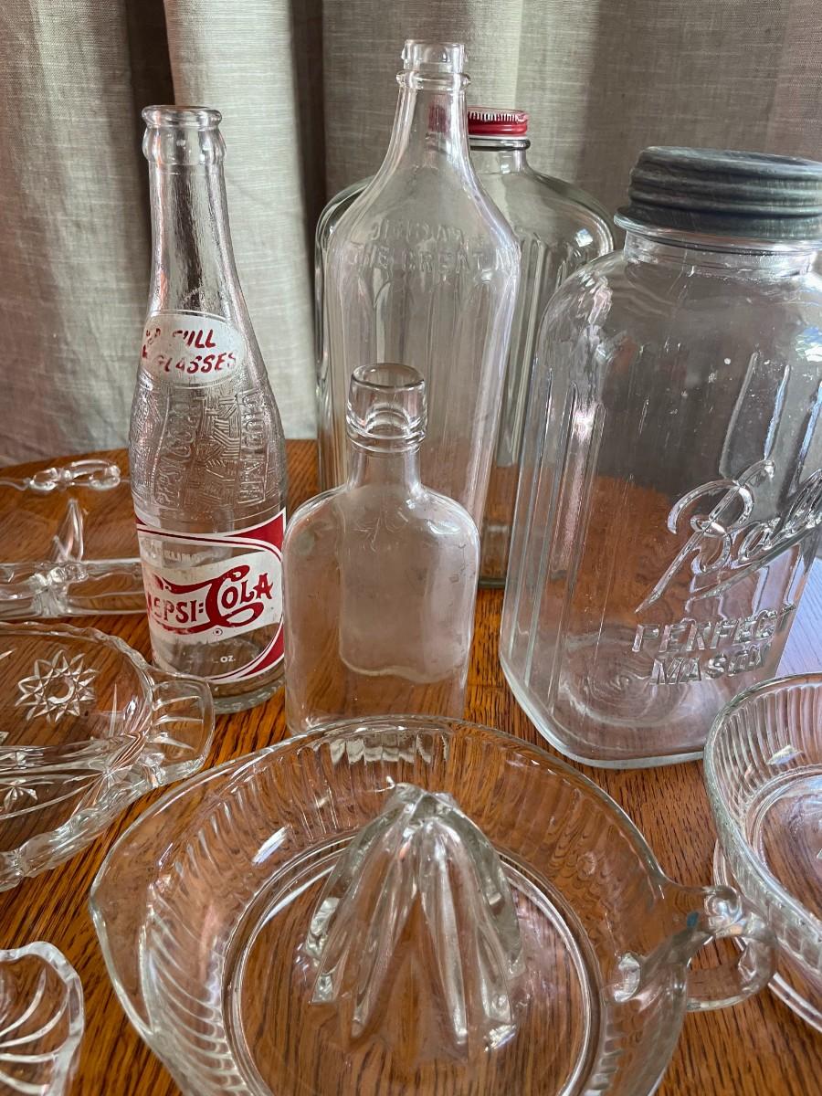 1 Ball Jar, 1 Pepsi-Cola Bottle, 2 relish dishes, 2 glass juicers, Vintage Anchor Hocking Juice Bottle, Pacific Tea Co. Bottle, 1 additional small bottle, 1 heart shaped small glass dish