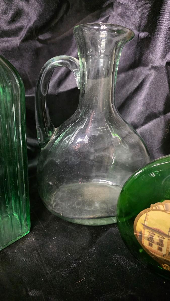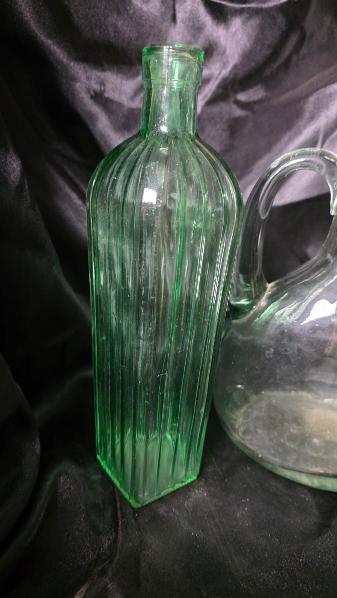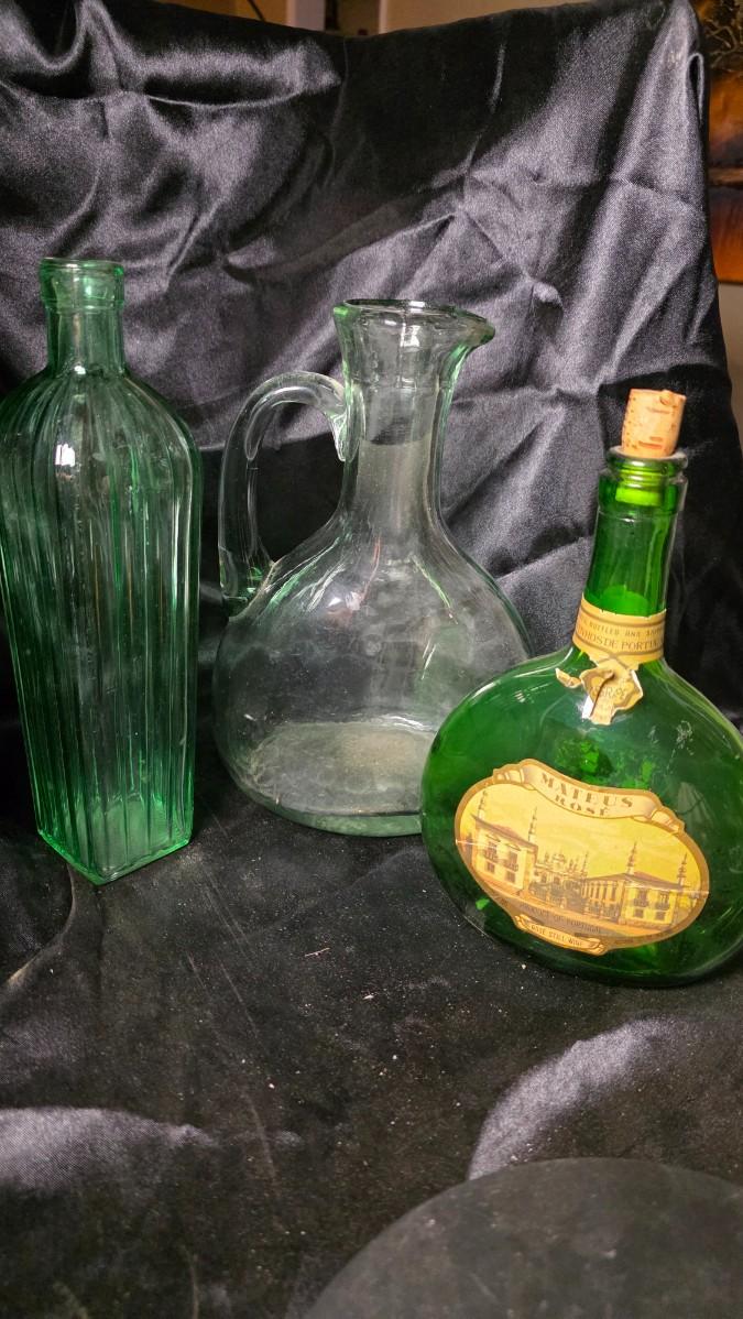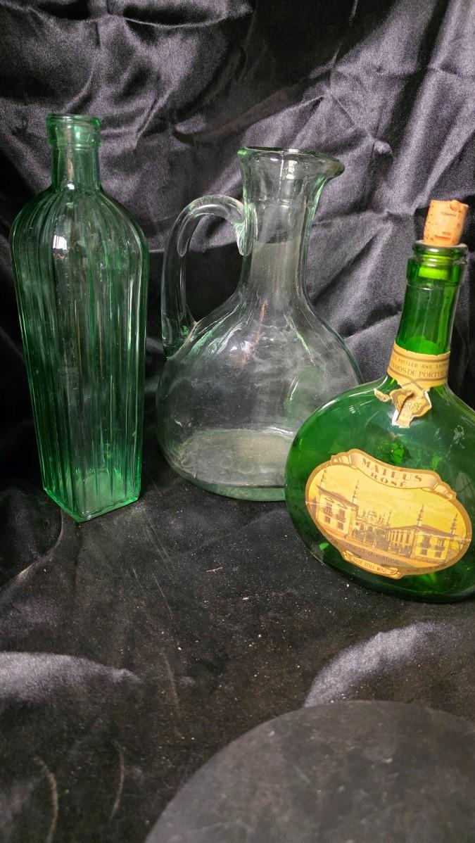 Vintage Glass Bottle Collection – Ribbed Apothecary Style Bottle, Handled Carafe, and Mateus Rosé Bocksbeutel – Timeless Decorative Trio