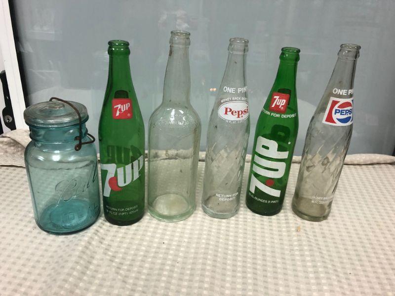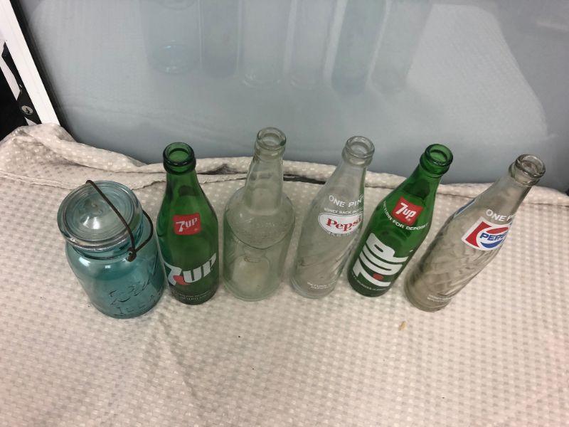 Vintage glass bottle lot. Old glass soda bottles and a blue mason jar. Vintage conditions, need to be clean. Great for display or projects.