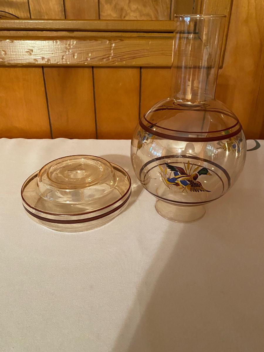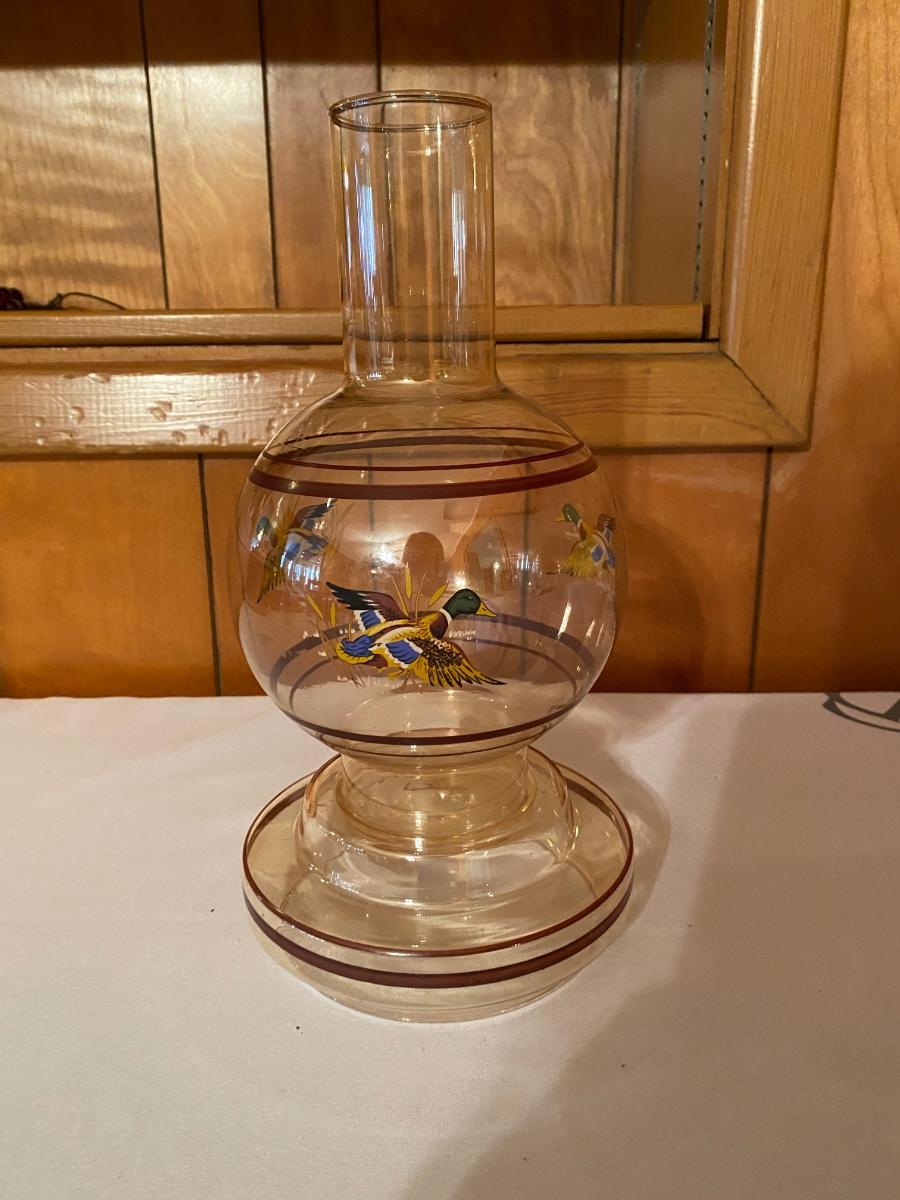 Vintage hurricane-style glass candle holder with duck decals. Two parts, approx 12-1/2”h x 7” across. Excellent condition.