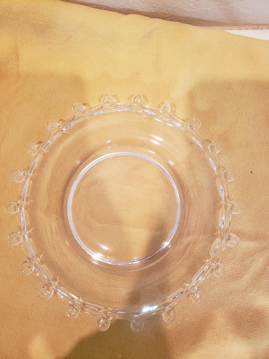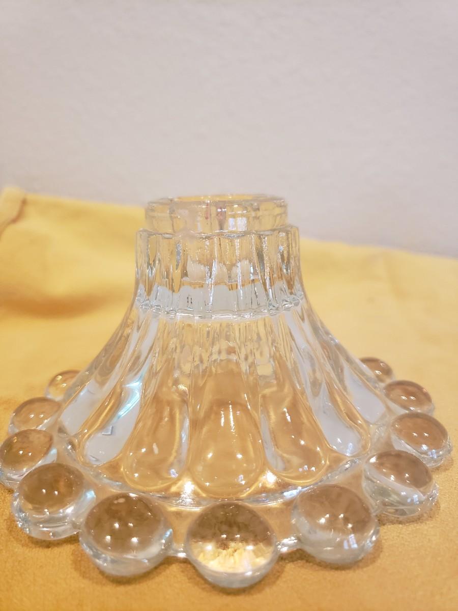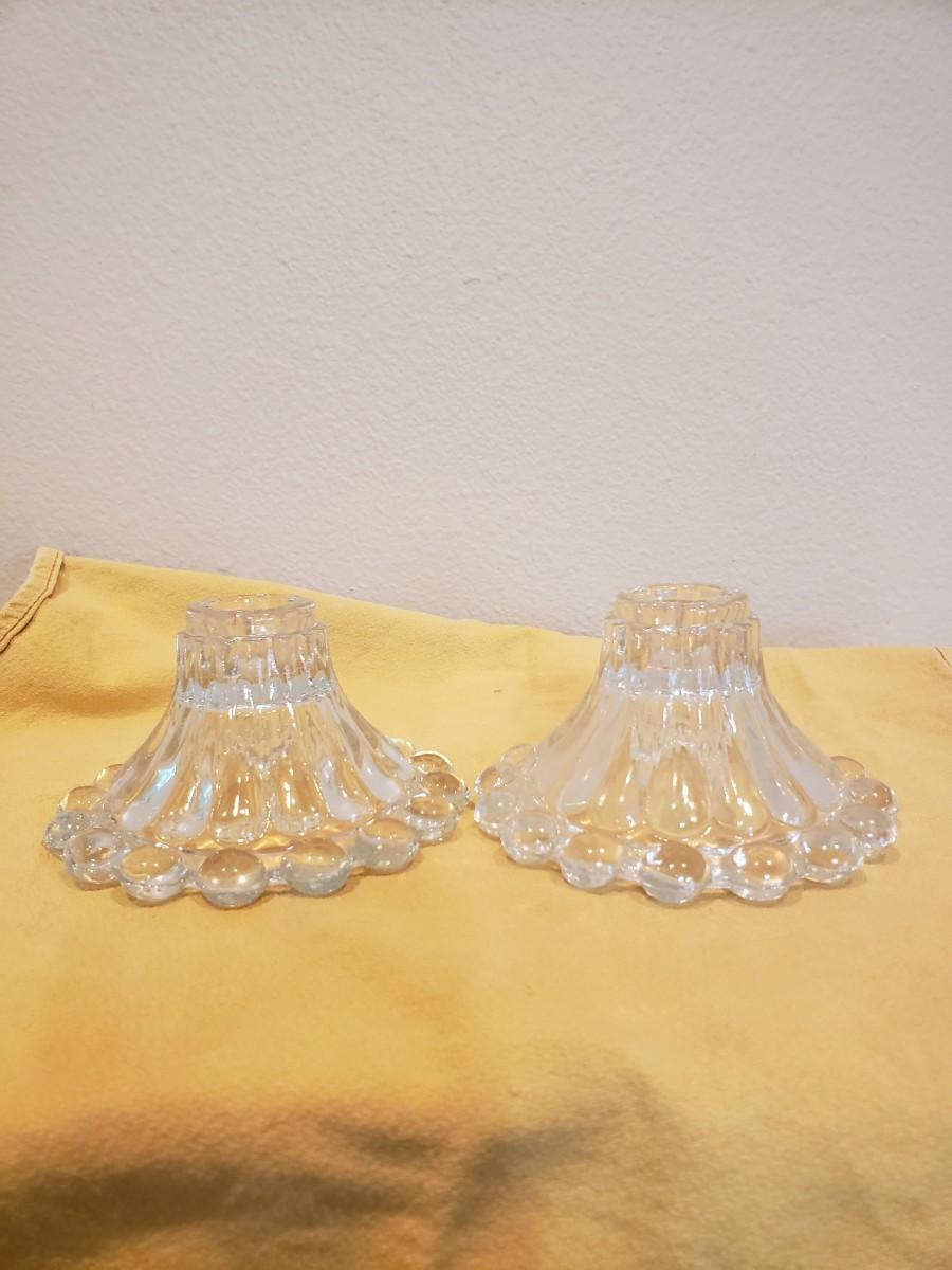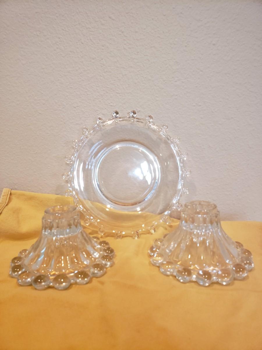 Vintage pair of Anchor Hocking "Boopie" clear glass candlesticks and Heisey Glass Lariat salad plate.