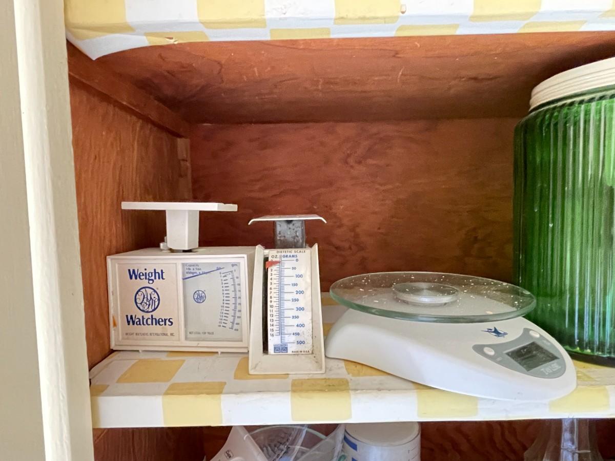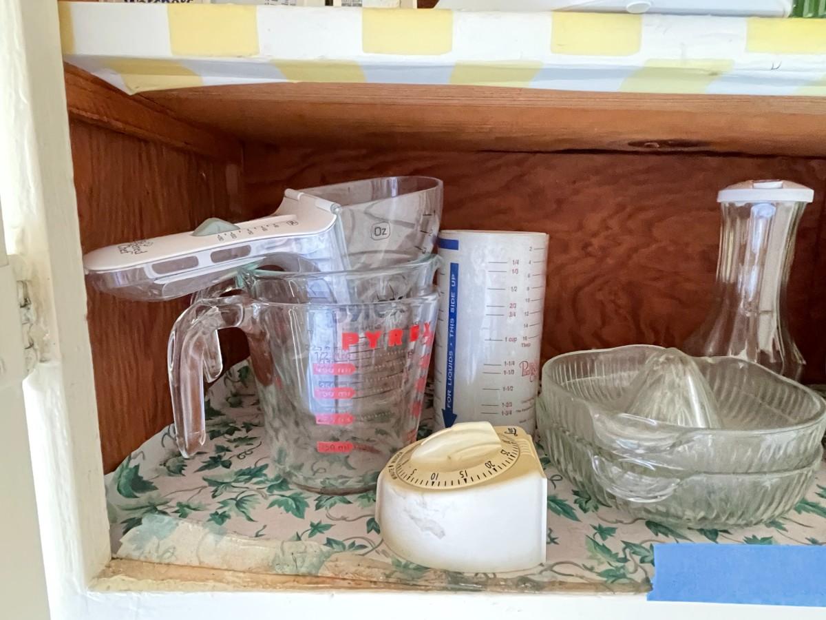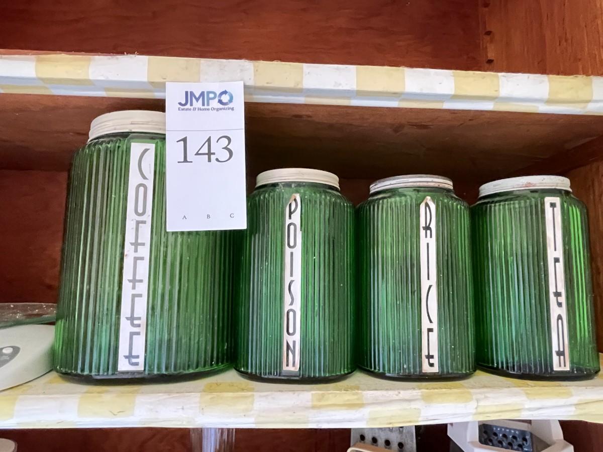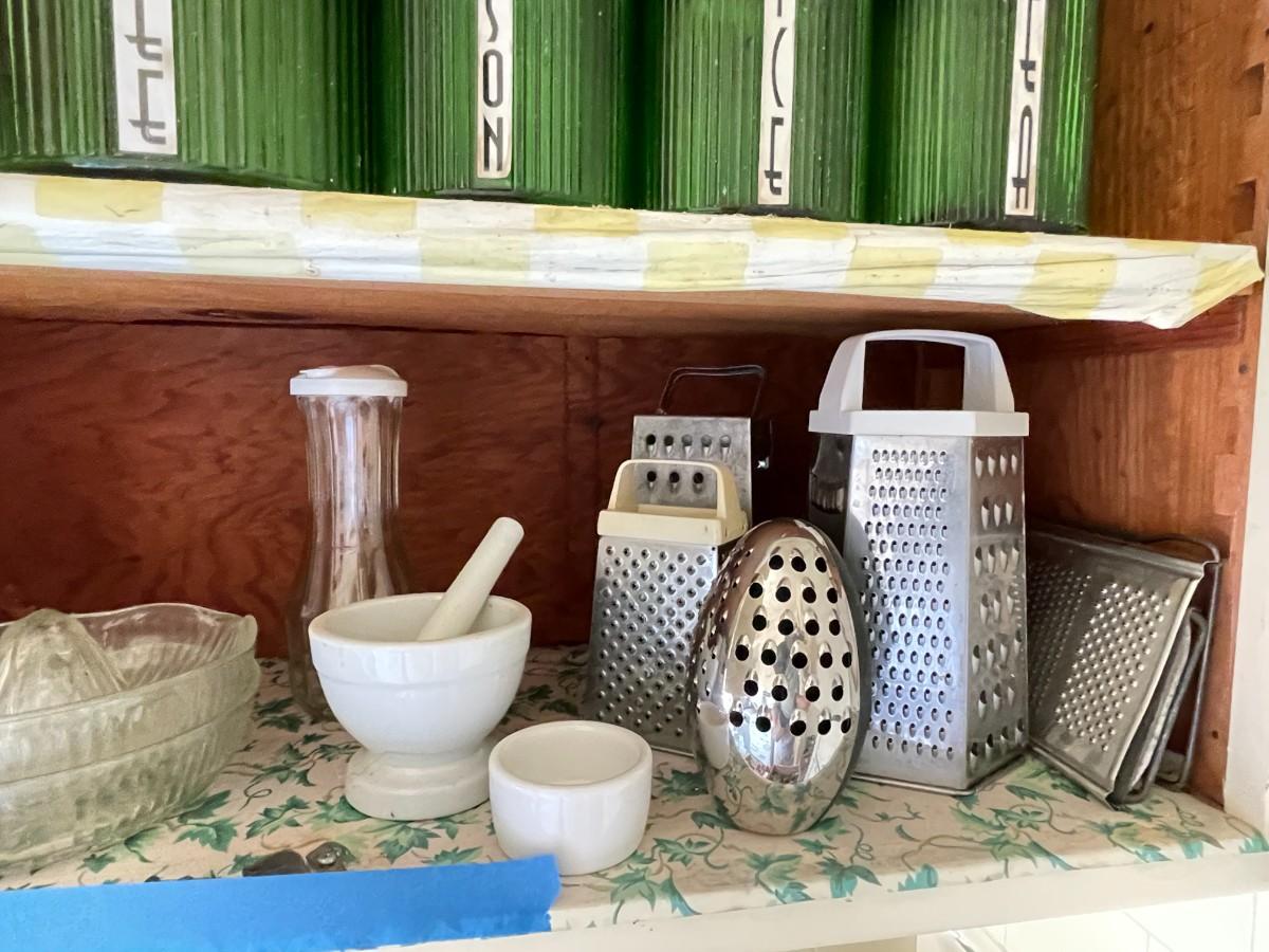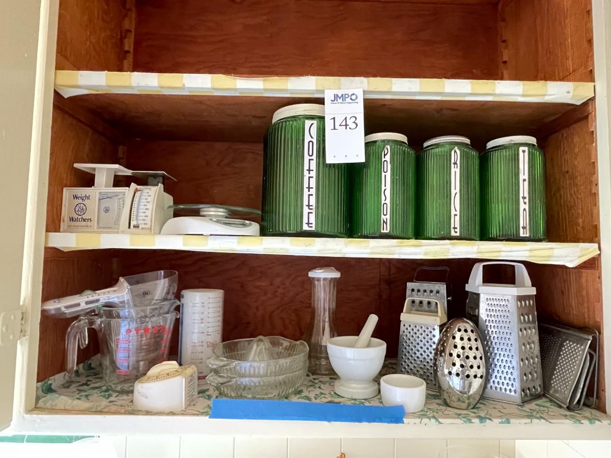 4 green glass canisters with lids. Kitchen scales, Measuring cups, graters, reamers and more as shown