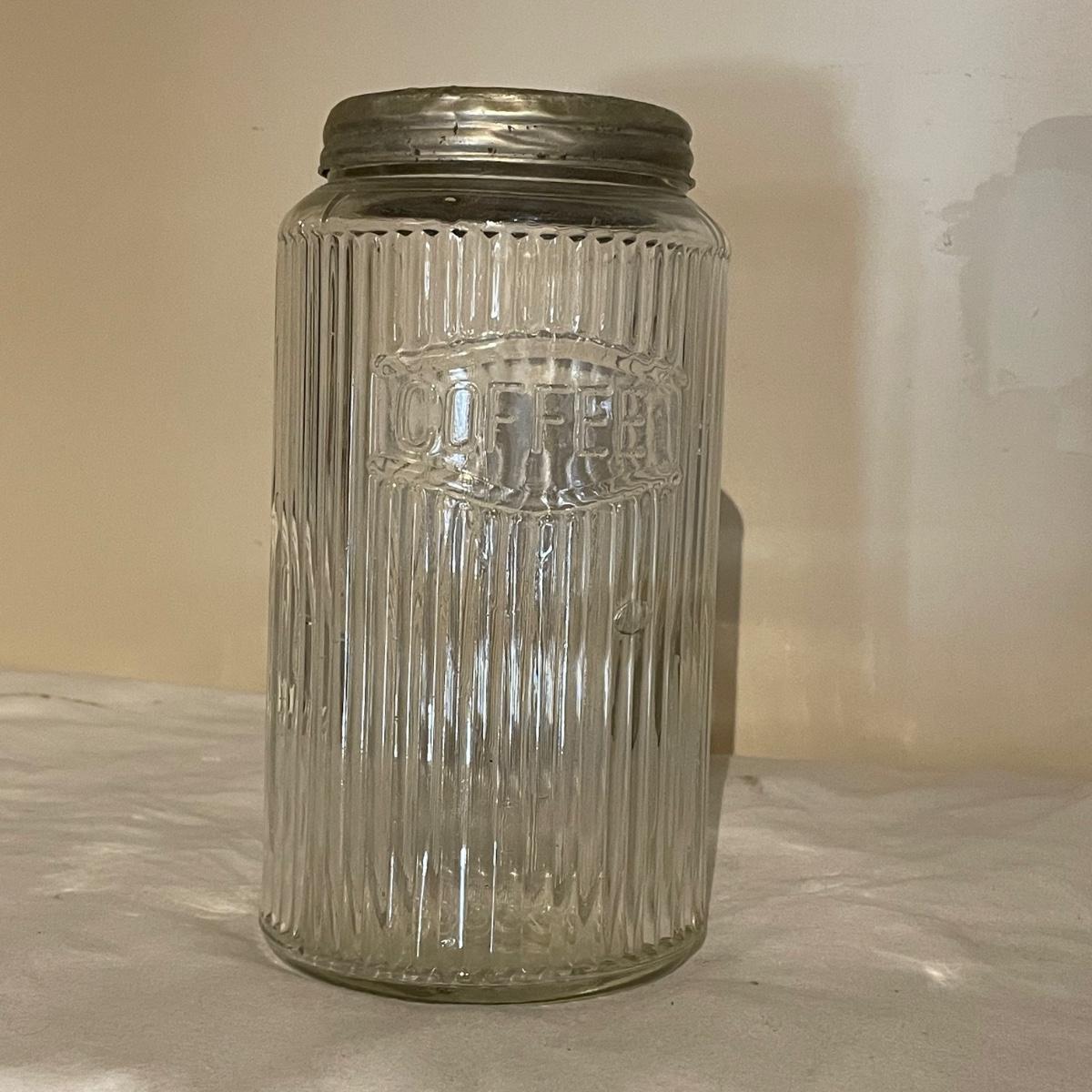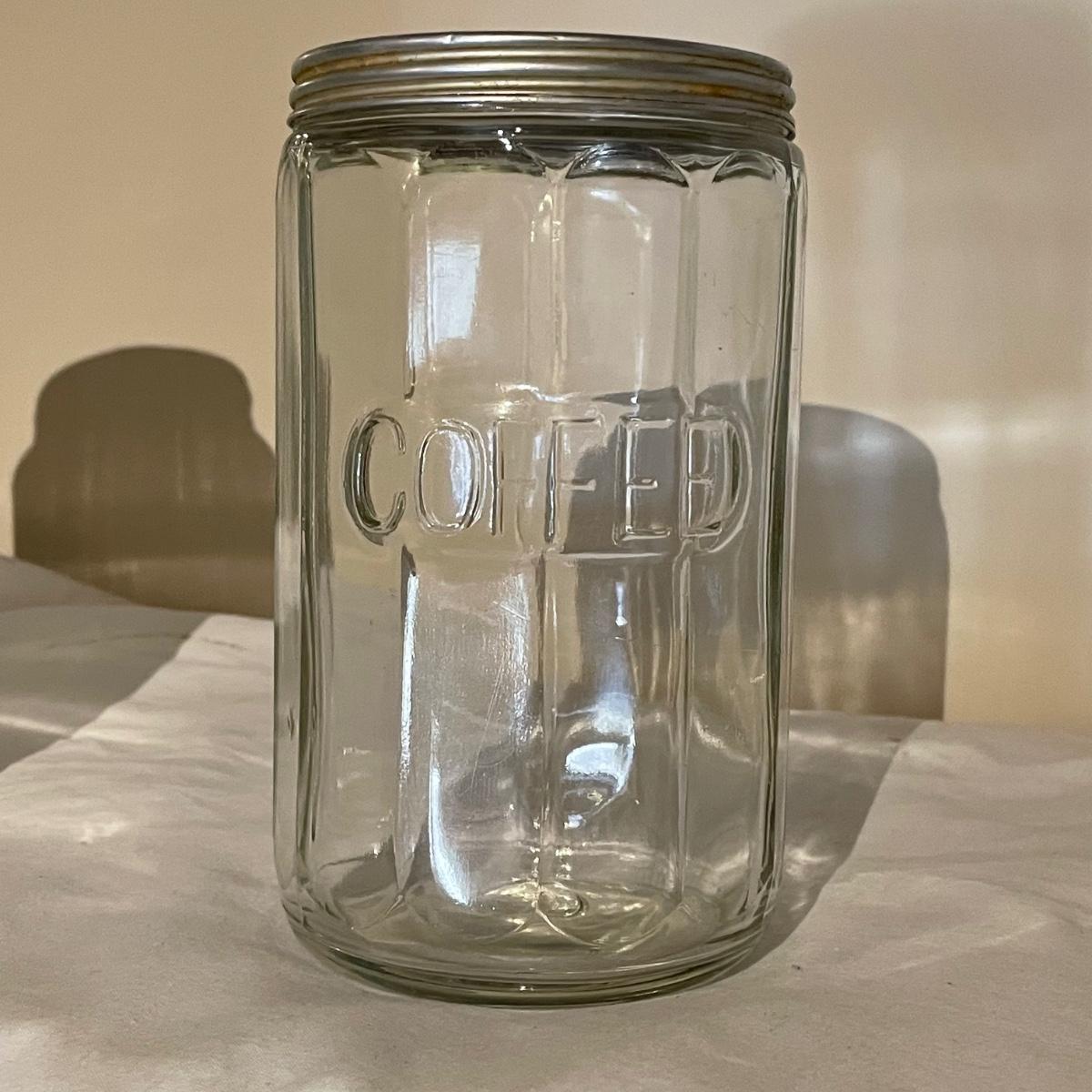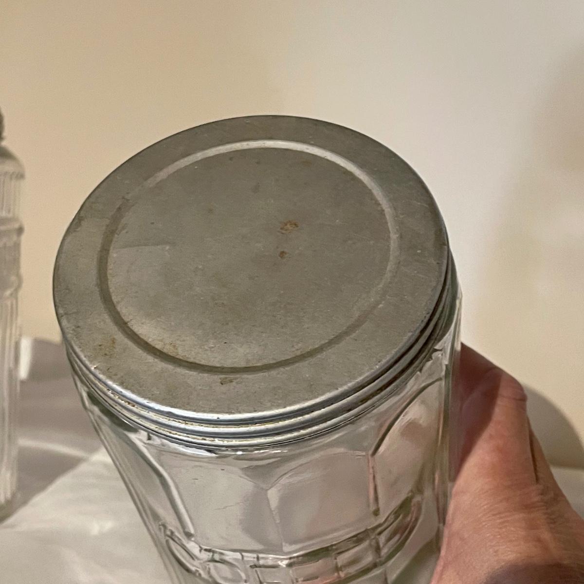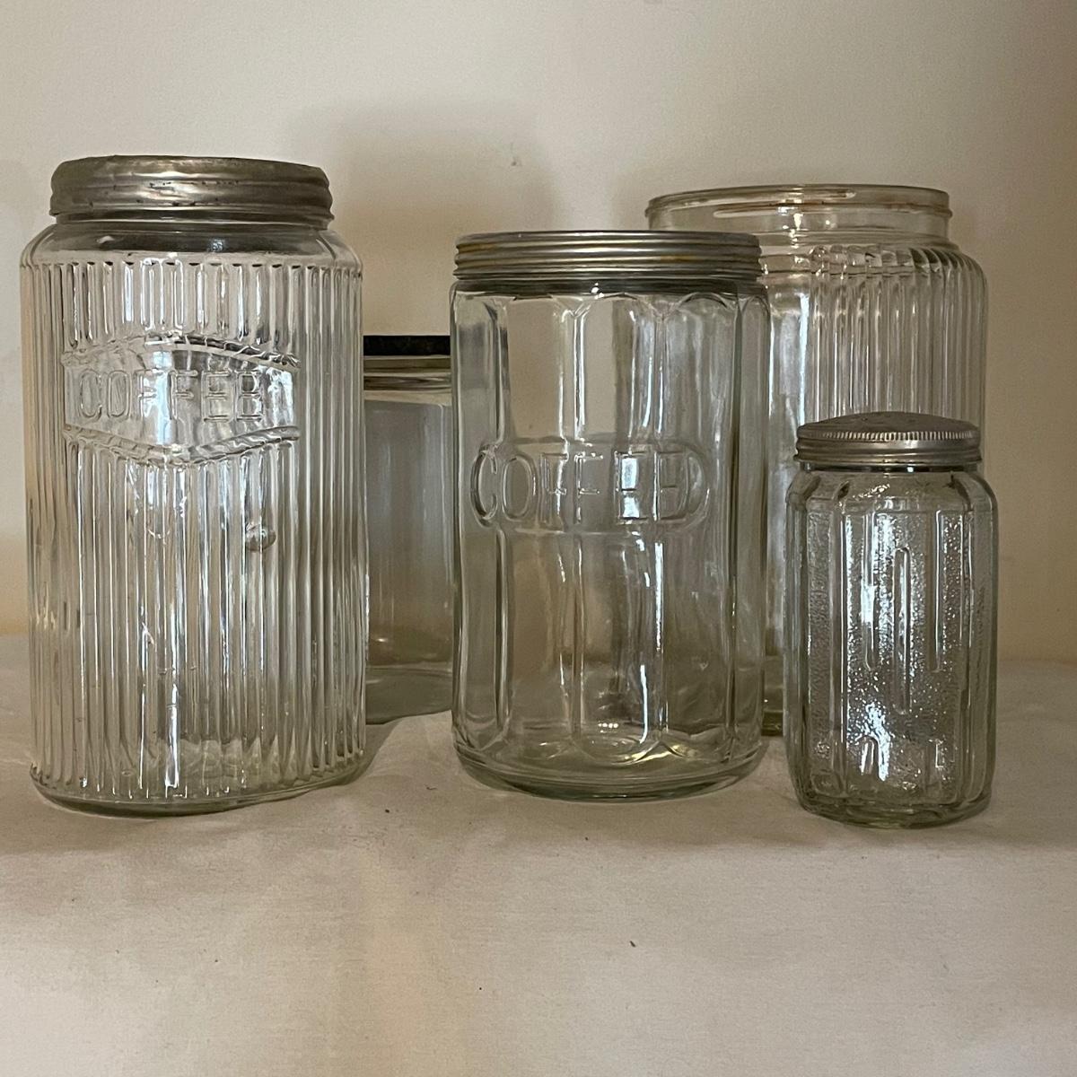 Two of these glass canisters are marked coffee and come with their original metal lids as does the small flour shaker and a glass canister that is marked Humi-Jar. The fifth jar is the largest but comes without lid.
