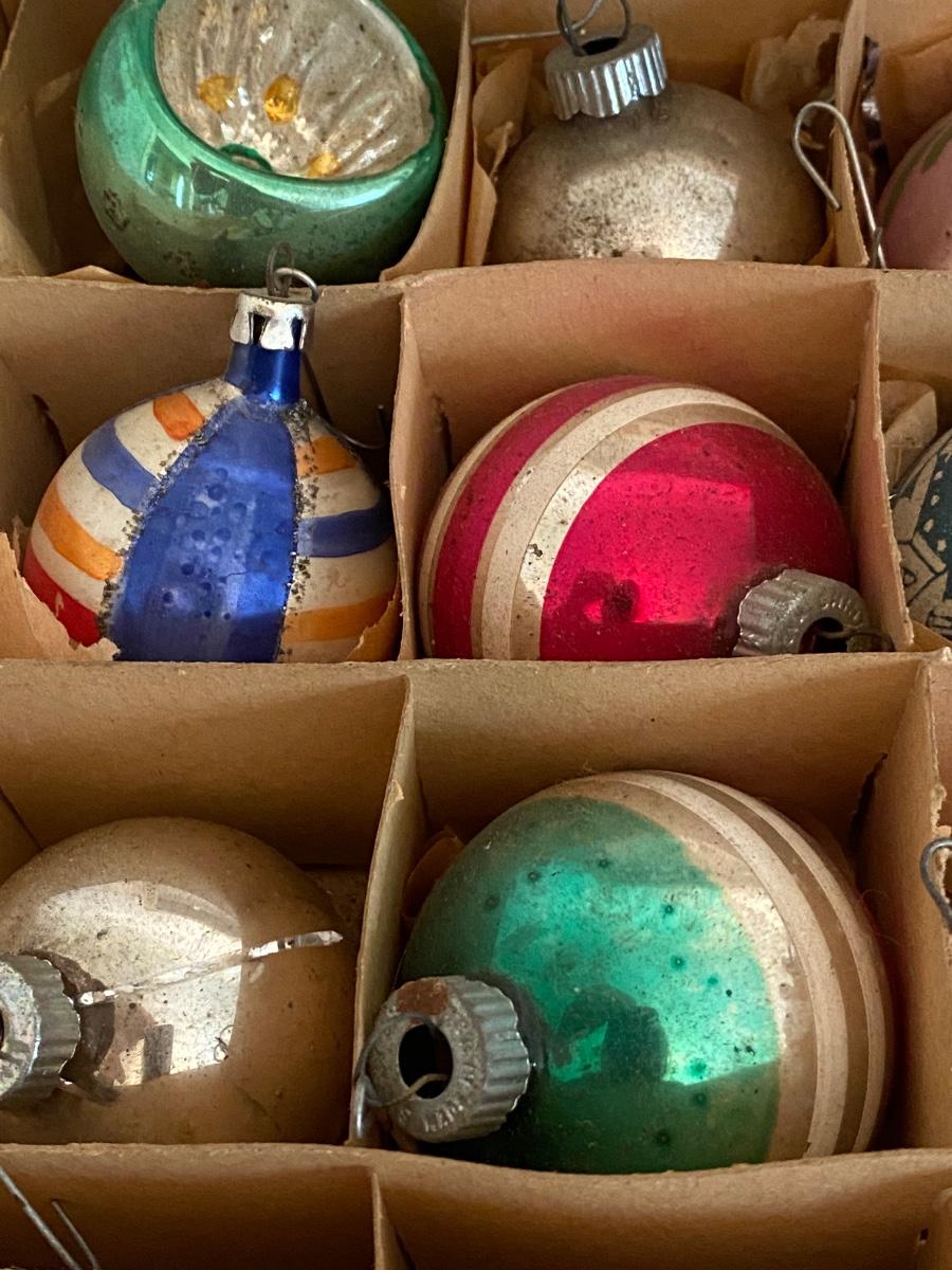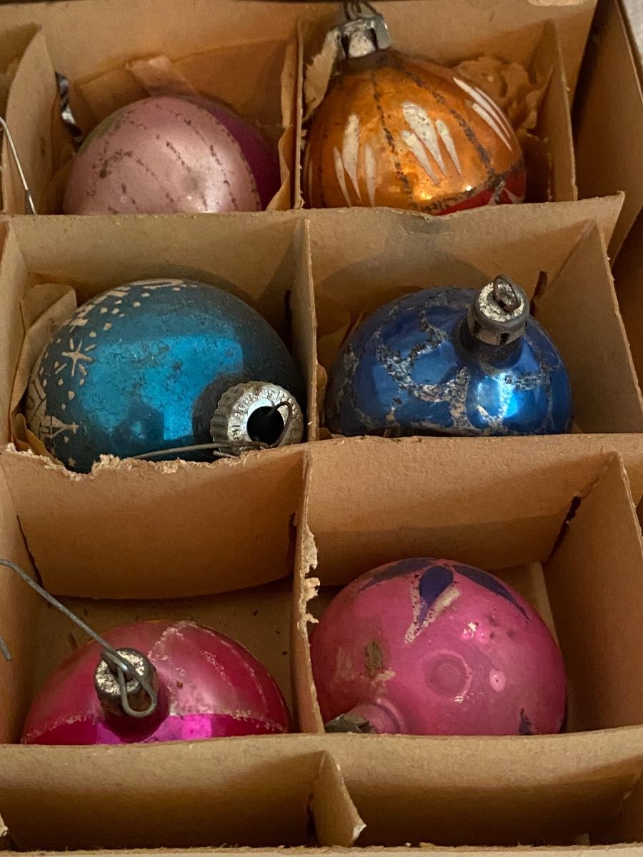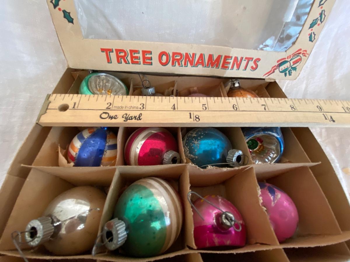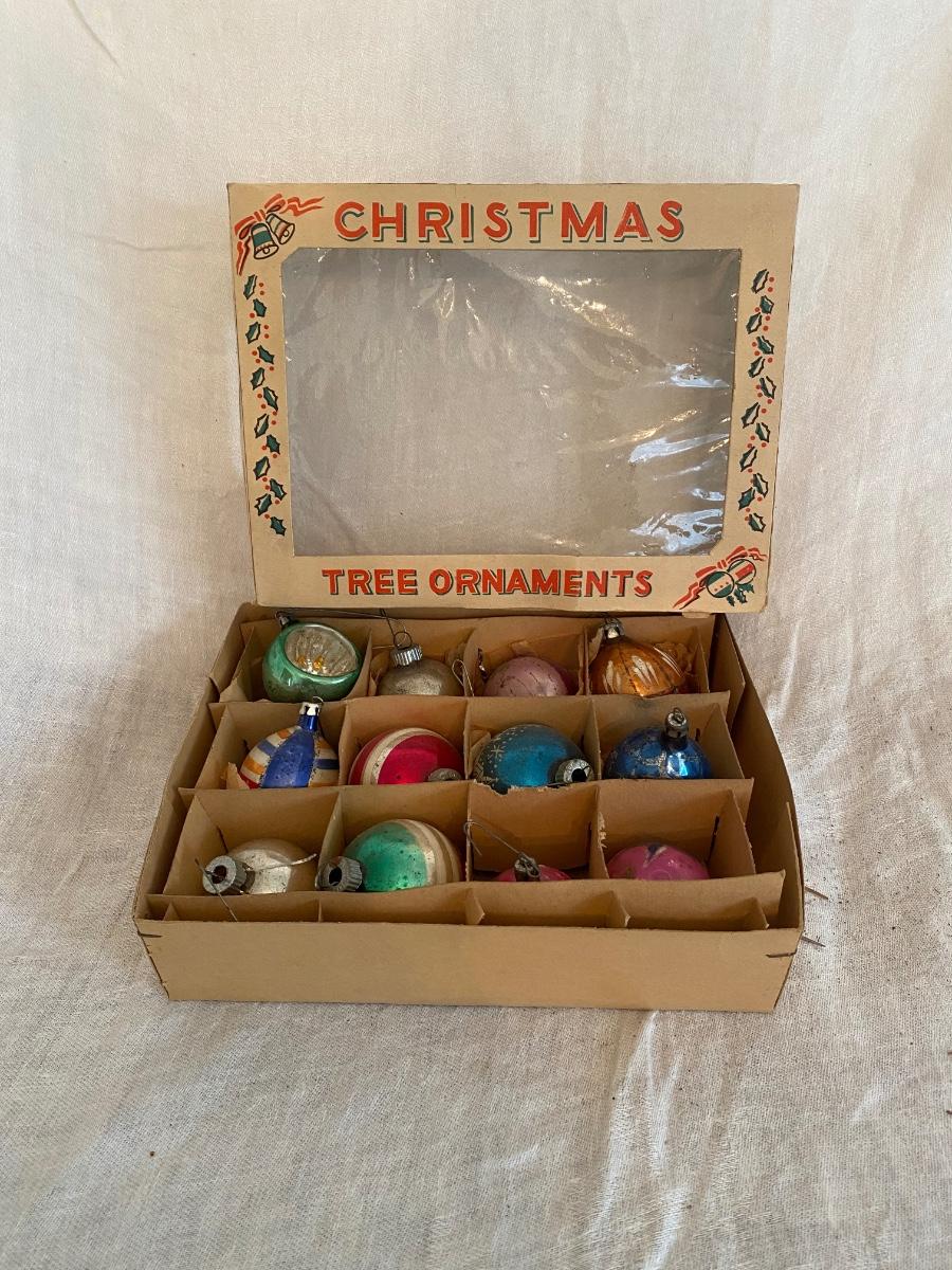 Mixed assortment of glass chritmas ornaments all in excellent vintage condition. Comes with original box.