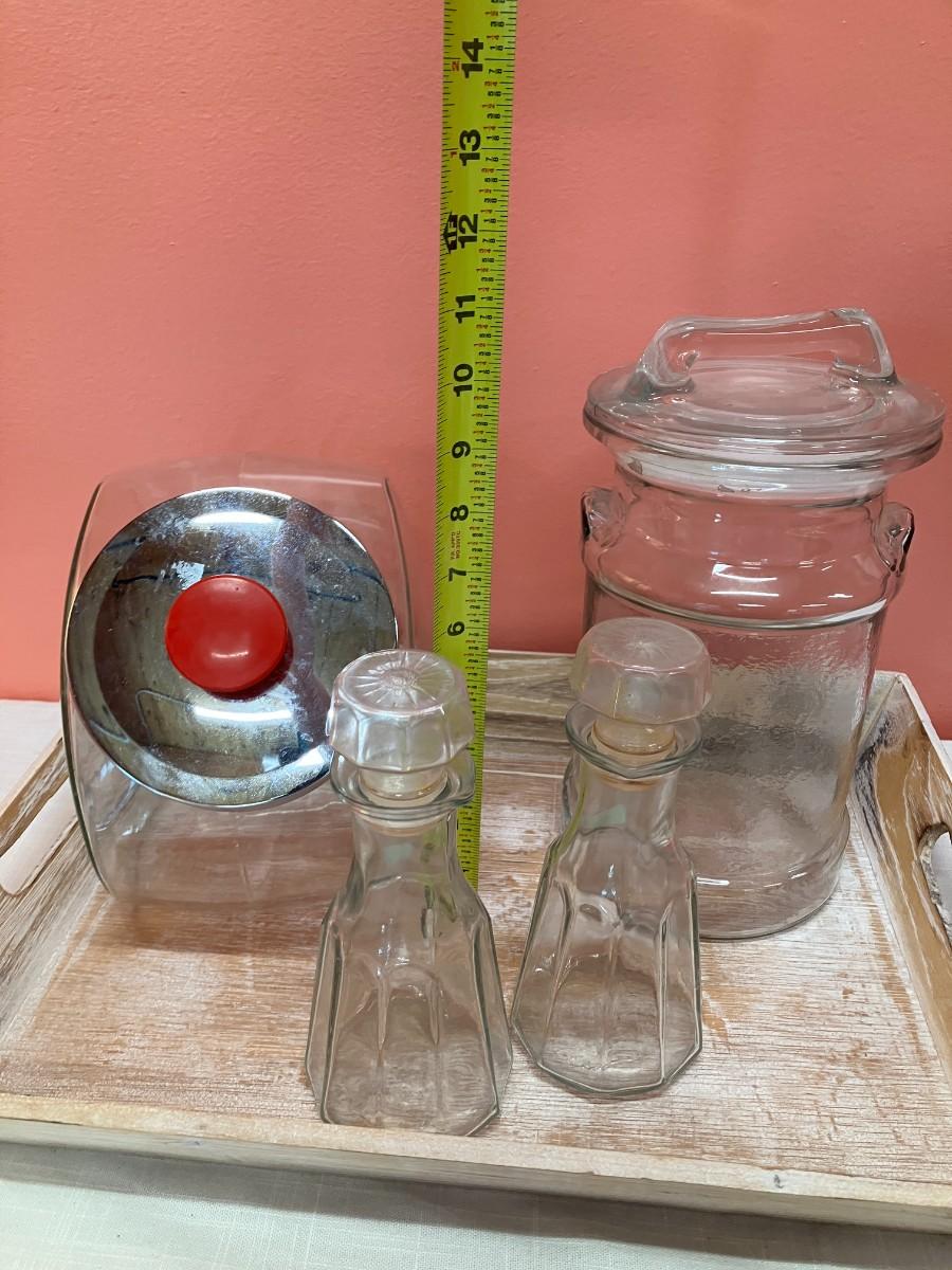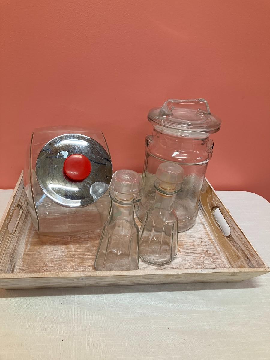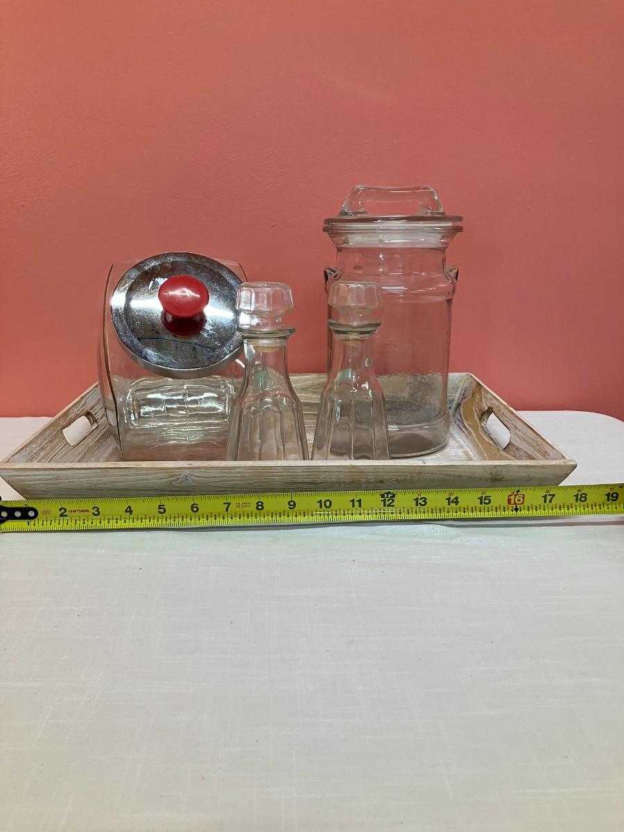 Set includes: wooden tray, vintage candy/flour container, peanut jar, 2 oil/dressing bottles. All in excellent condition.