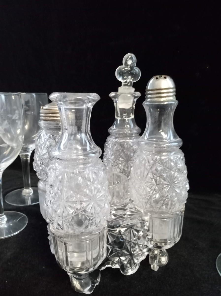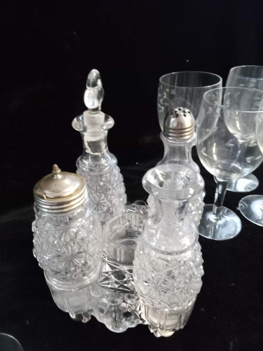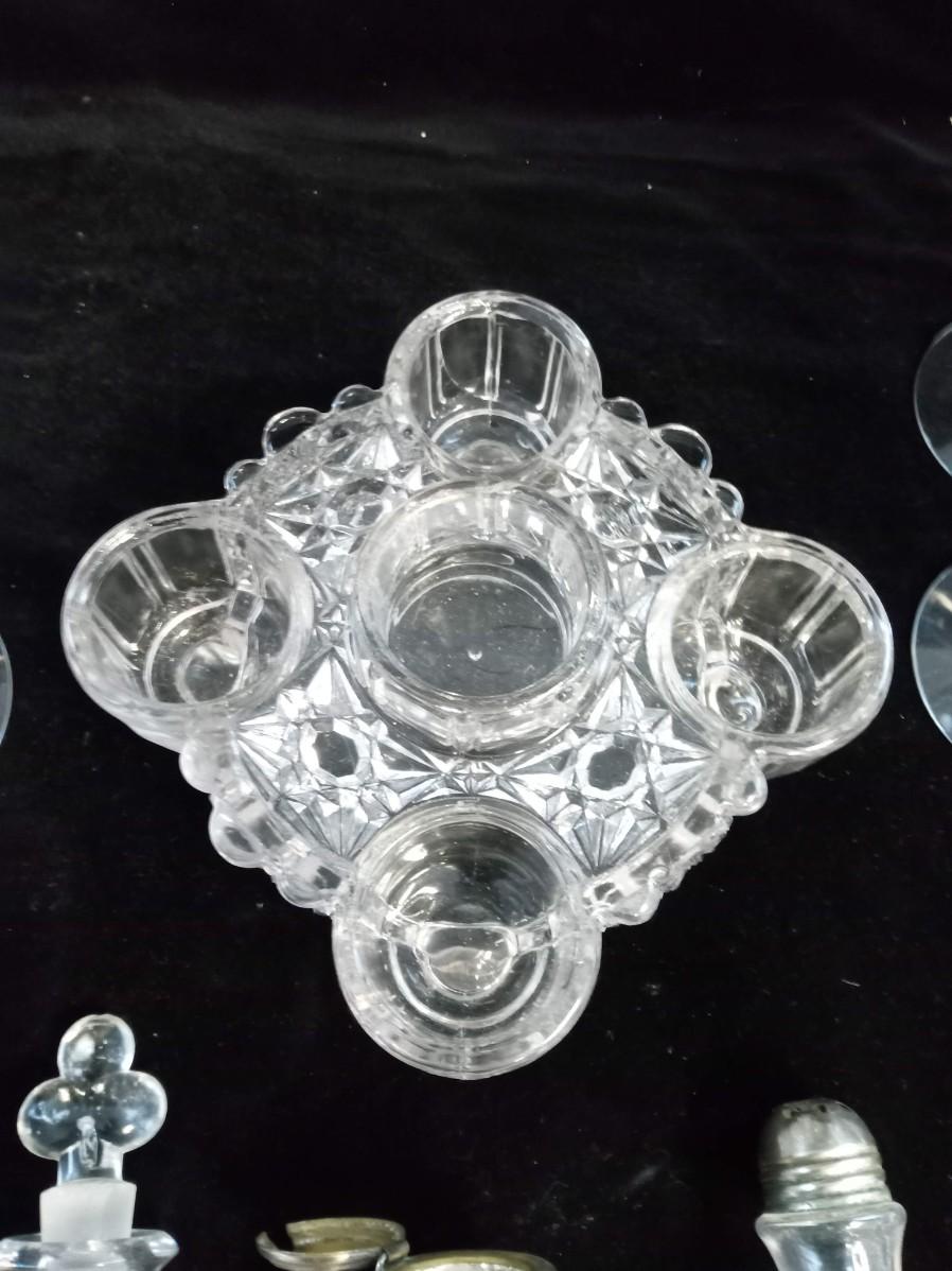 THE CRUET CADDY IS MISSING THE MIDDLE PIECE, WE DID FIND THE GLASS STOPPER FOR THE ONE MISSING IN THIS PICTURE.