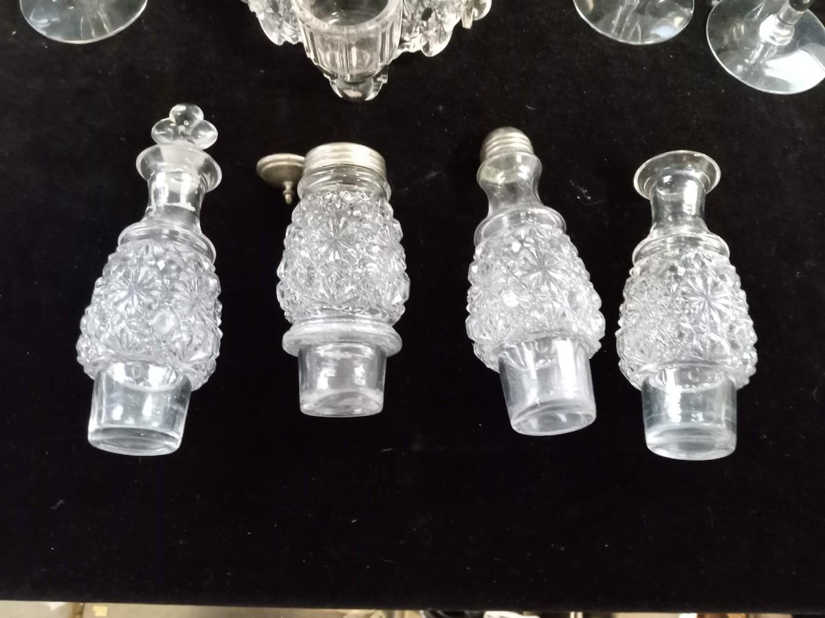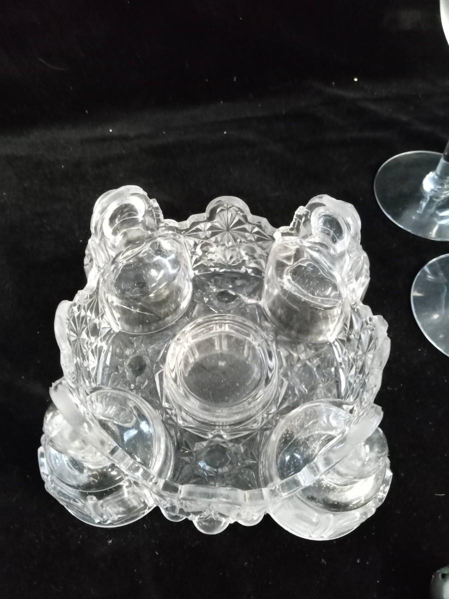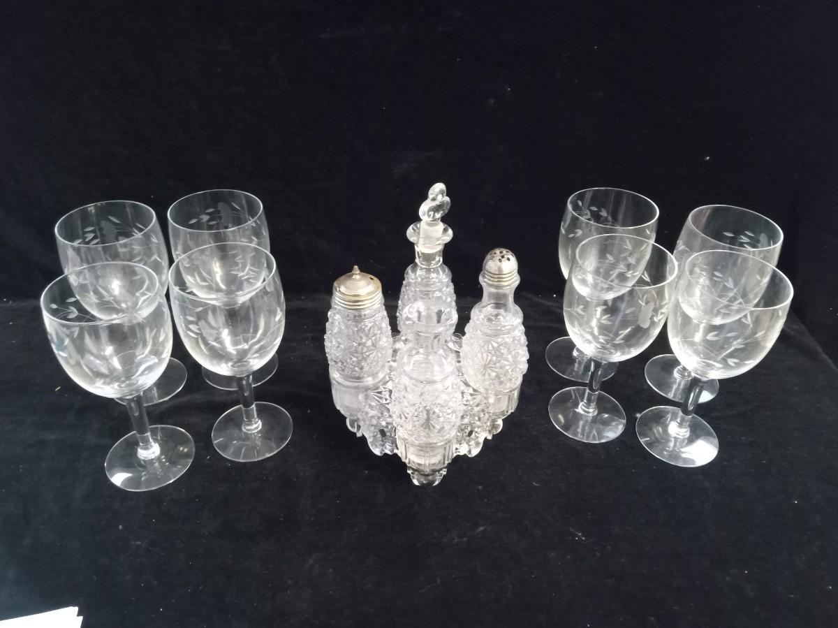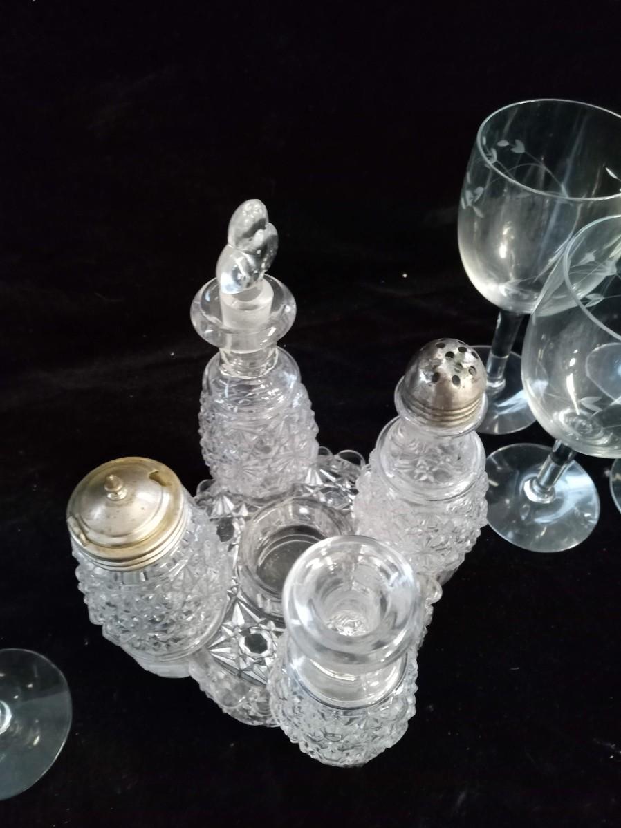 THE CRUET CADDY IS MISSING THE MIDDLE PIECE, WE DID FIND THE GLASS STOPPER FOR THE ONE MISSING IN THIS PICTURE.