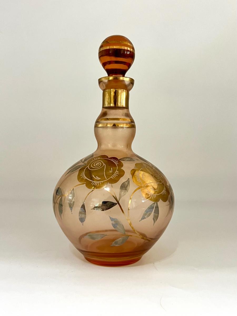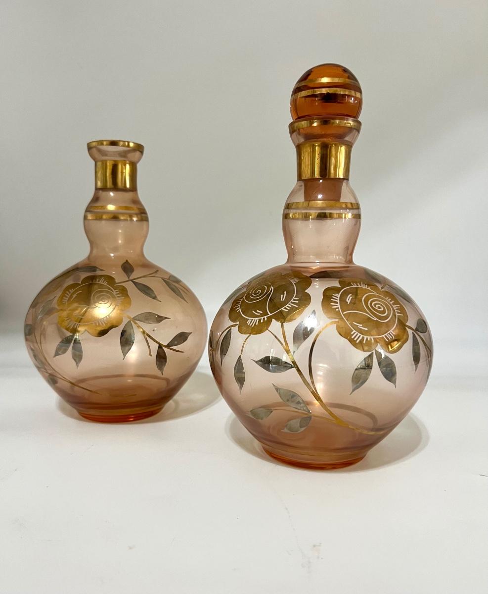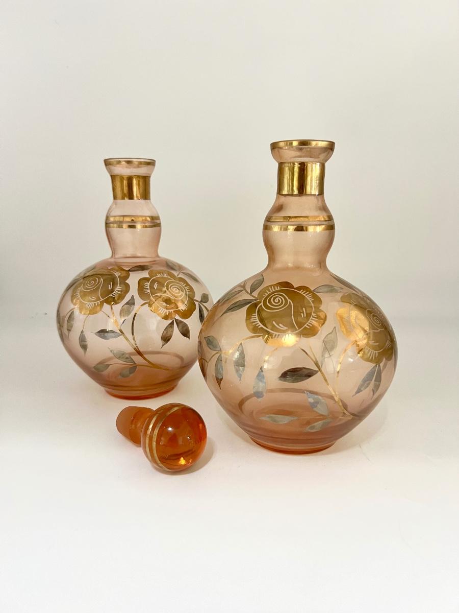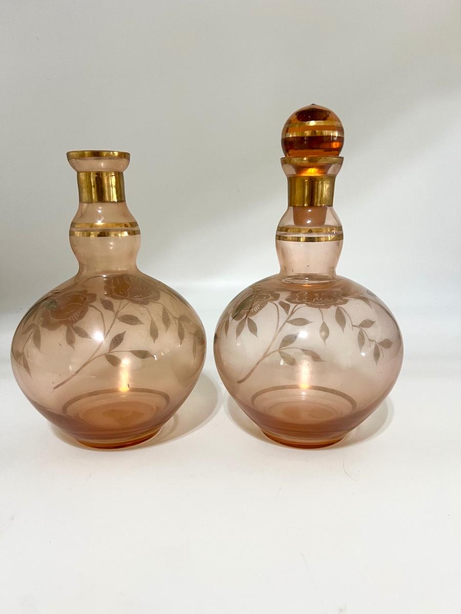 Beautiful, Vintage Glass Decanters with one glass stopper. Measures with the top on at approximately 10 inches tall and approximately 5 1/2 inches wide. You are bidding on one complete decanter with glass stopper and one decanter without a topper.