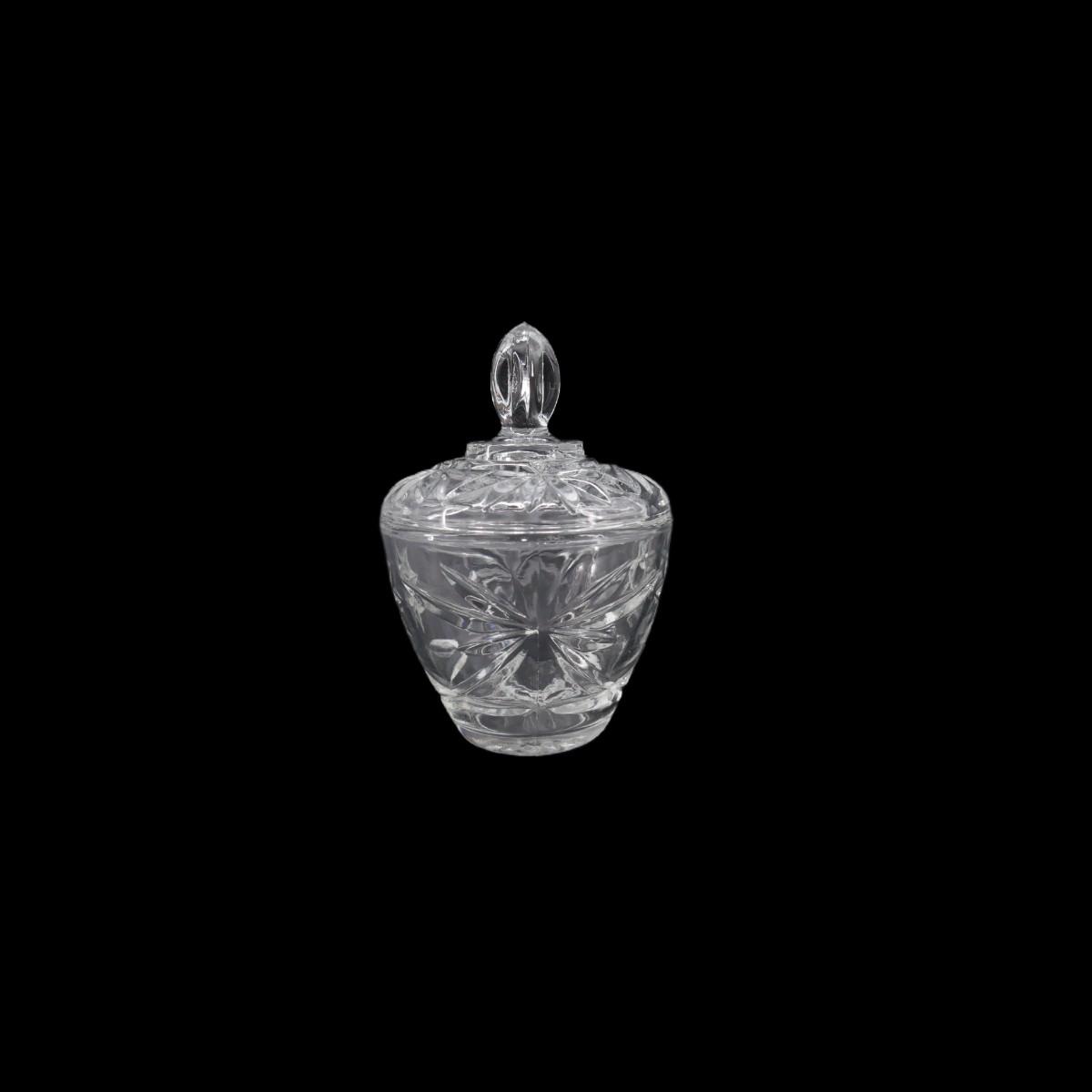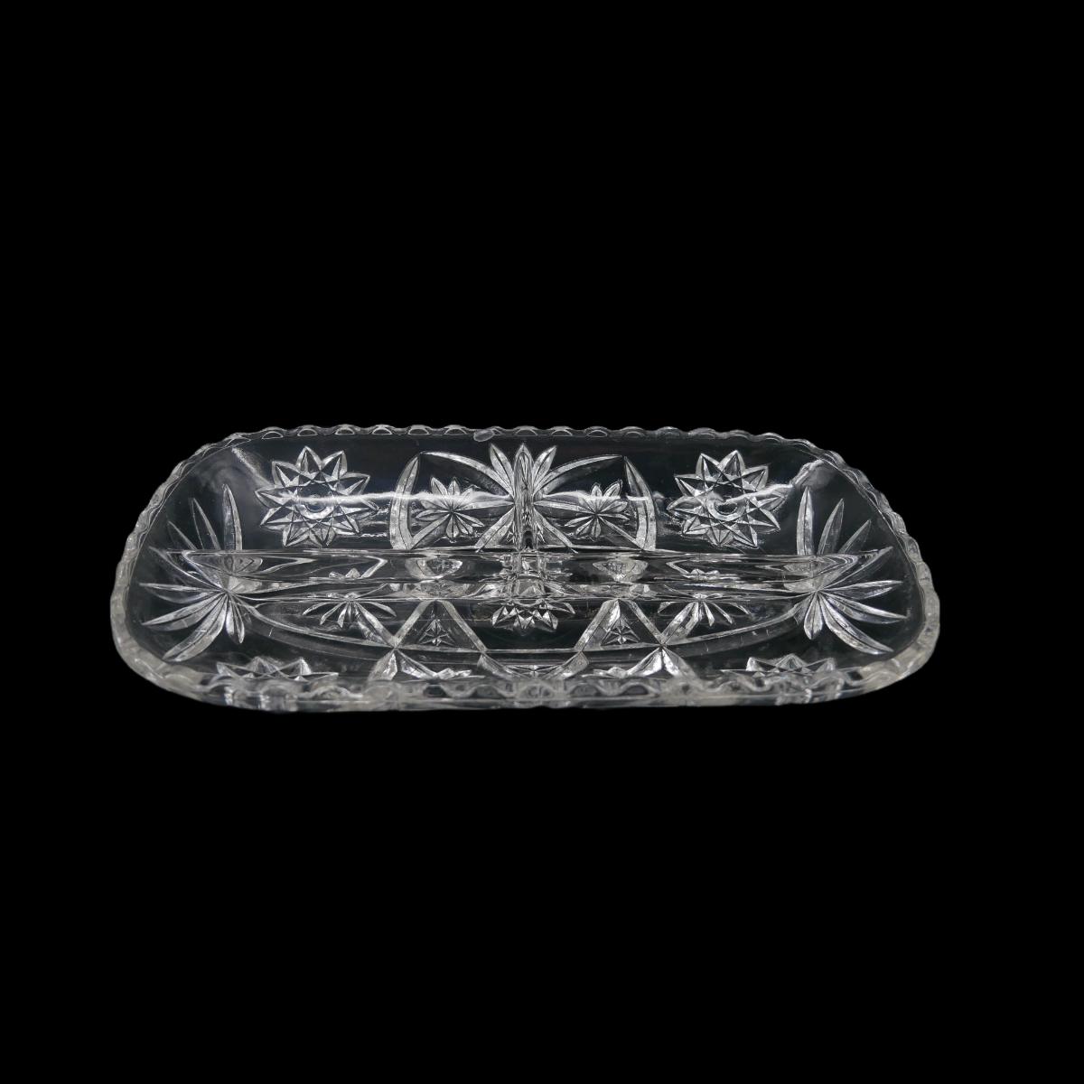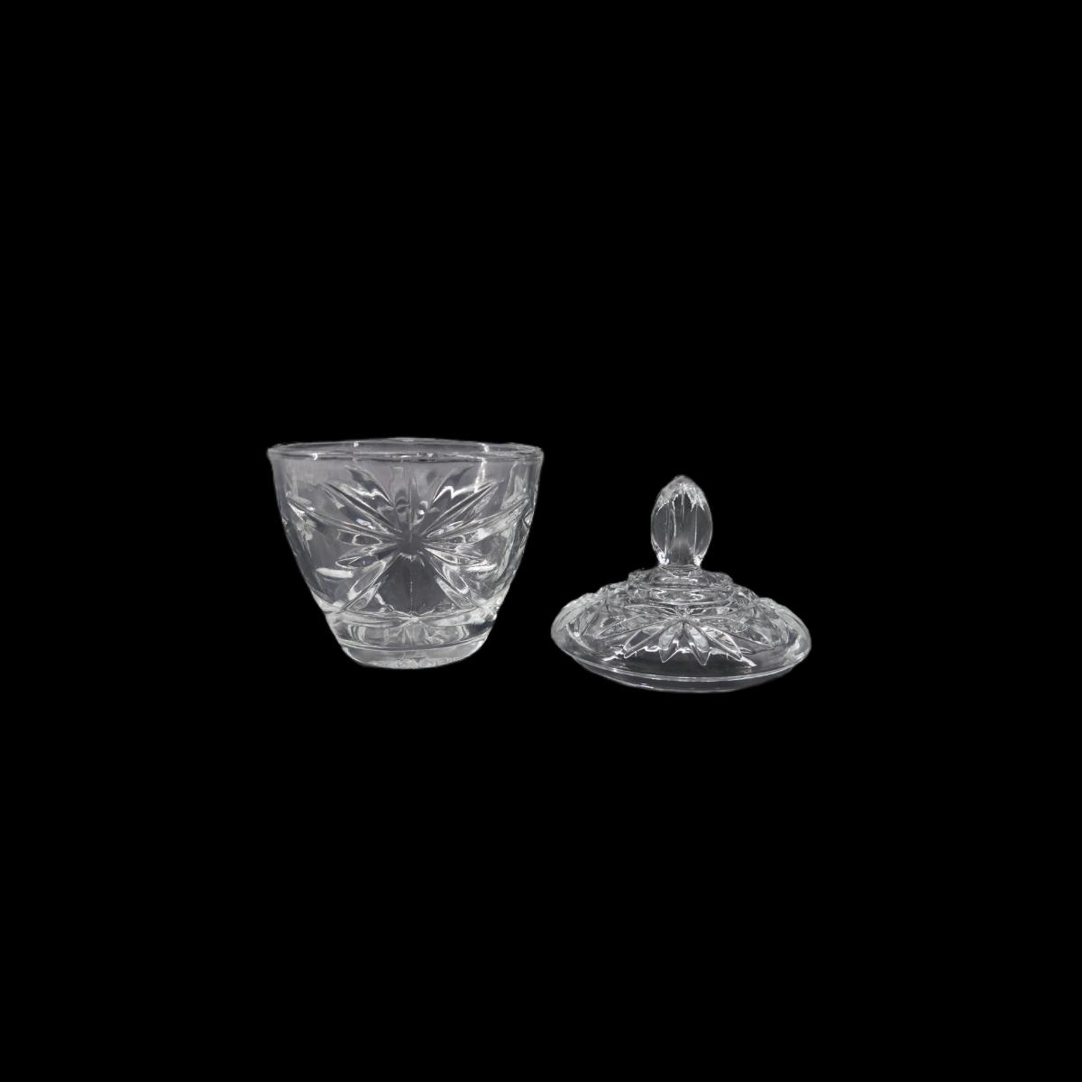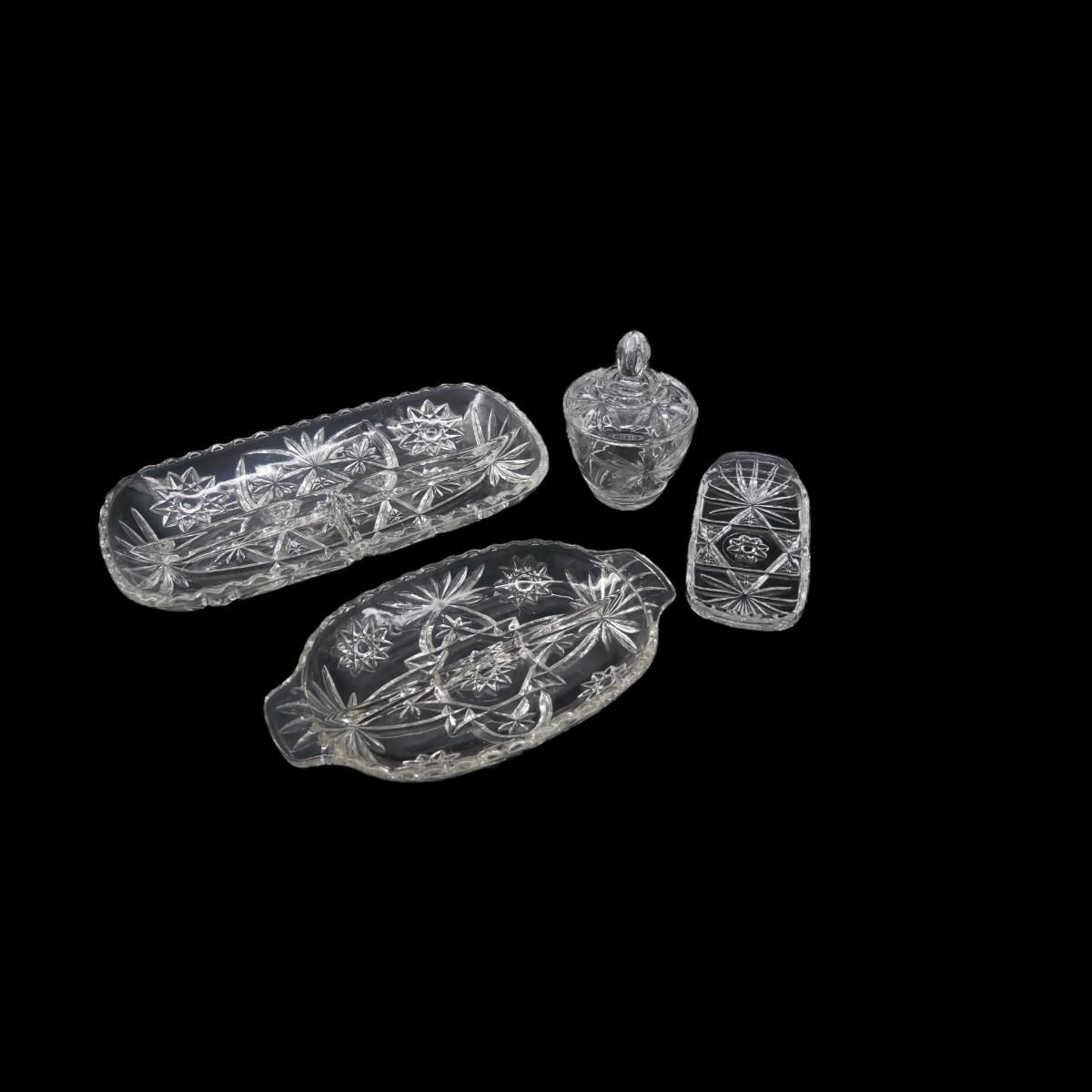 Set of four vintage mid-century style glass serving dishes. Beautifully ornate sun and starburst designs on all. Excellent condition. One small hairline crack on back of largest dish, does not go through (see photo). Largest dish measures 11" x 6.5". Candy bowl with lid measures 3.5" x 5.5". Lot weighs 5 lbs. (G11)