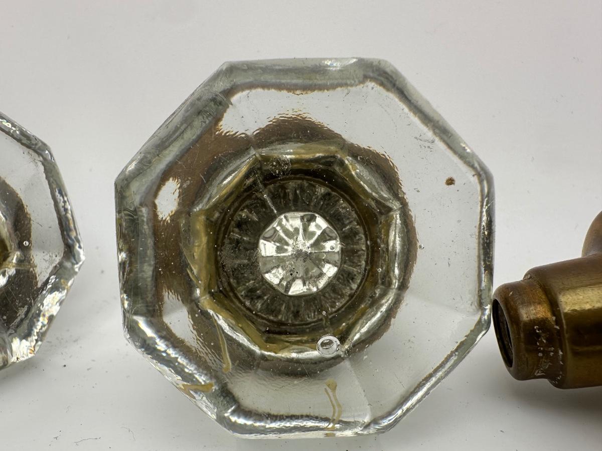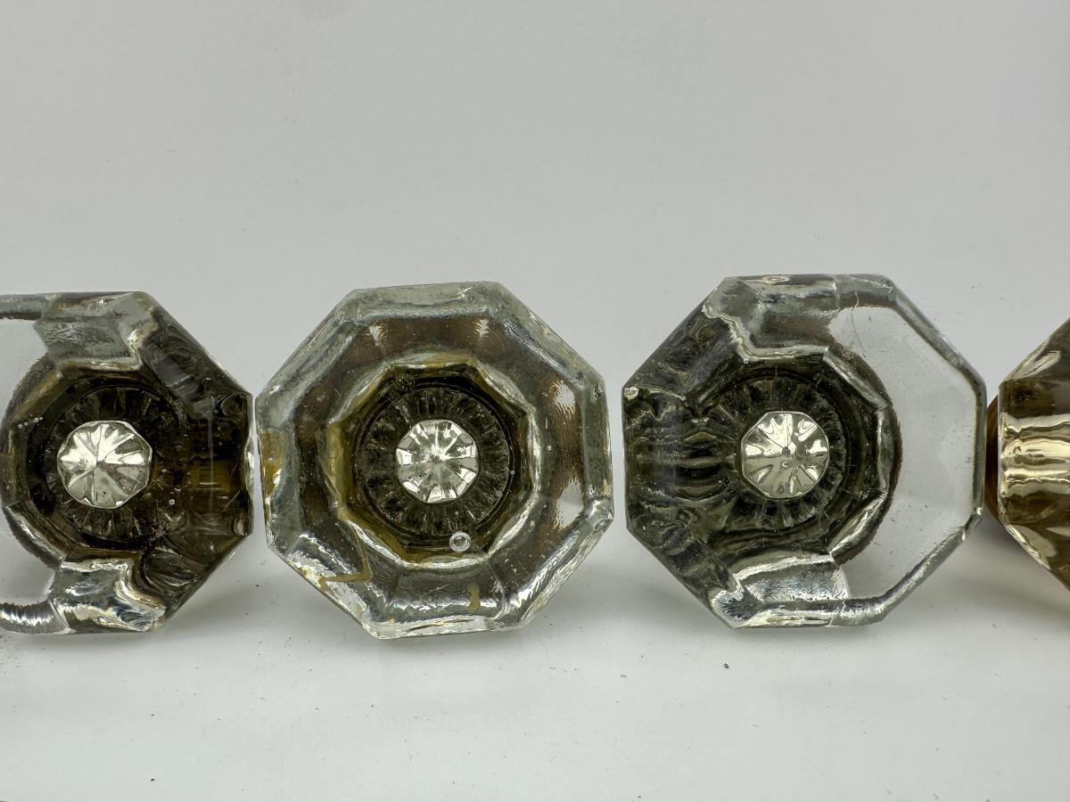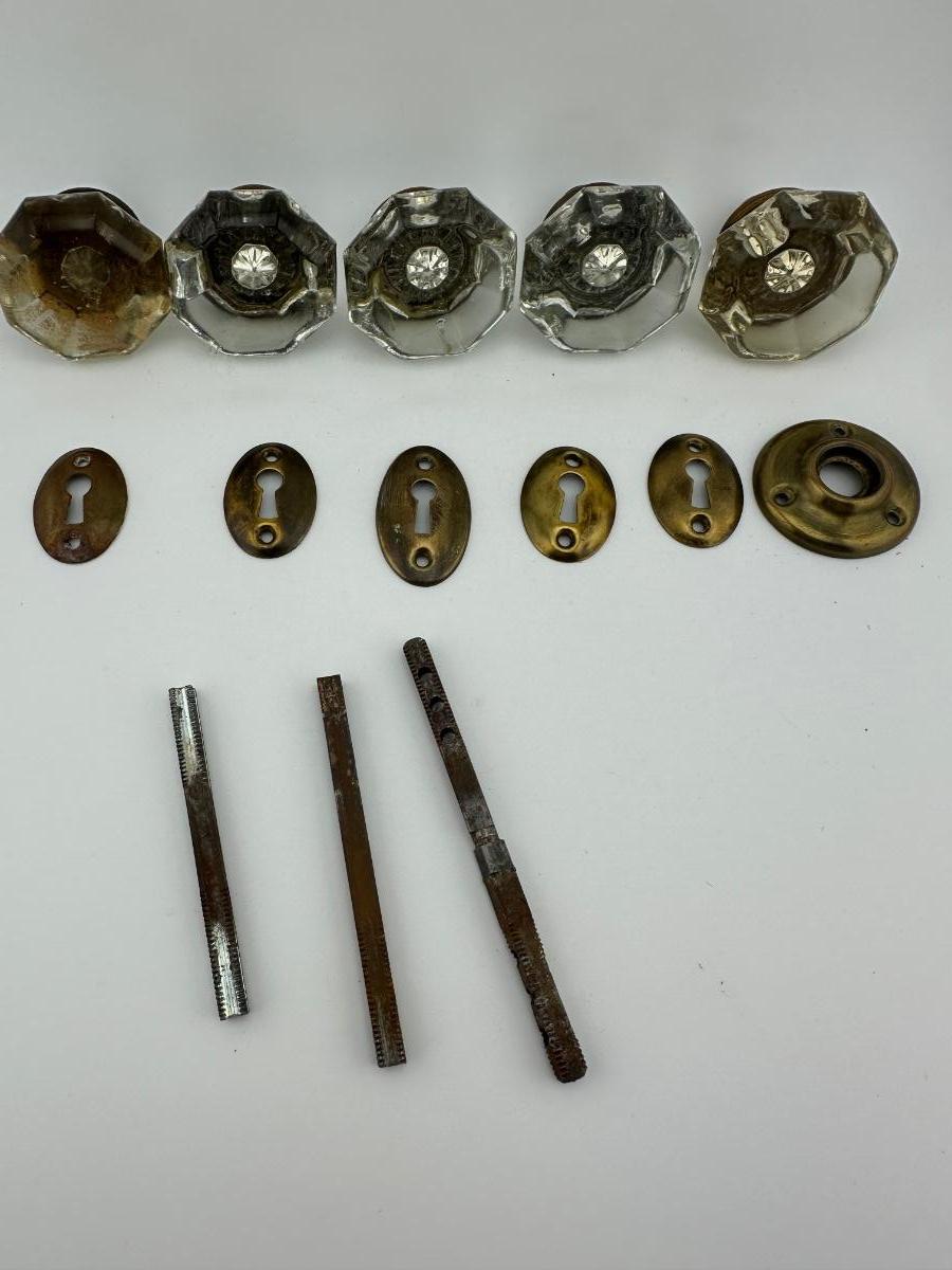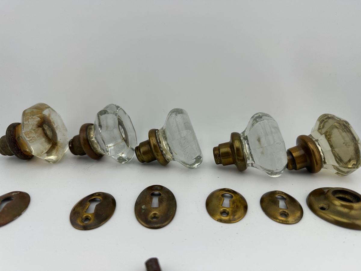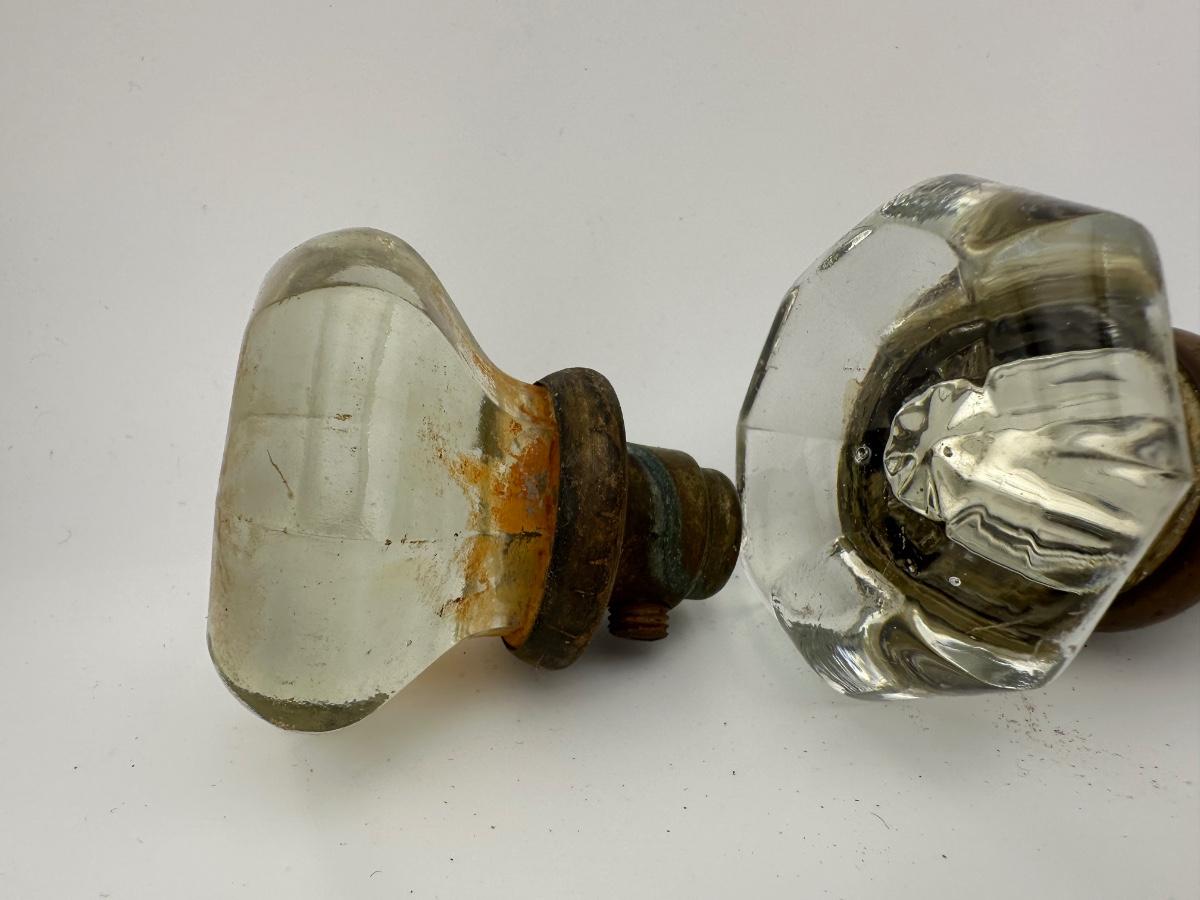 One is rusted from metal piece on it. 5 glass doorknobs.