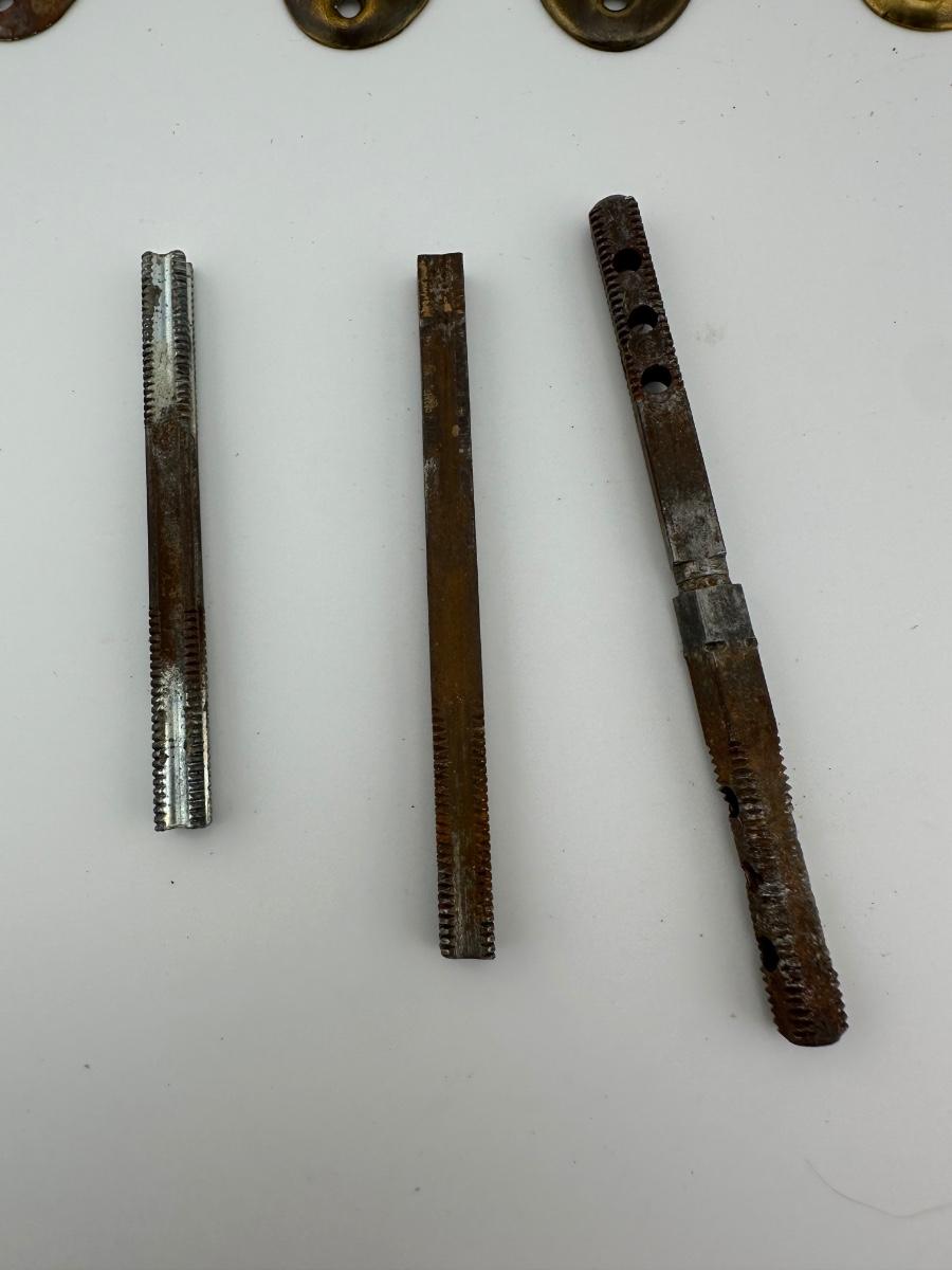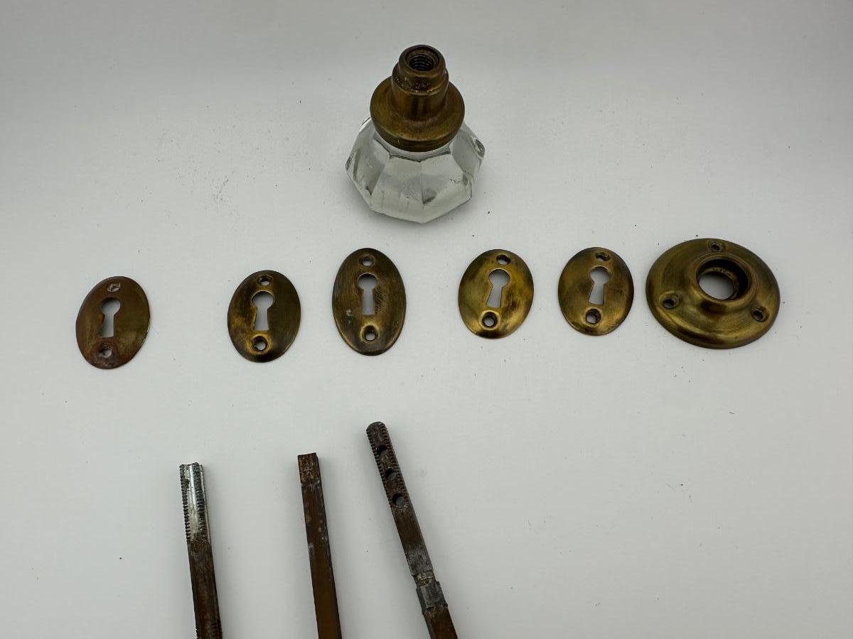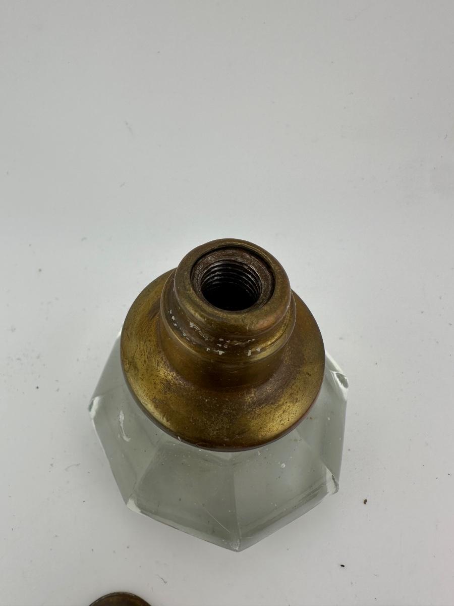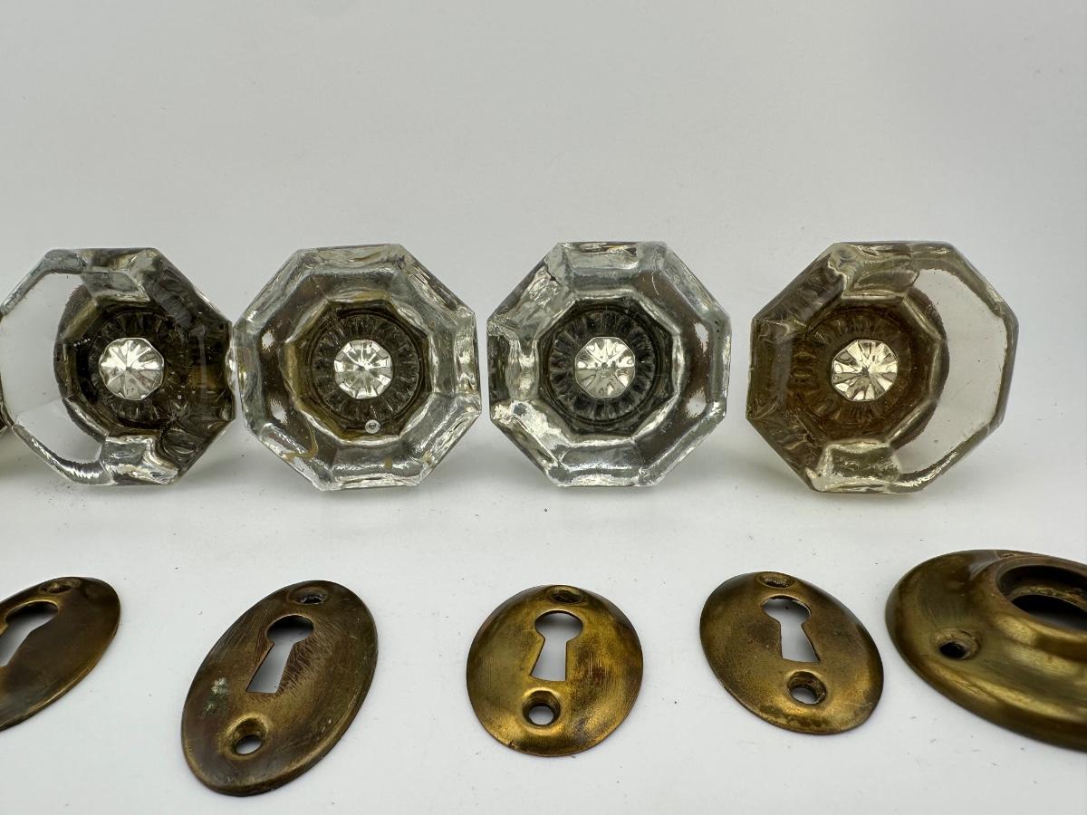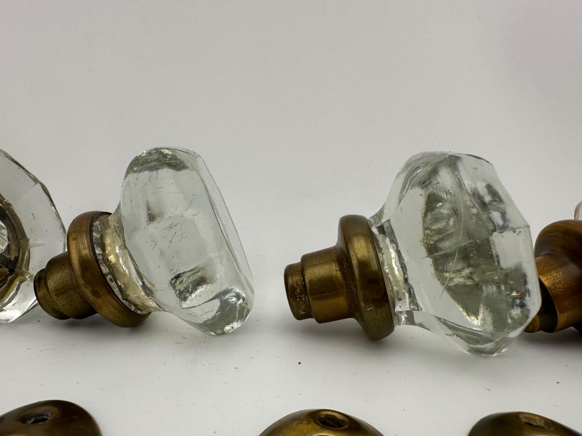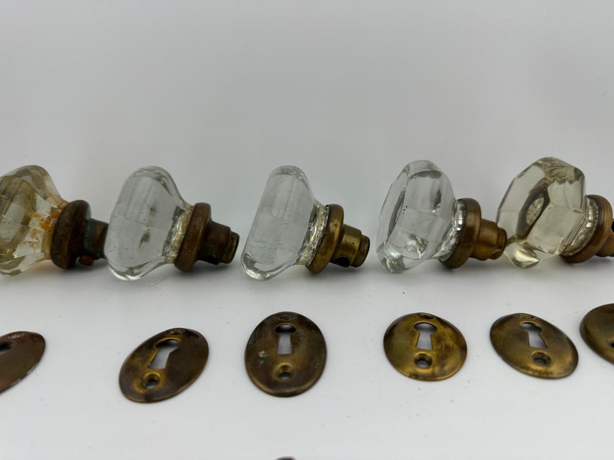 One is rusted from metal piece on it. 5 glass doorknobs.