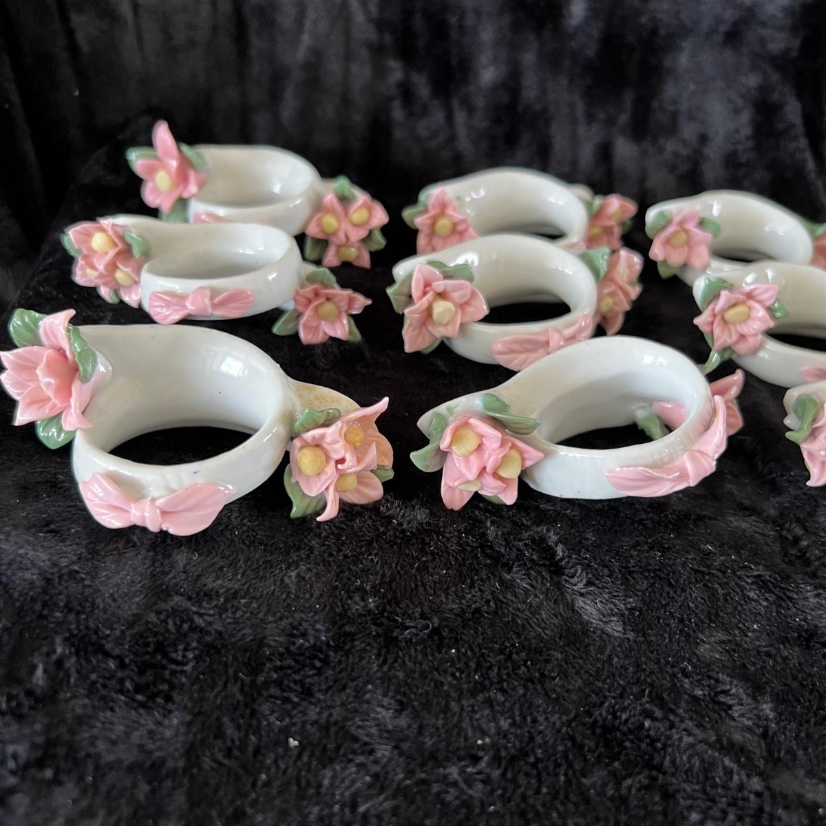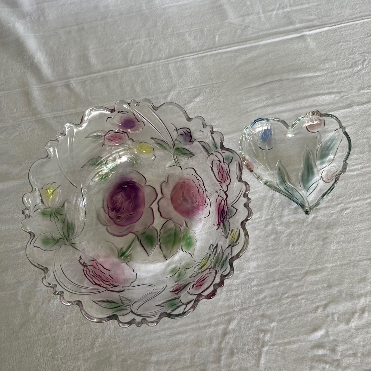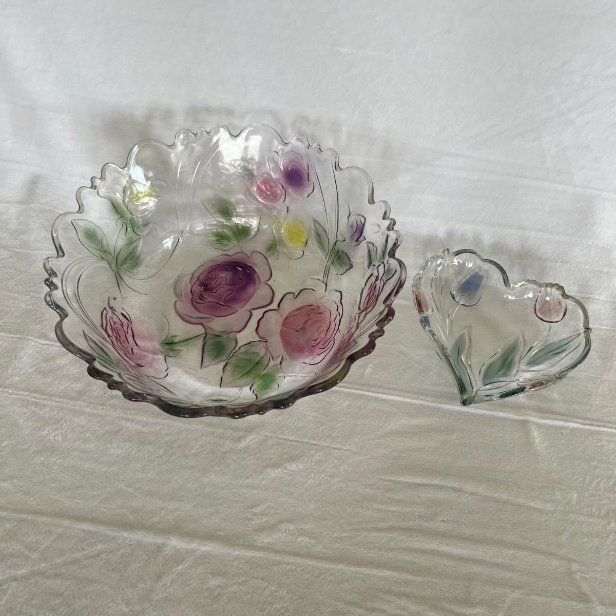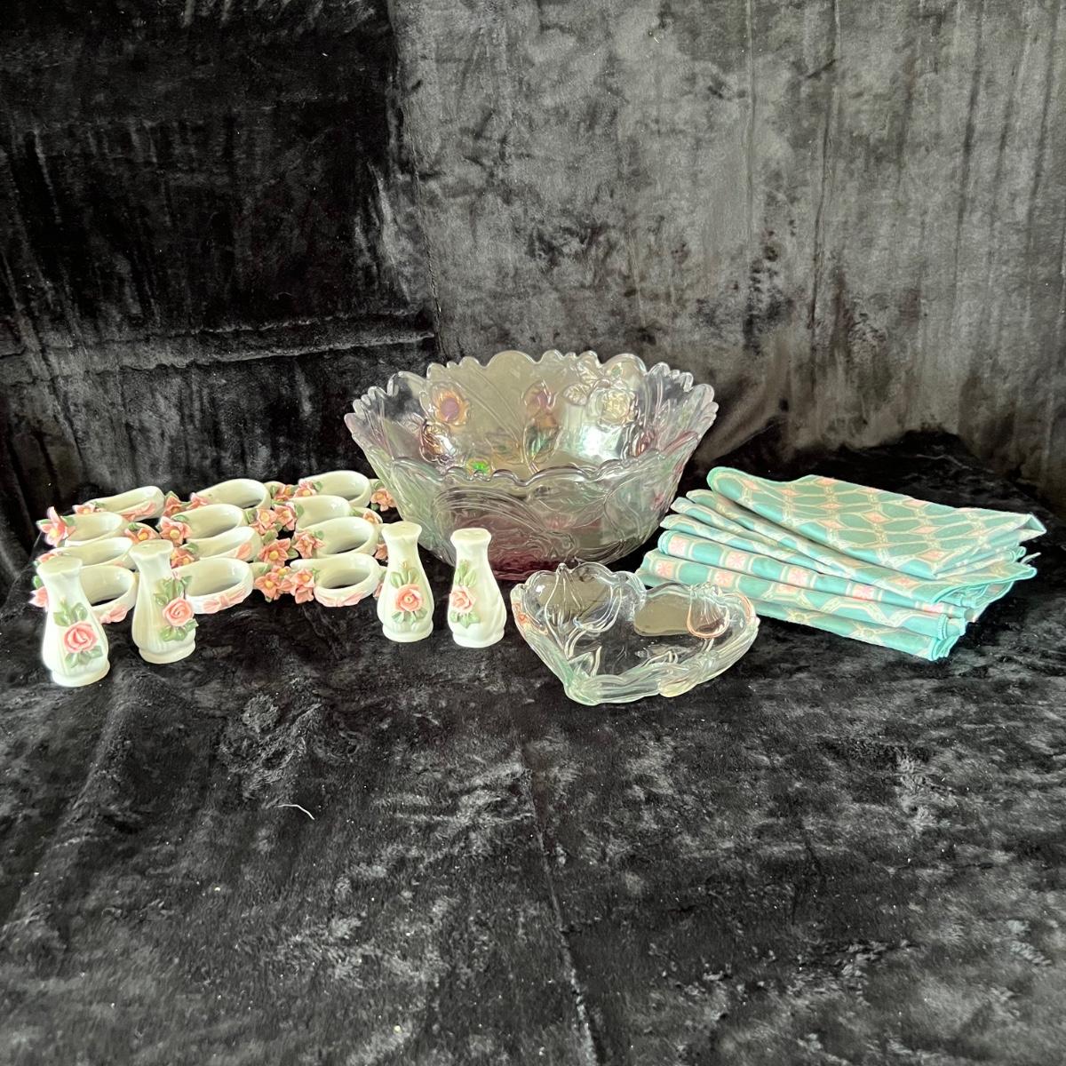 Decorative Floral Glass bowl with matching heart-shaped dish. Both with pink and lavender flowers. Lot comes with a white with pink floral set of four salt/pepper shakers and 12 napkin rings. Also included is a pink tablecloth and eight pink and green cloth napkins.
