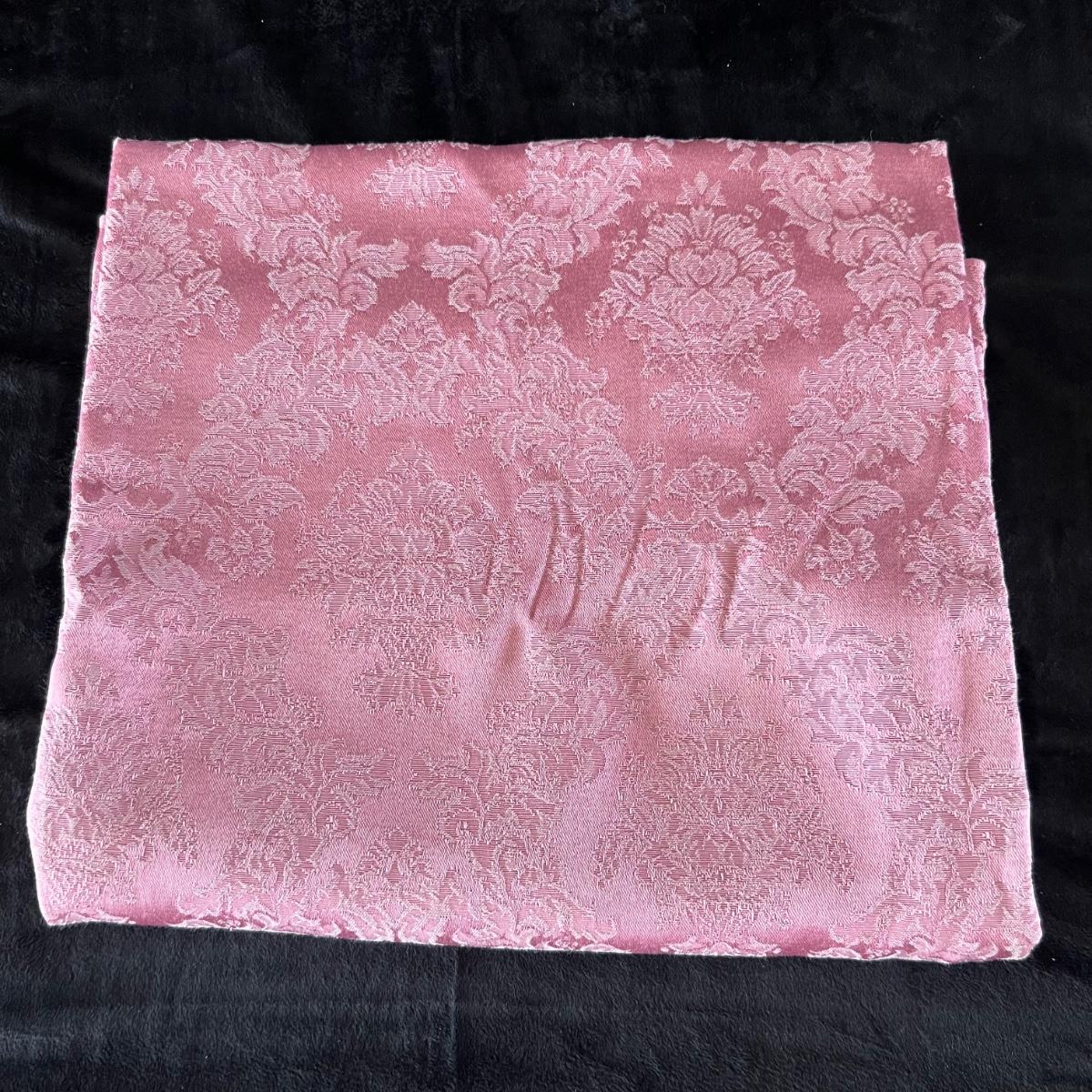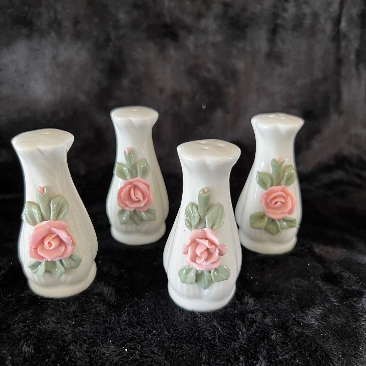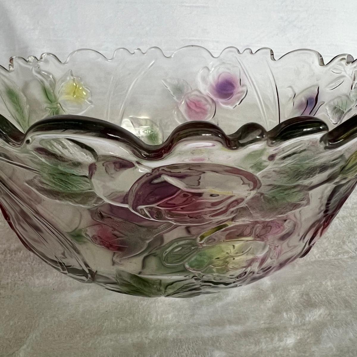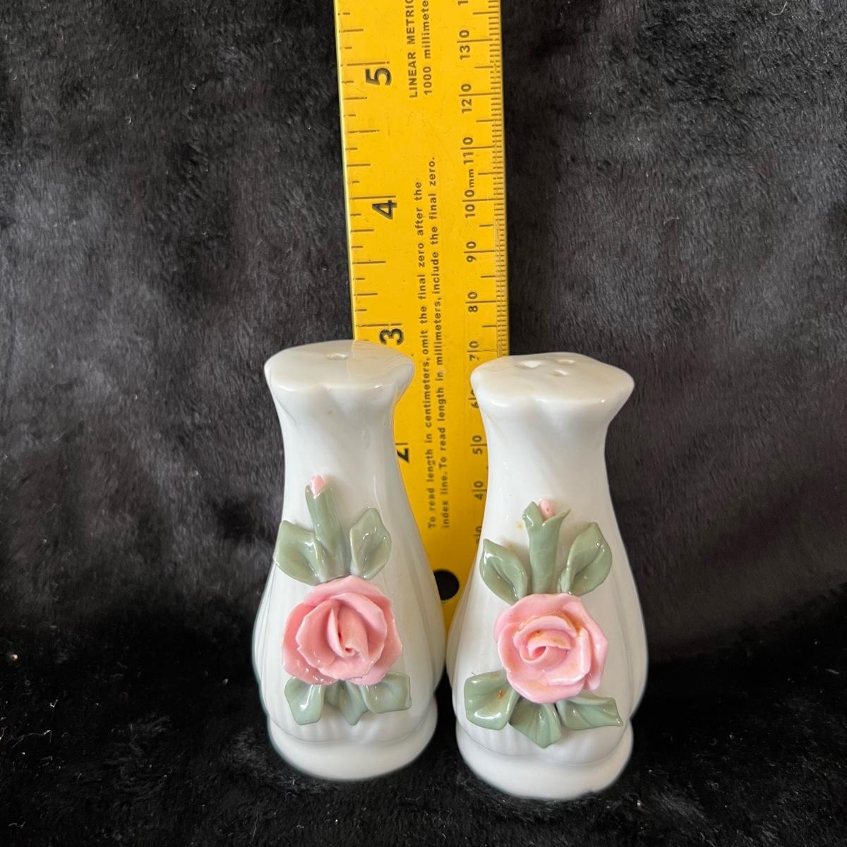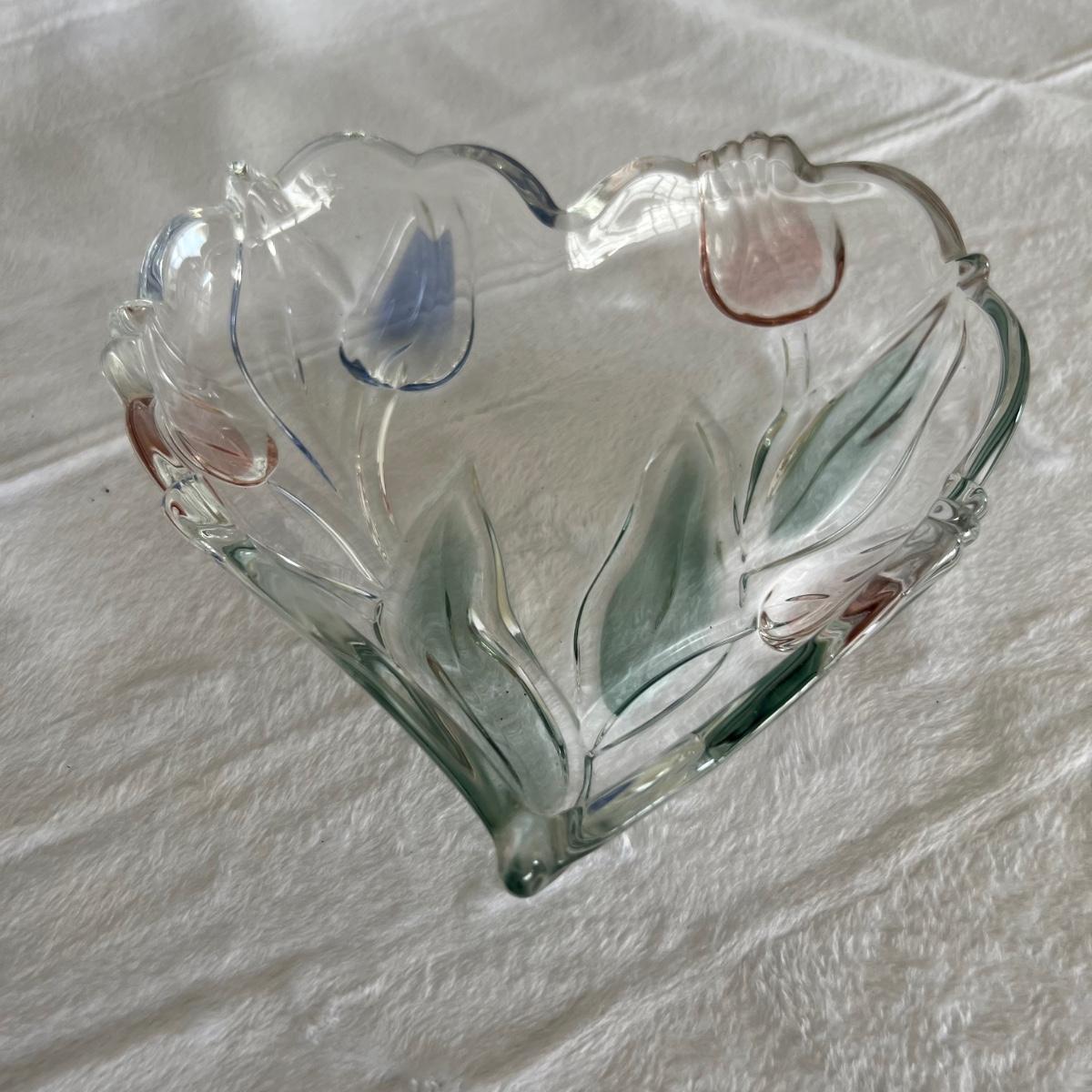 Decorative Floral Glass bowl with matching heart-shaped dish. Both with pink and lavender flowers. Lot comes with a white with pink floral set of four salt/pepper shakers and 12 napkin rings. Also included is a pink tablecloth and eight pink and green cloth napkins.