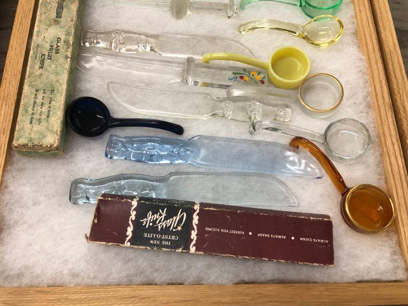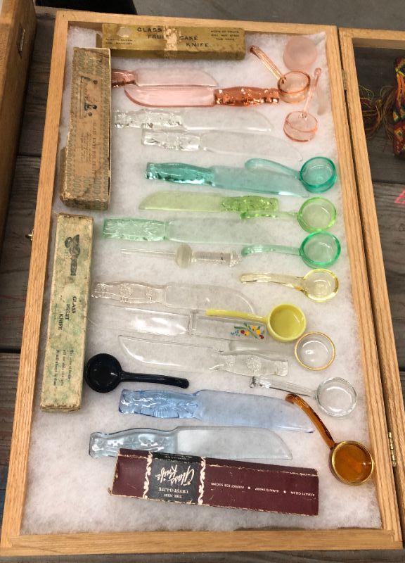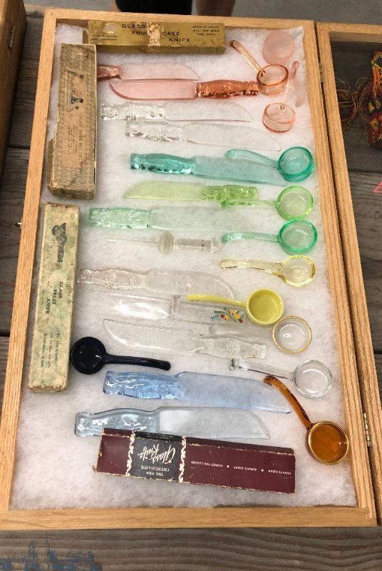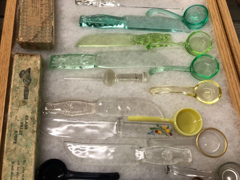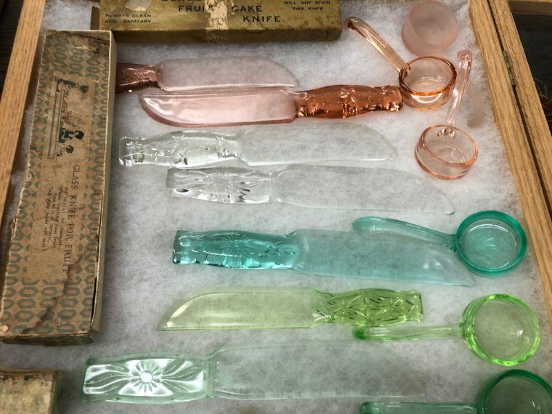 Vintage Collection of Multi Color Depression Glass Knives, Includes 3 Original Boxes. Some of Glass May have Bubbles, Small Chips or Scratches Typical in Depression Glass. Case is Not Included.