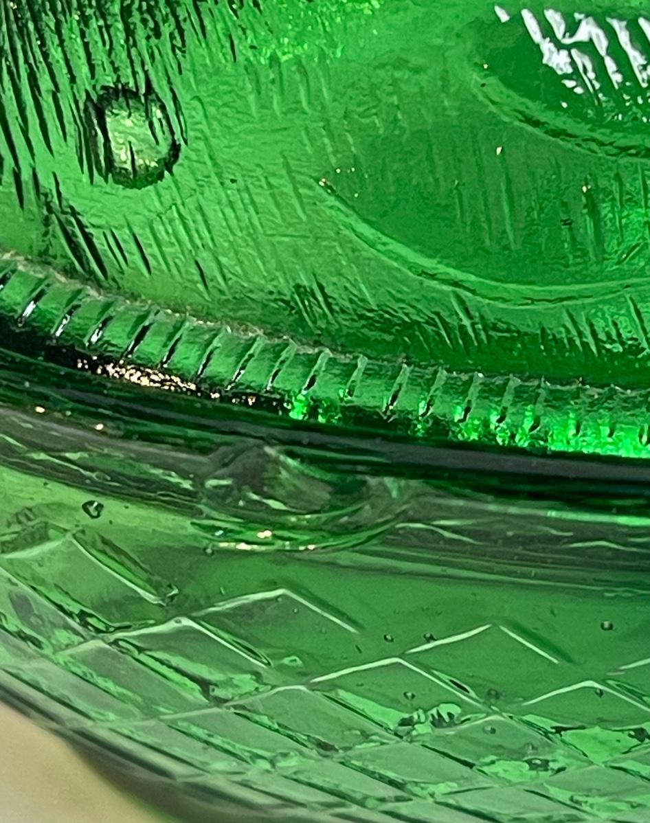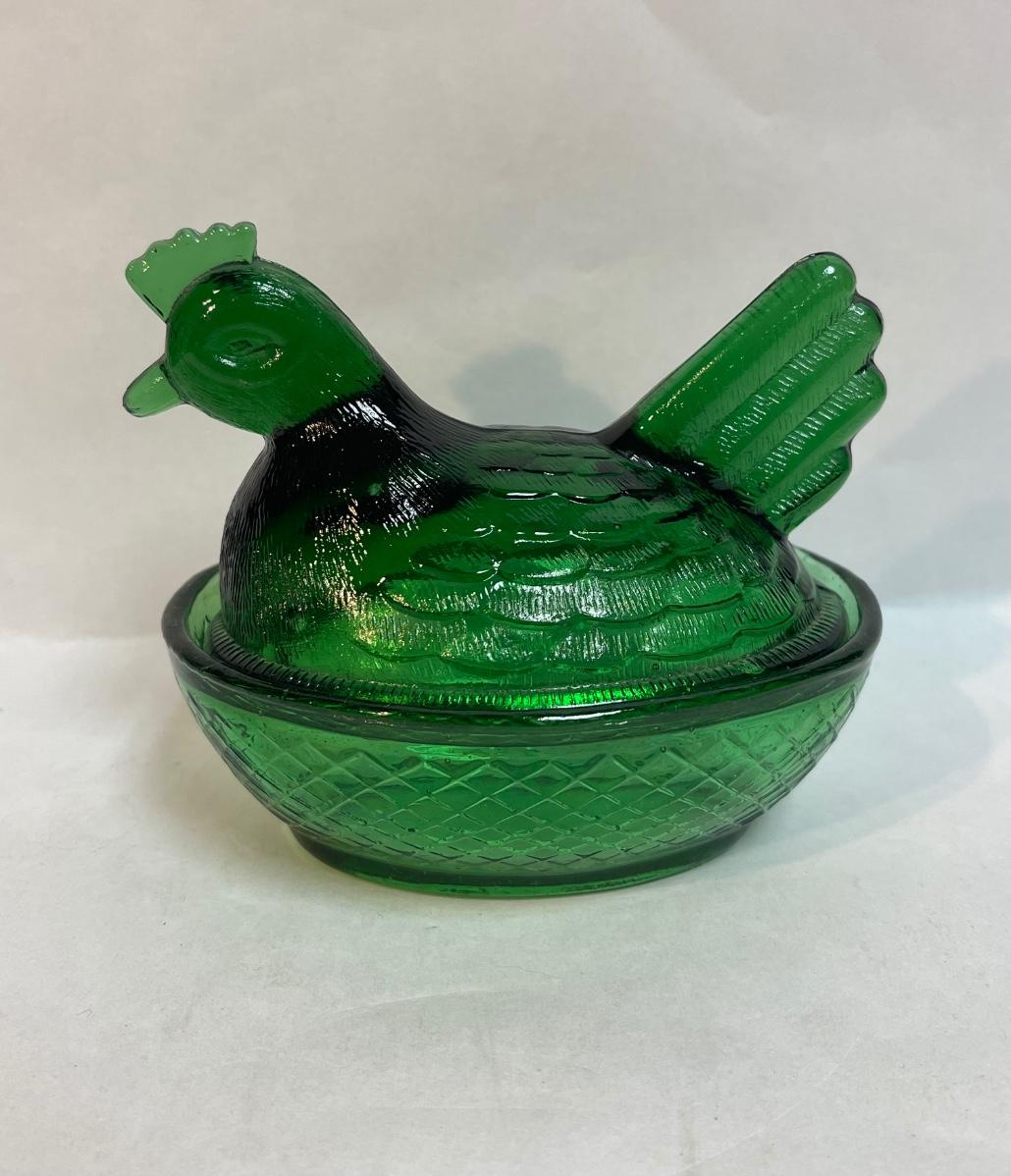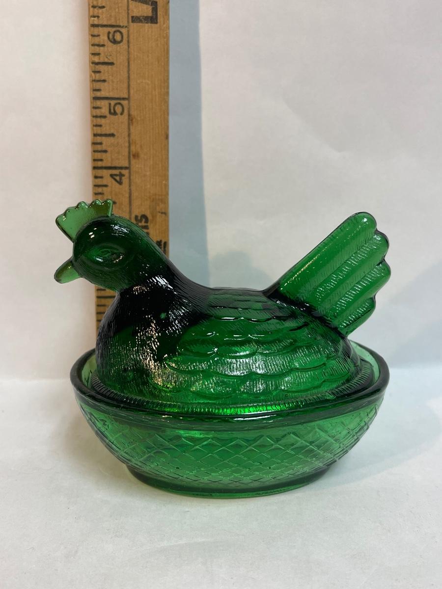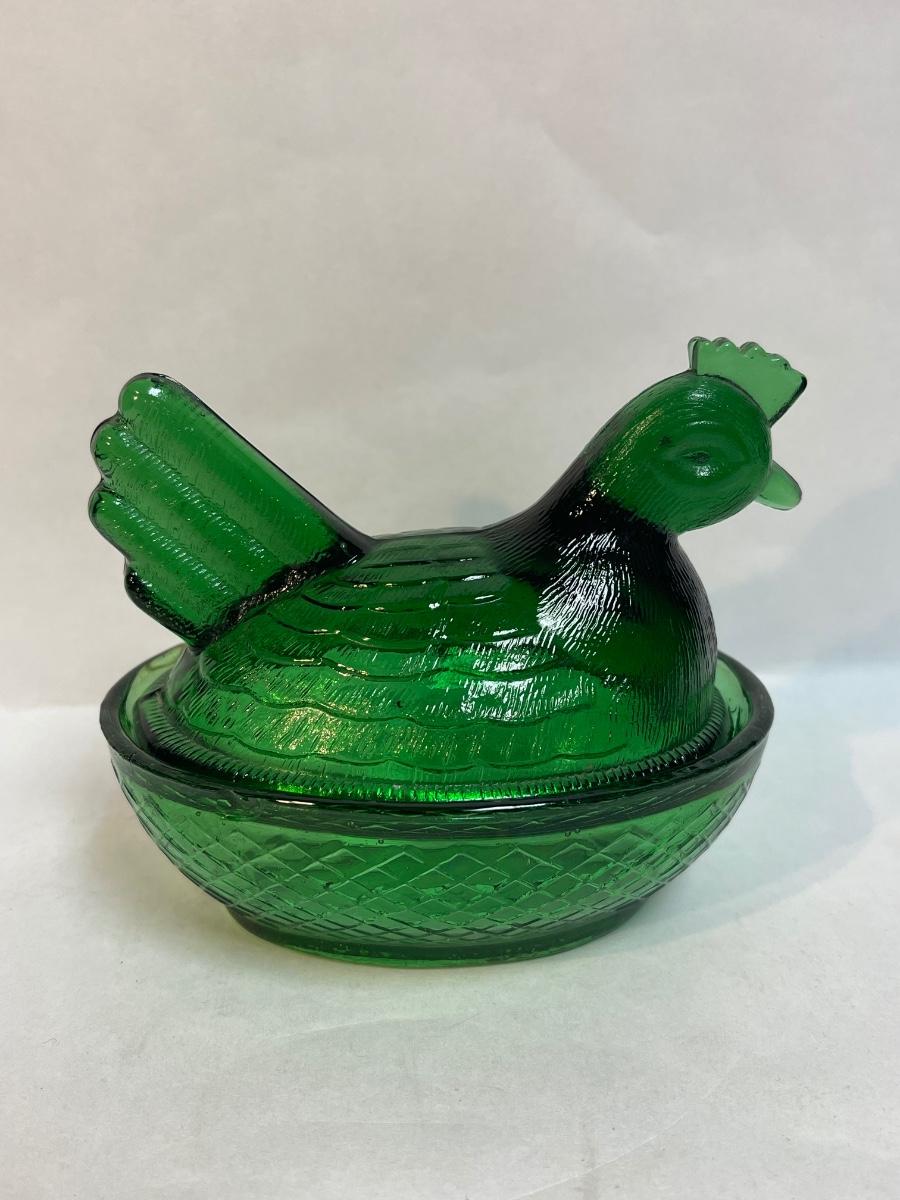 Vintage Glass Hen on Nest Covered Dish Emerald Green Lidded Candy Butter