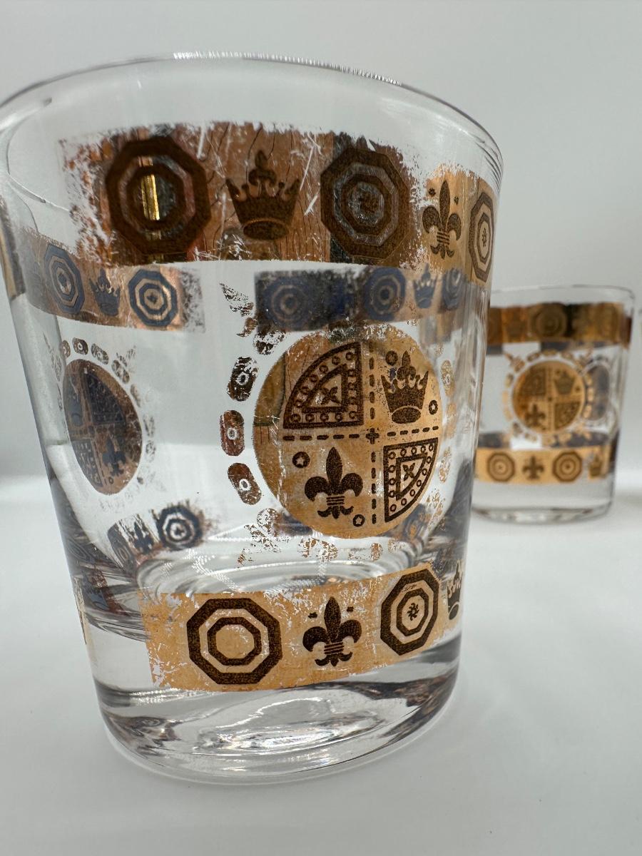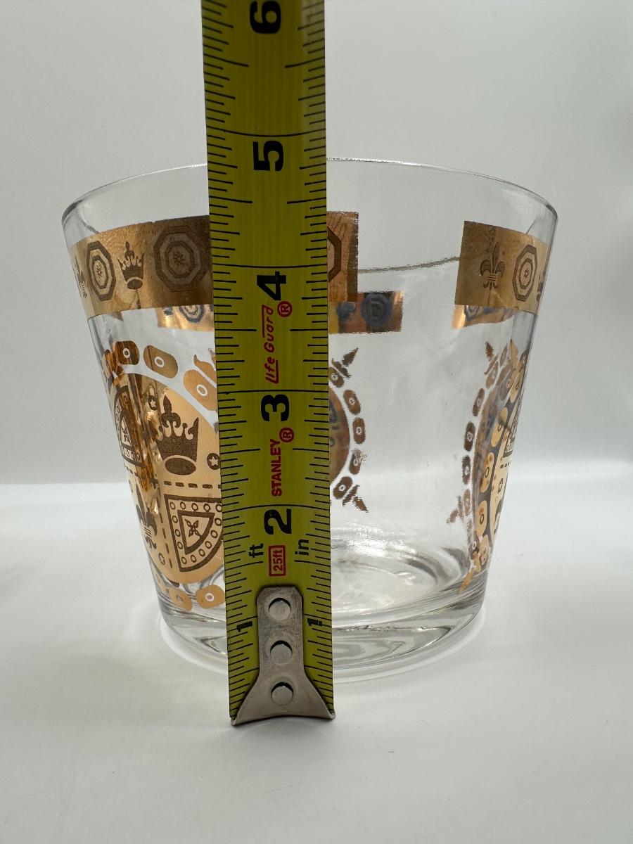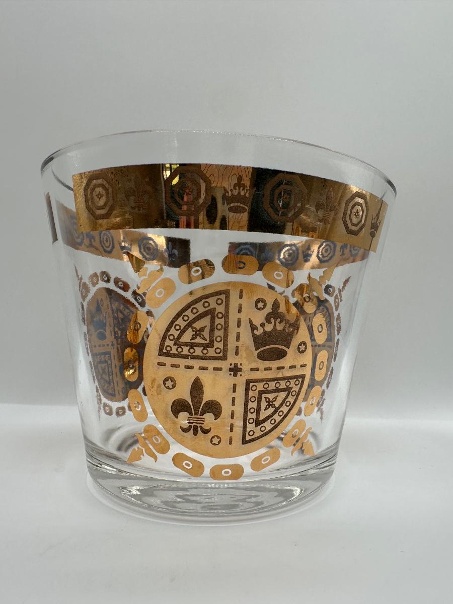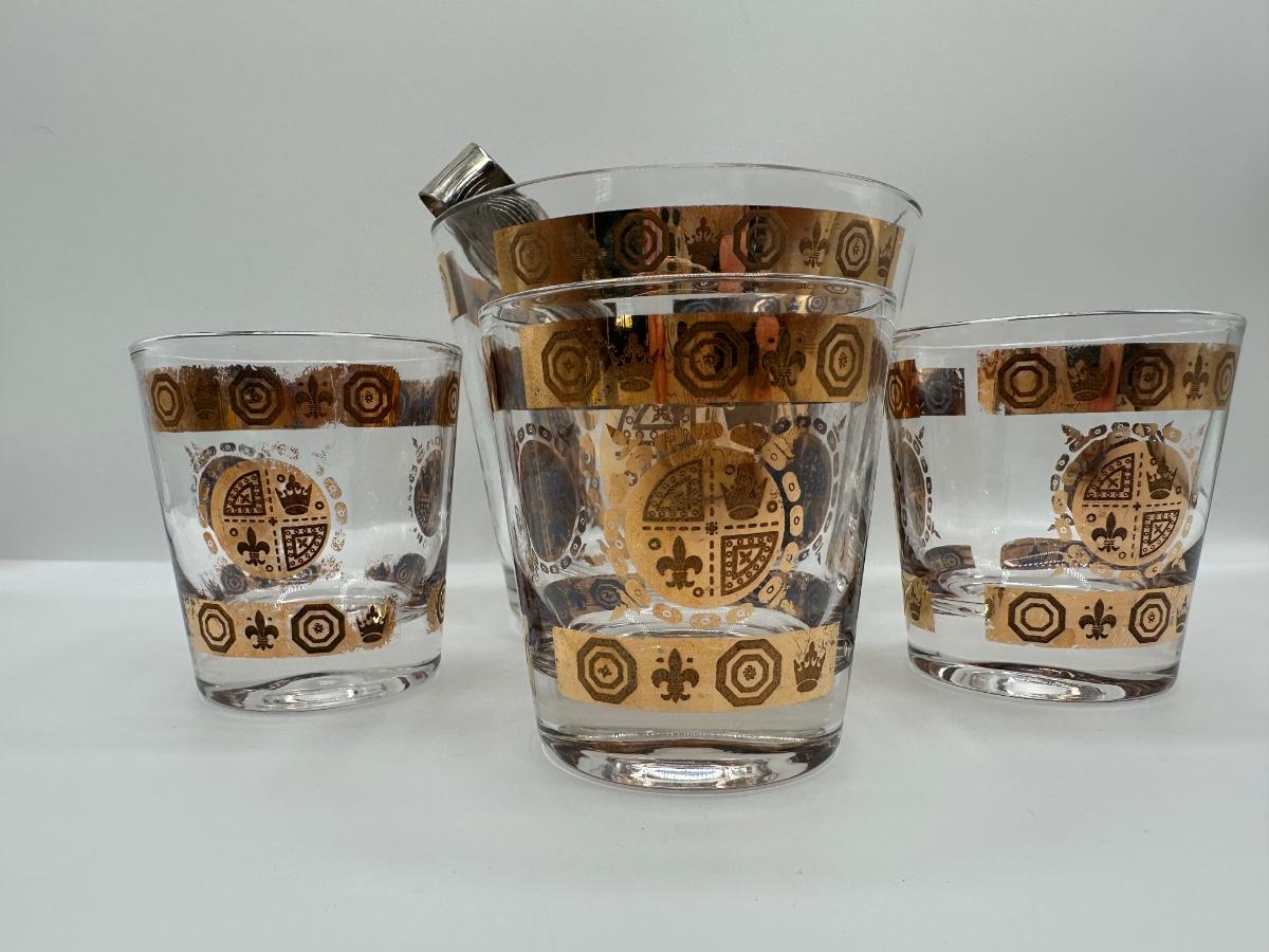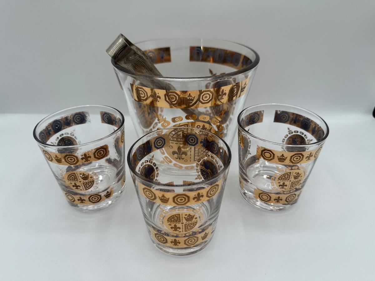 Vintage Glass Ice Bucket & 3 Glasses Gold Crown and Flu De lis Pattern