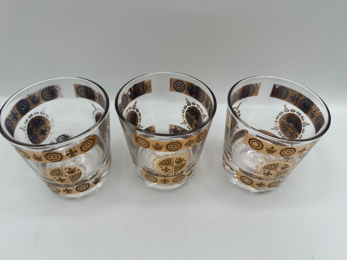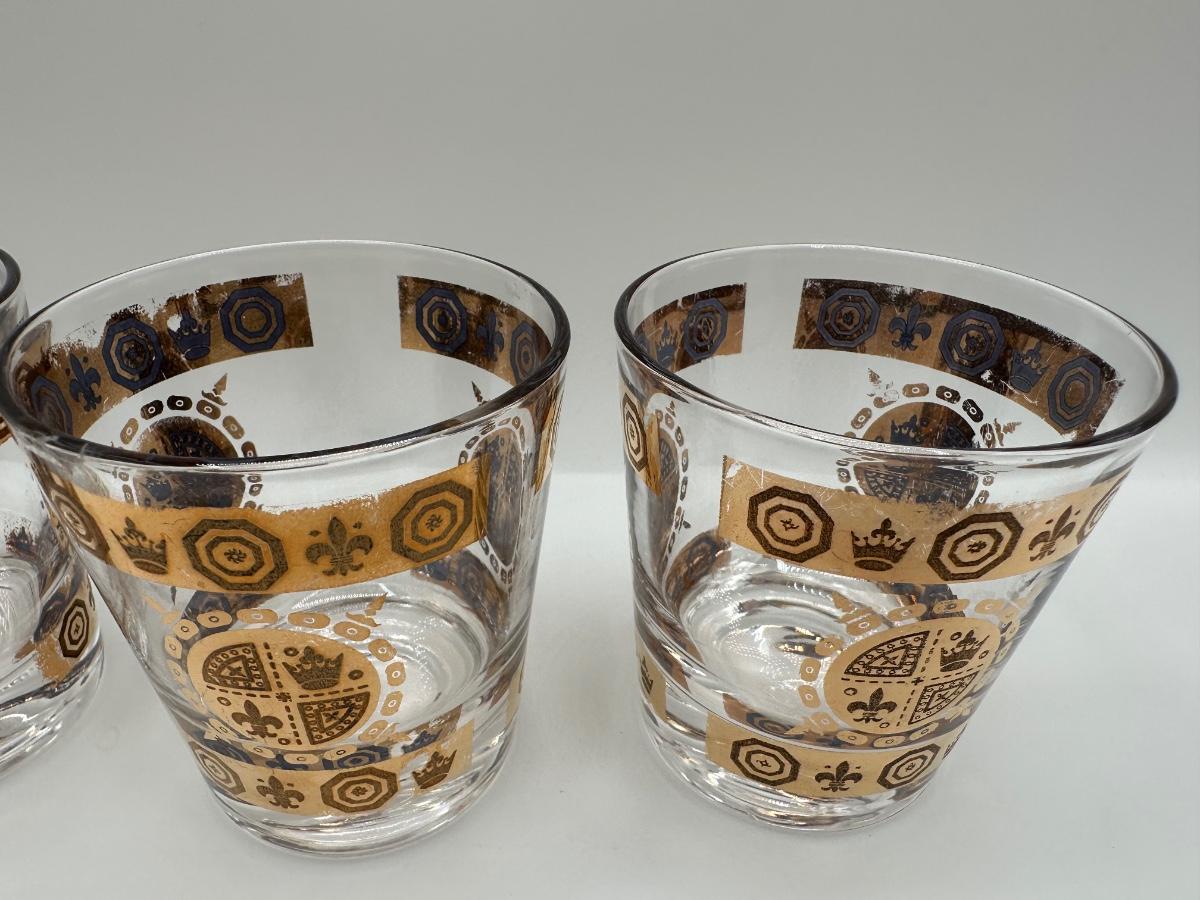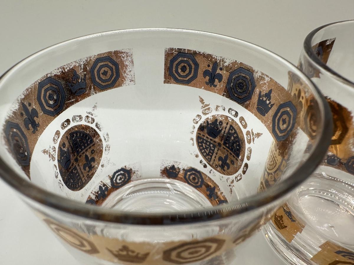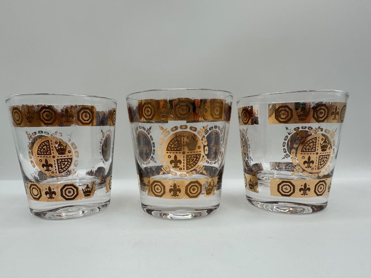 Vintage Glass Ice Bucket & 3 Glasses Gold Crown and Flu De lis Pattern