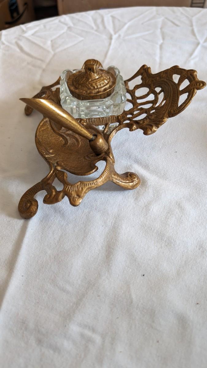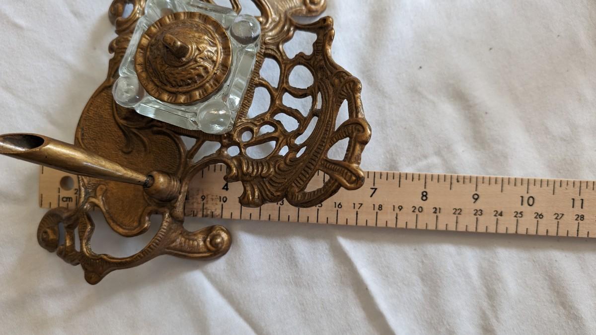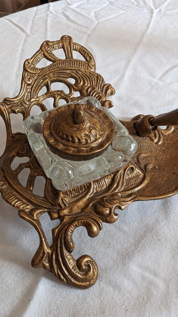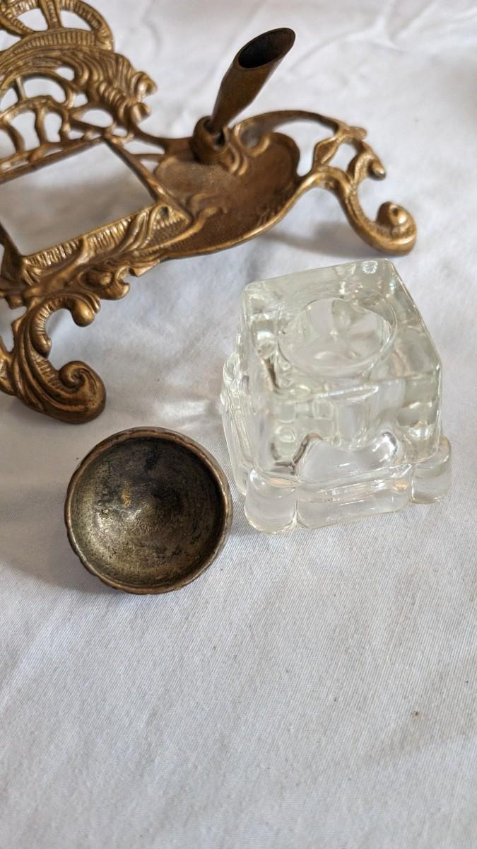 This is a vintage square glass inkwell with lid in a metal painted stand with pen holder