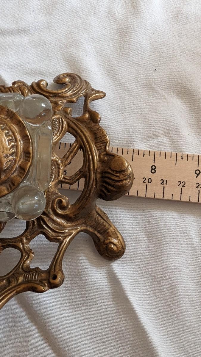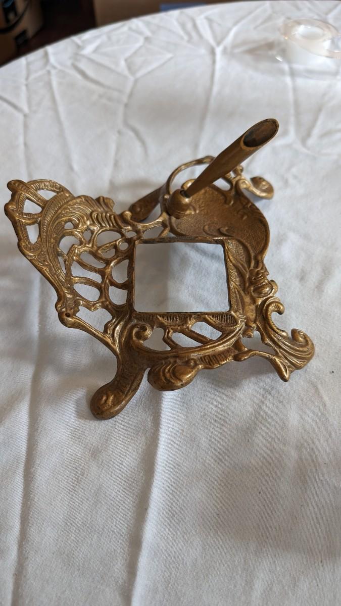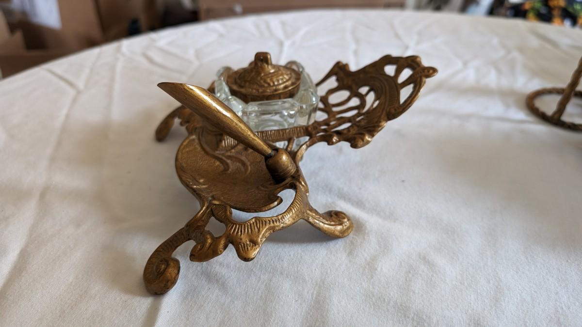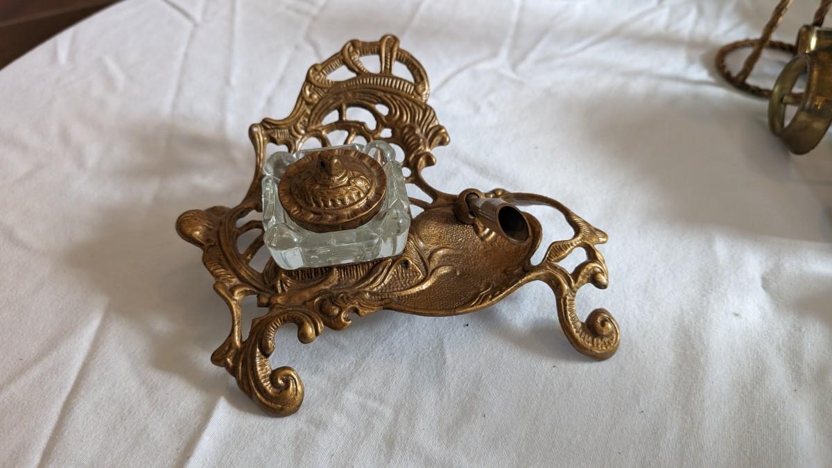 This is a vintage square glass inkwell with lid in a metal painted stand with pen holder