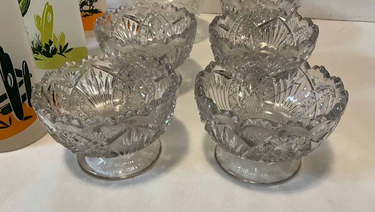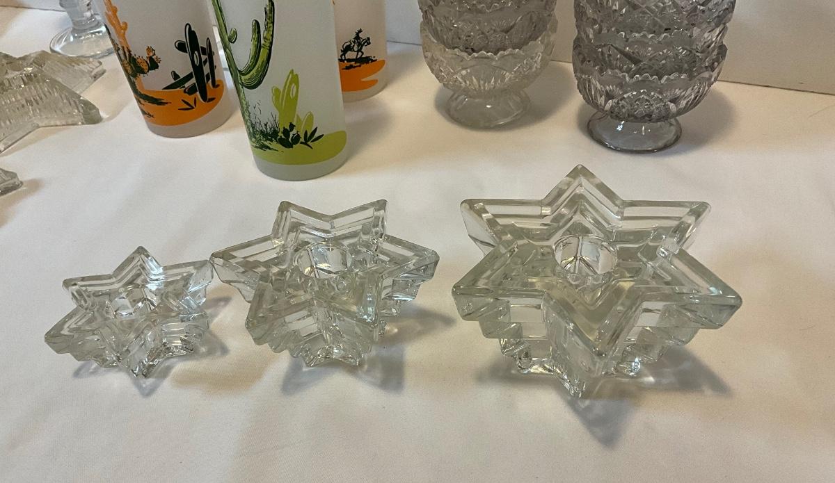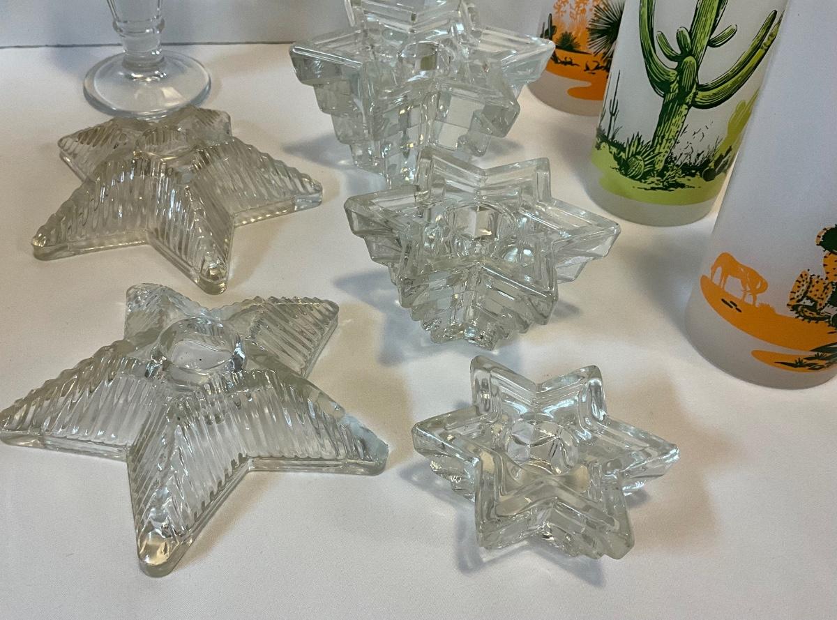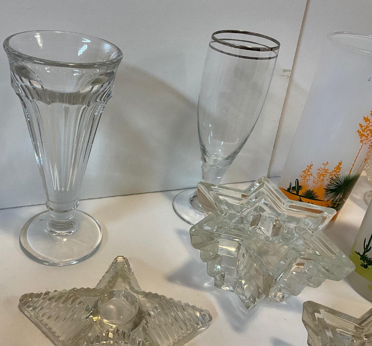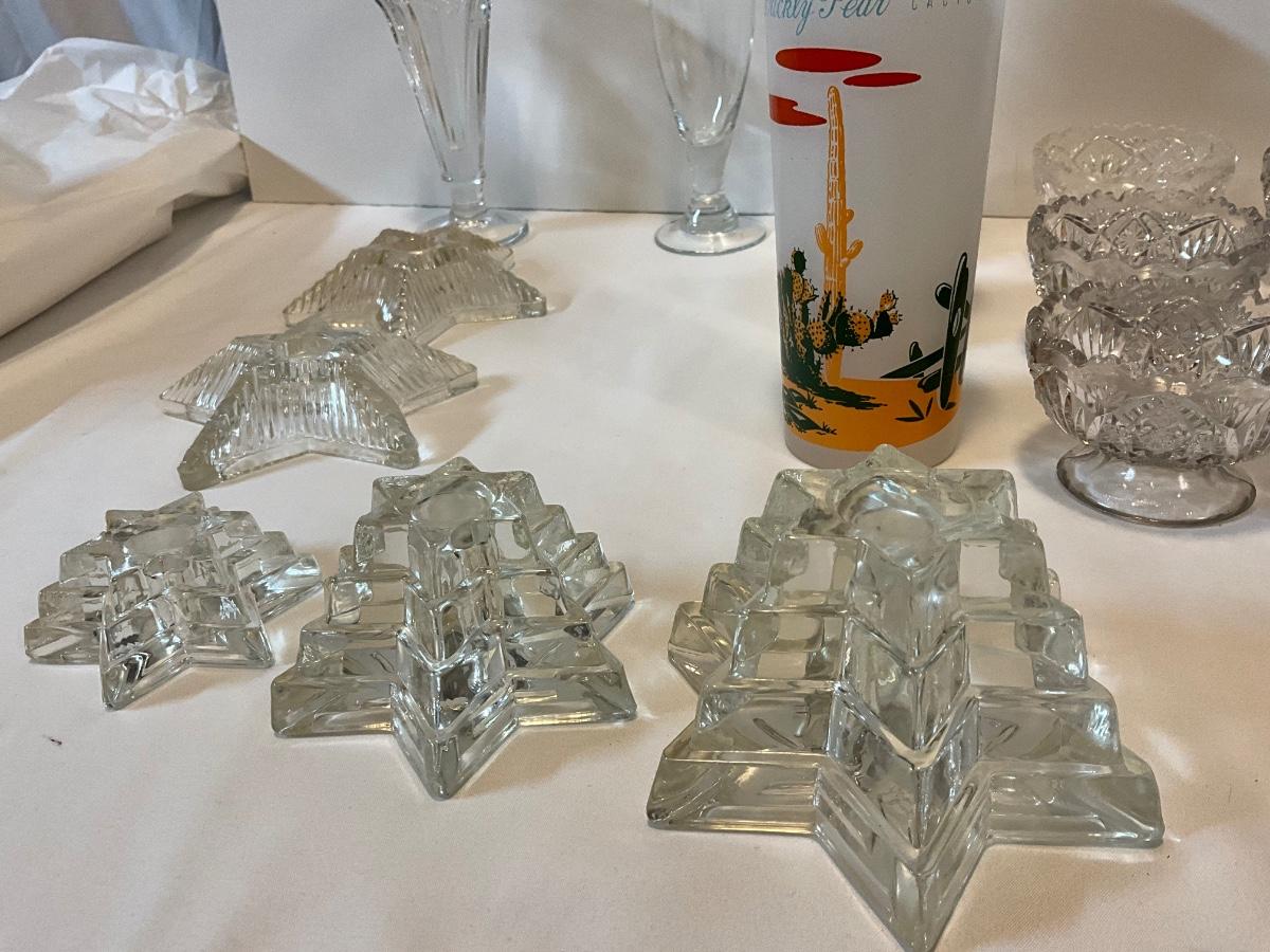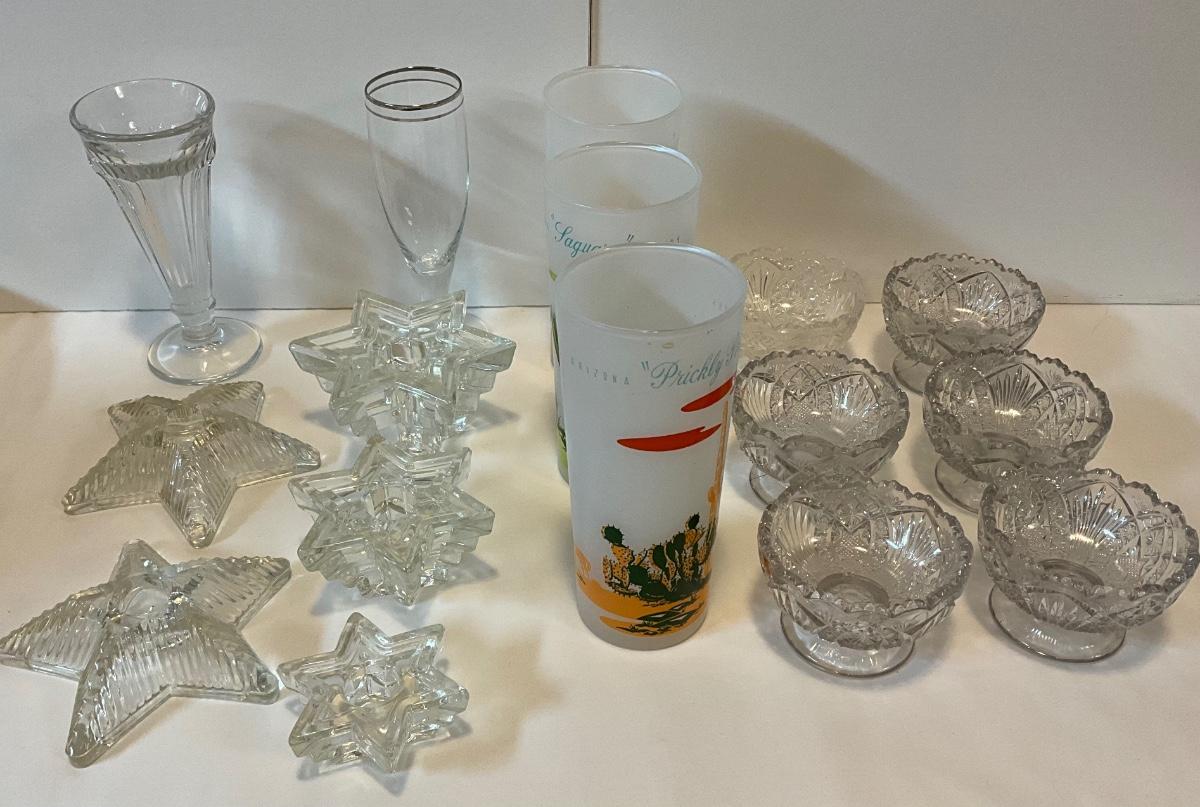 Vintage glass items, dessert dishes, star candleholders, tall Arizona drinking glasses