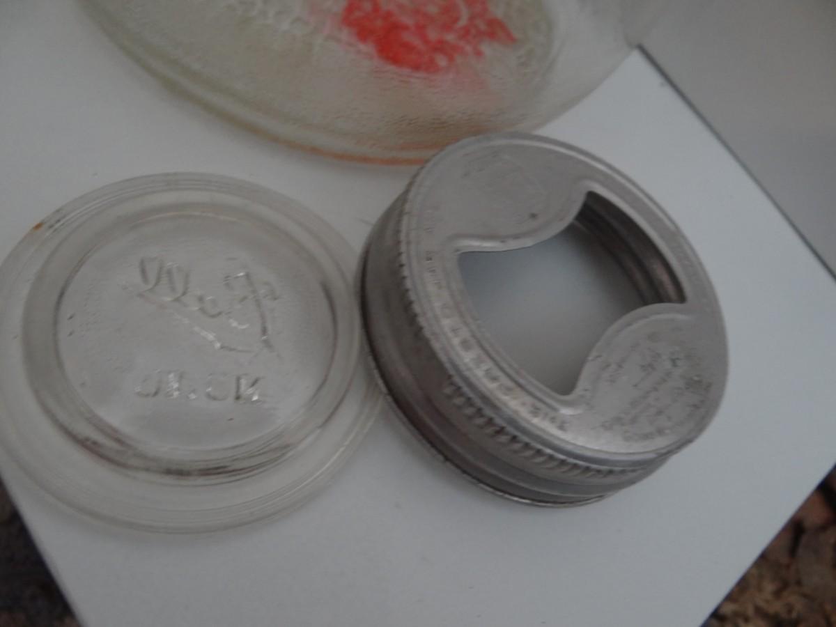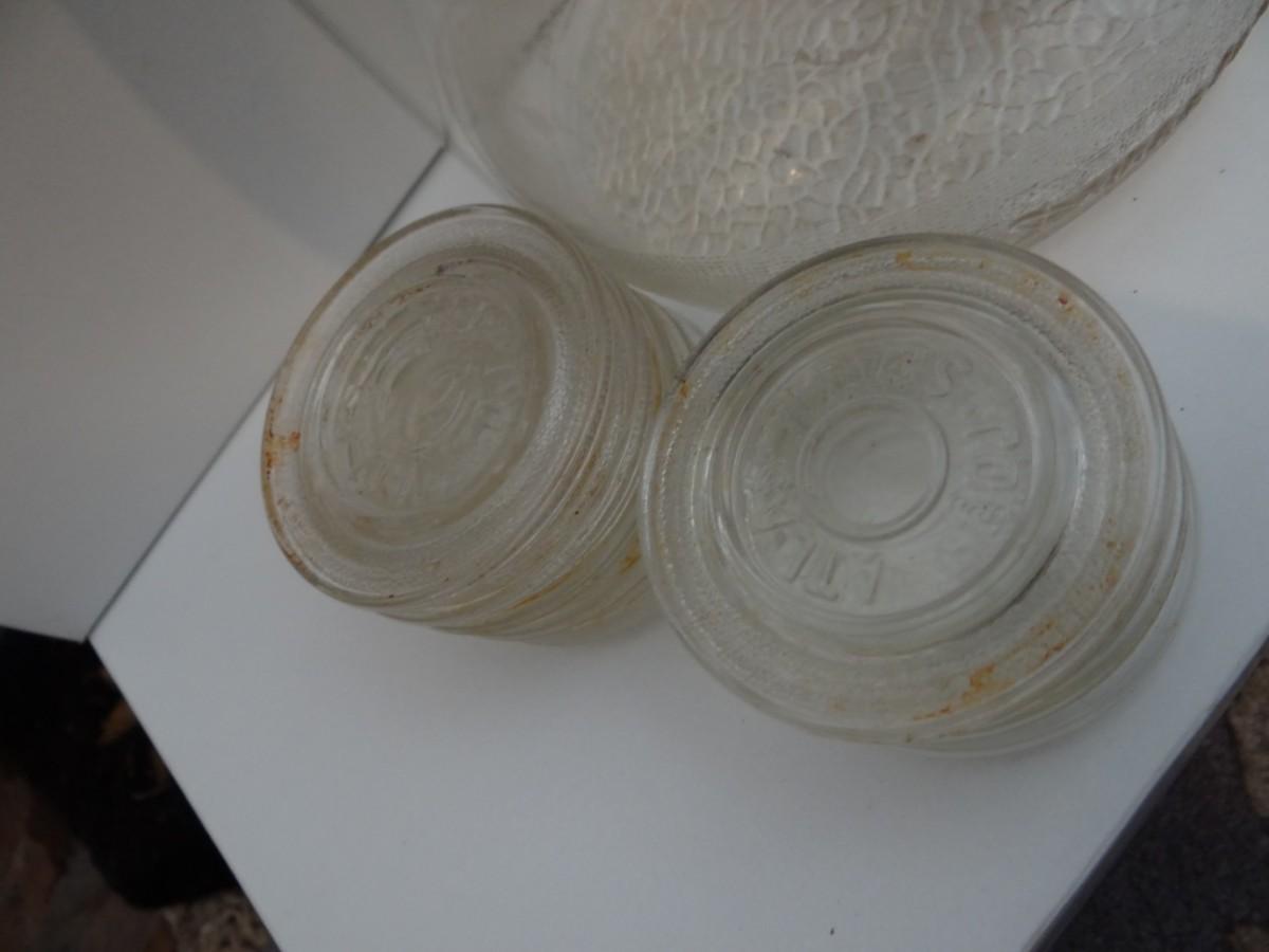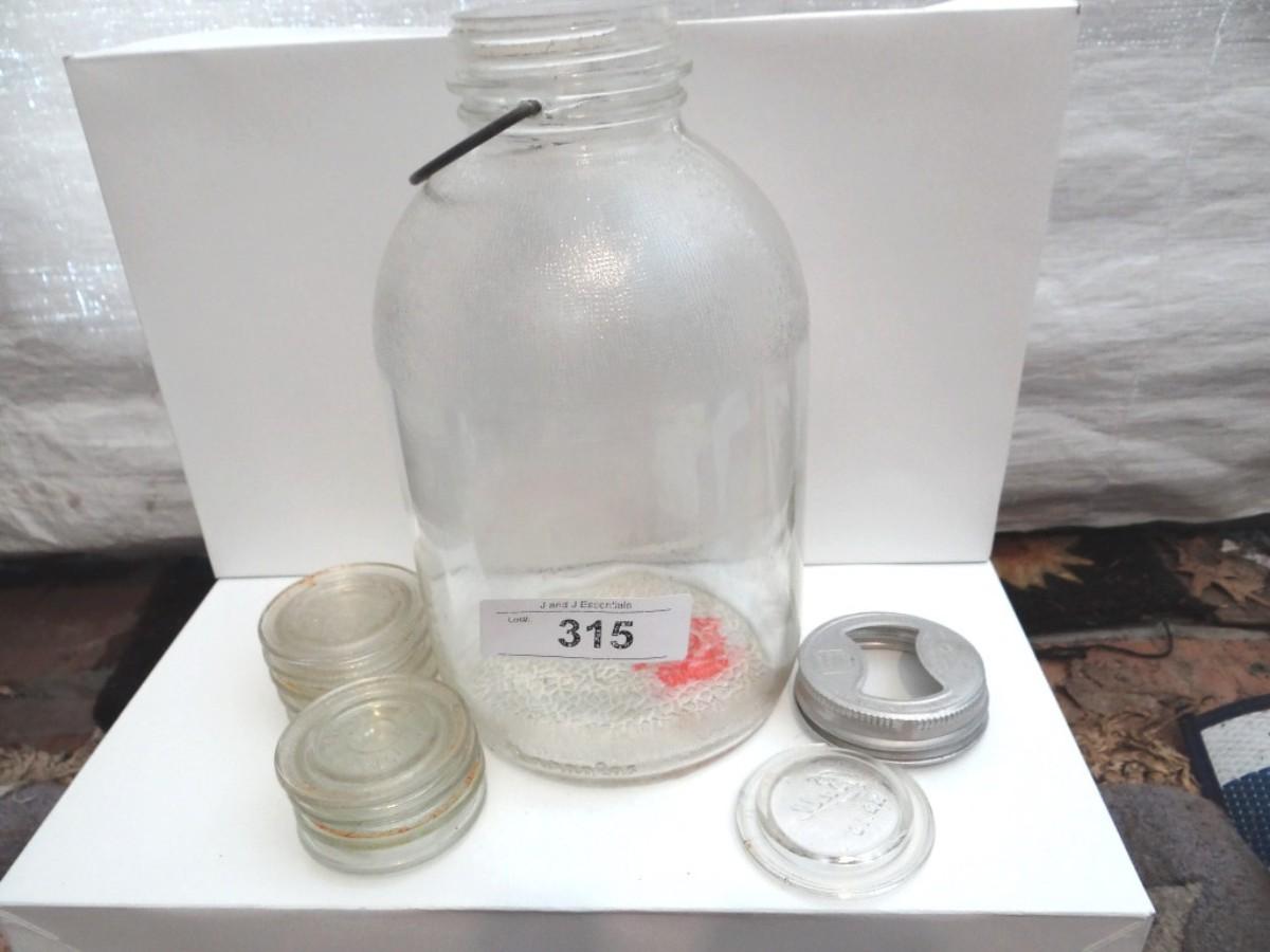 VINTAGE GLASS JUG AND GLASS CANNING LIDS