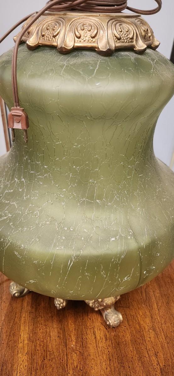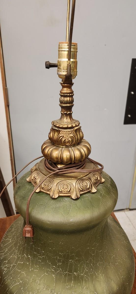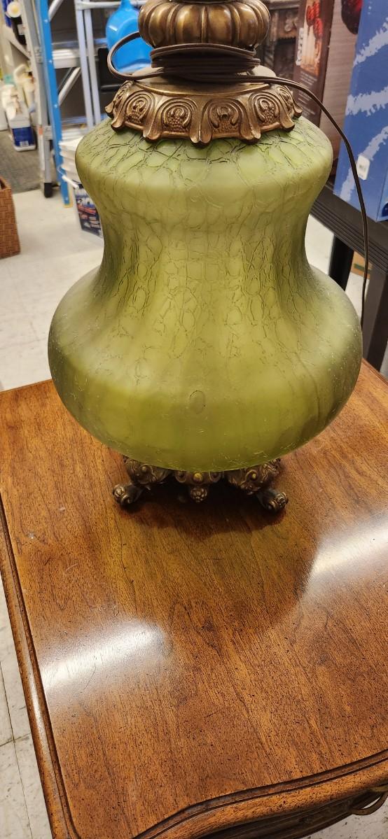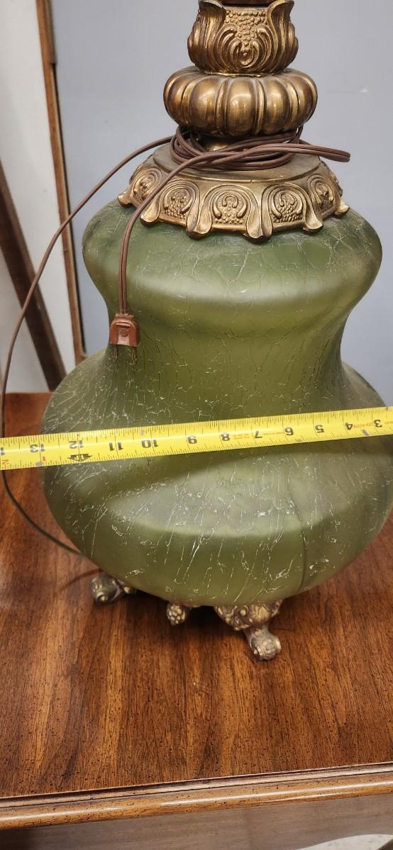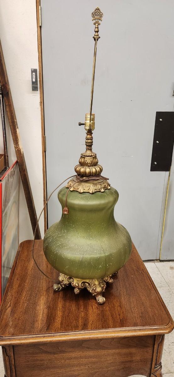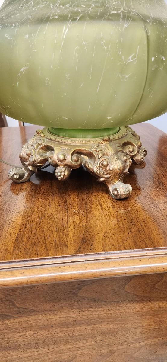 Wonderful vintage lamp the ormalu is metal and the base is an amazing avocado green textured glass. This thing is huge!
