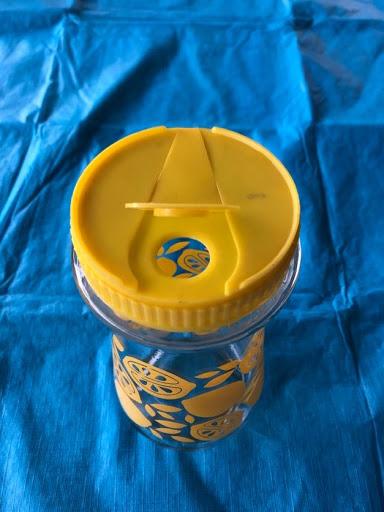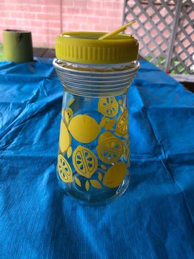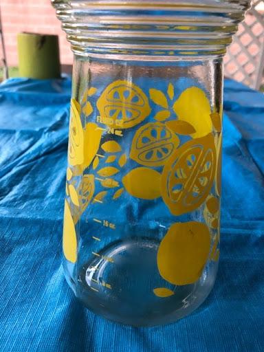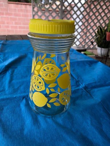 Vintage glass lemonade pitcher. Bright yellow lemon design. plastic yellow screw on top. Good Condition.
