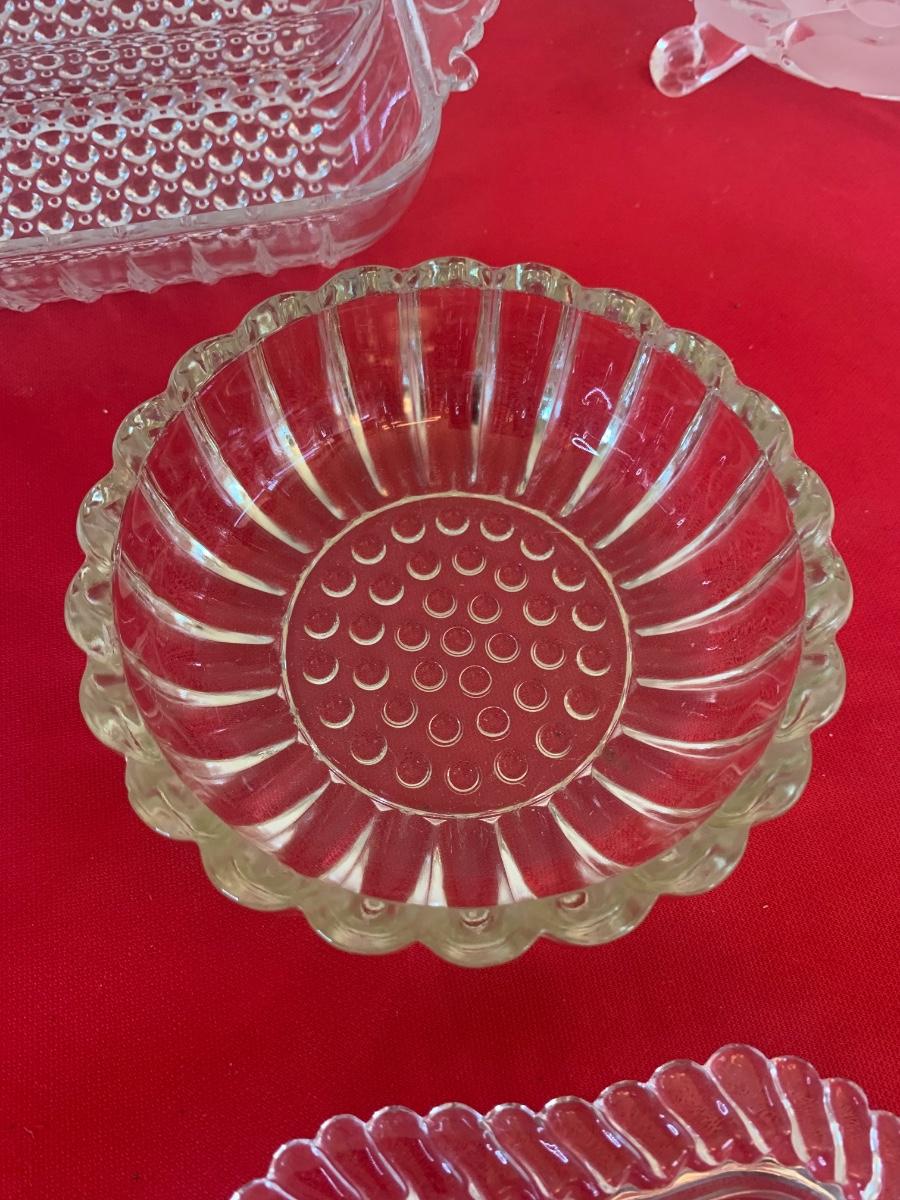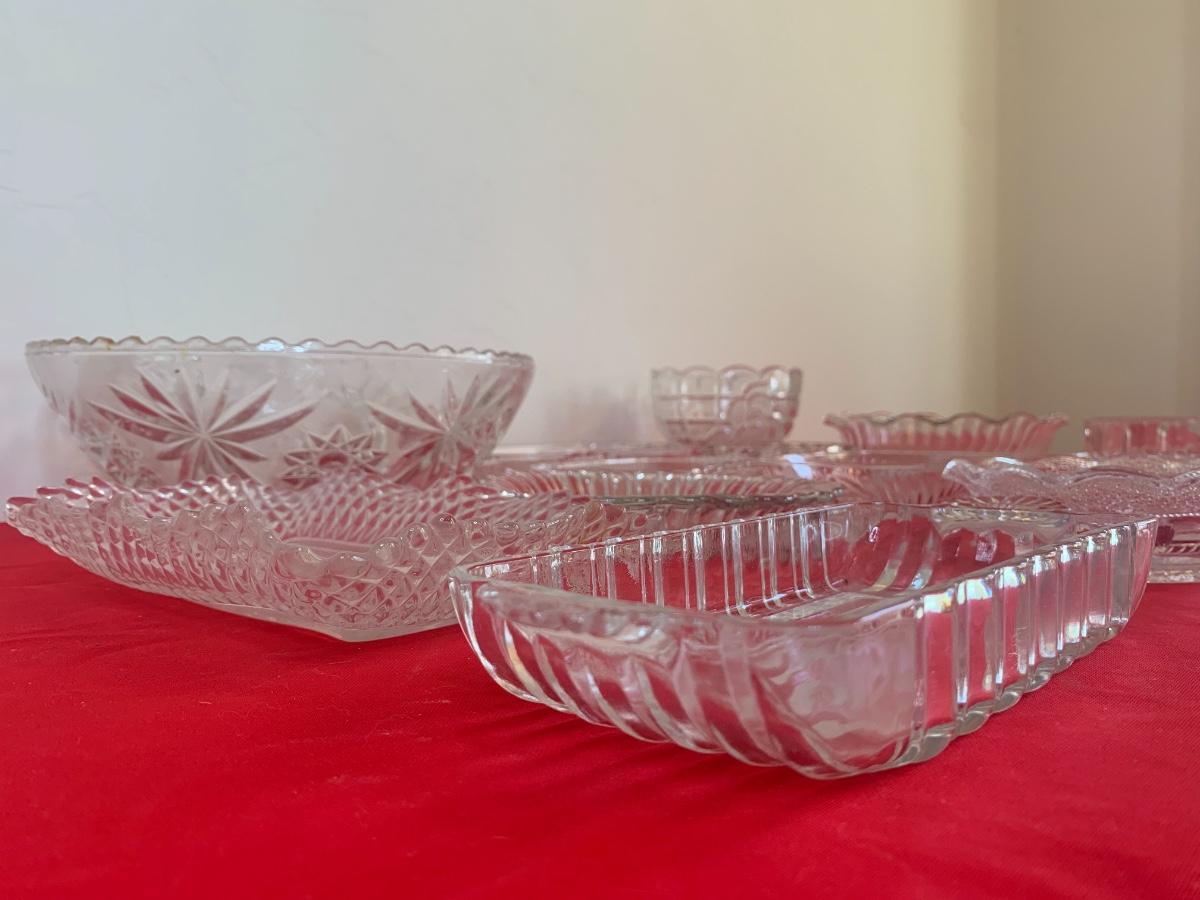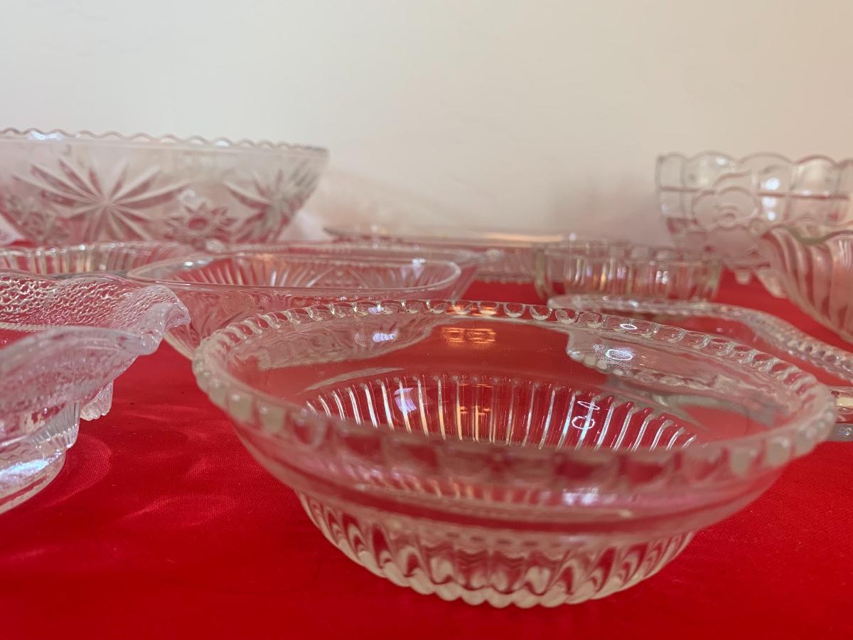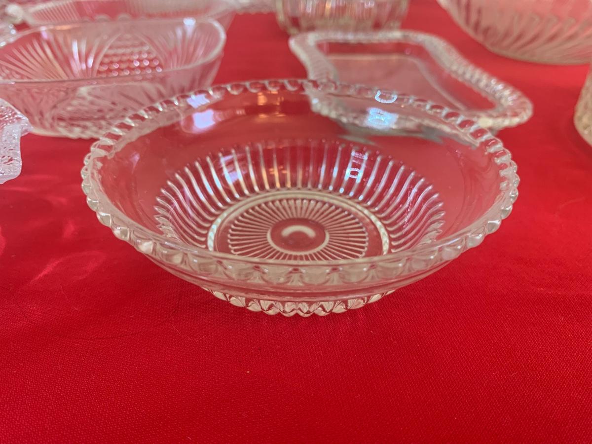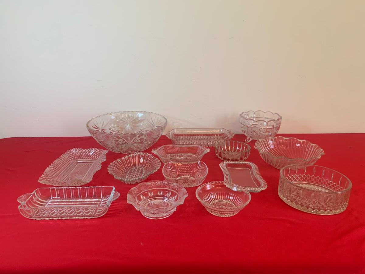 Lot includes a collection of antique and vintage clear glass dishes, bitters, bowls, and relishes. All in very good condition.