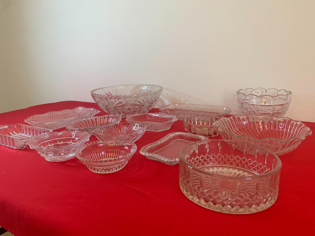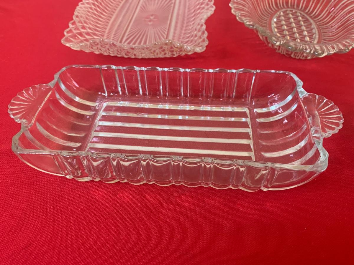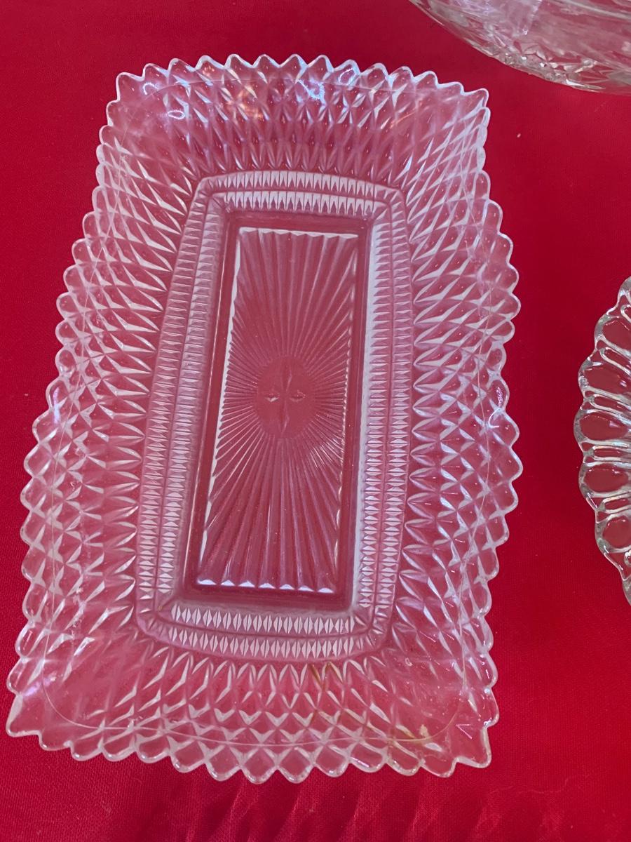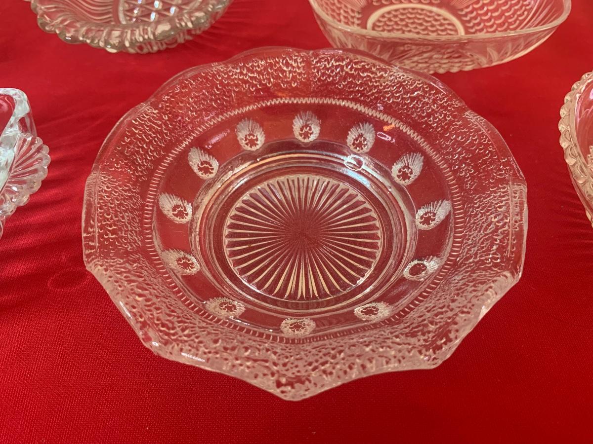 Lot includes a collection of antique and vintage clear glass dishes, bitters, bowls, and relishes. All in very good condition.