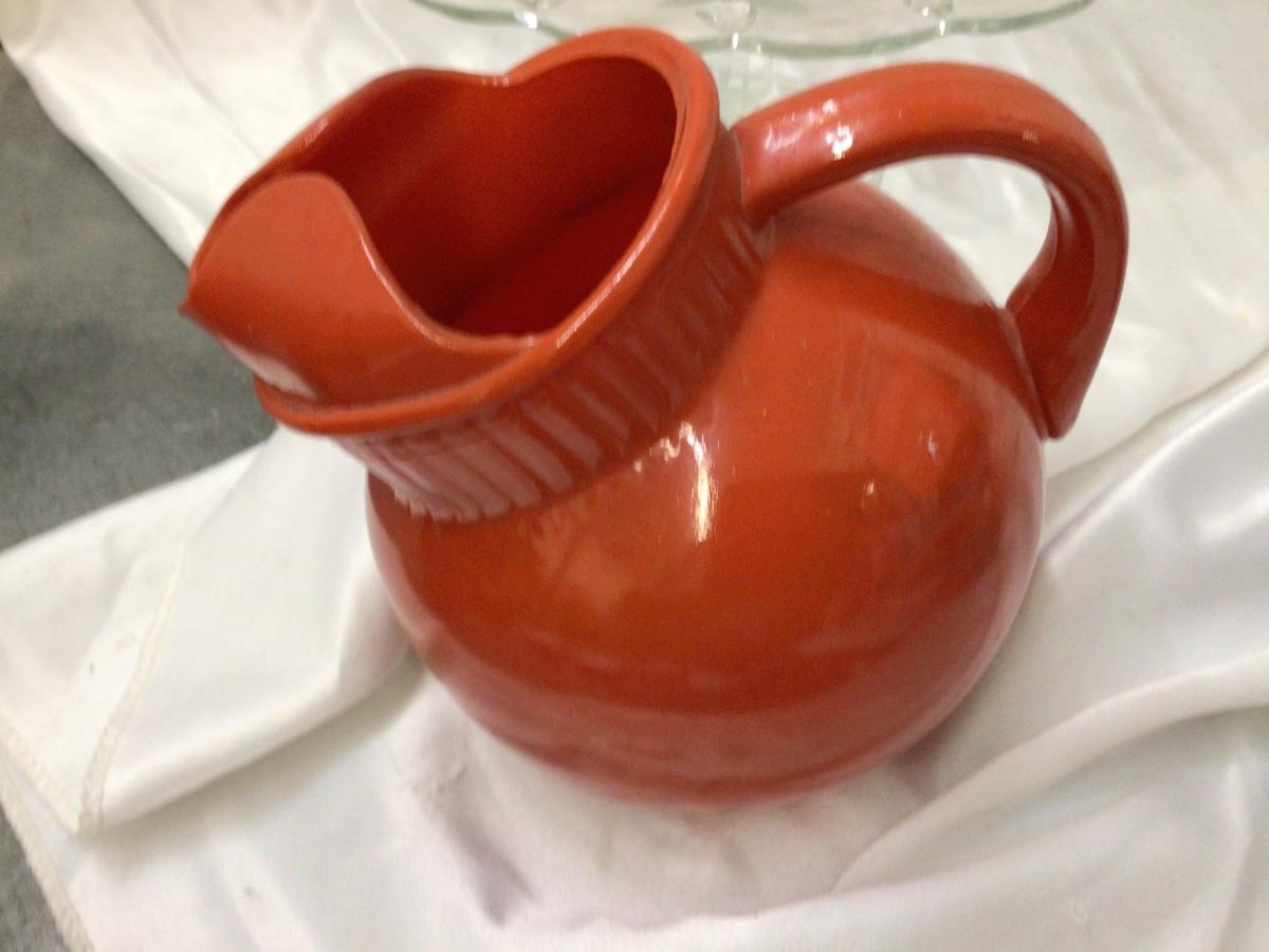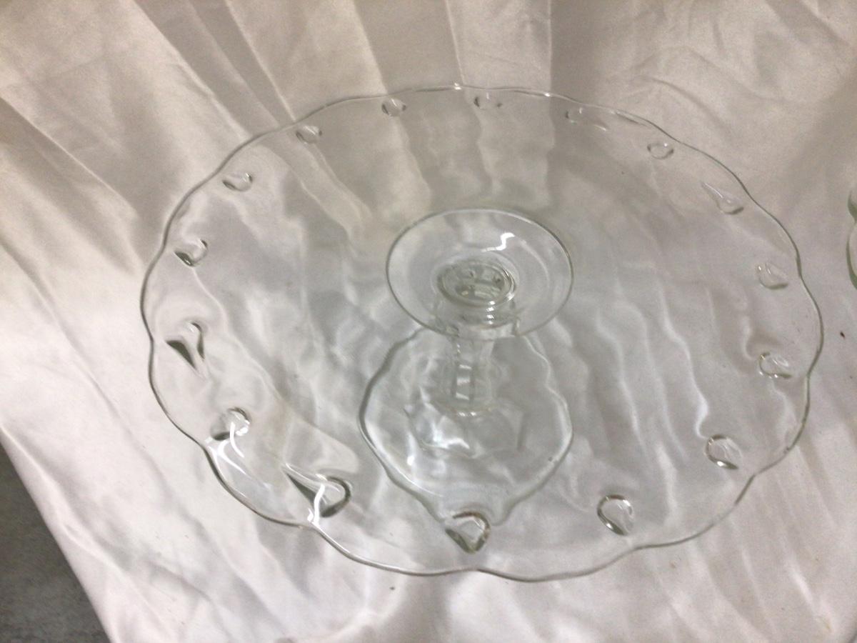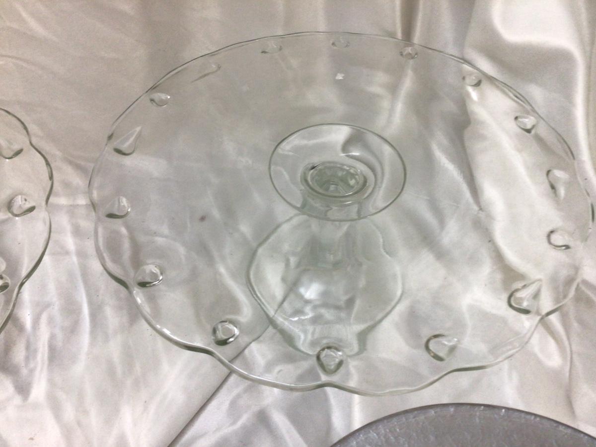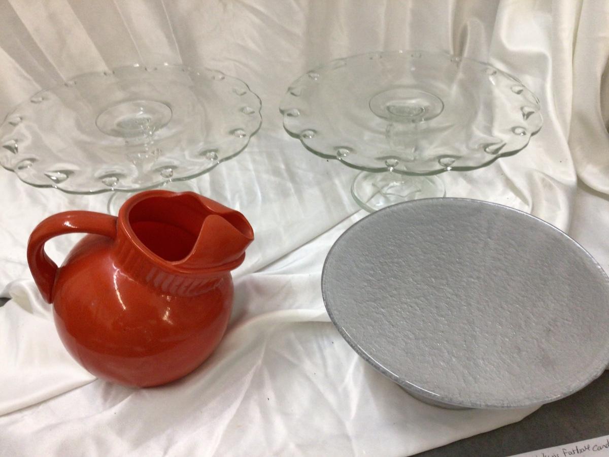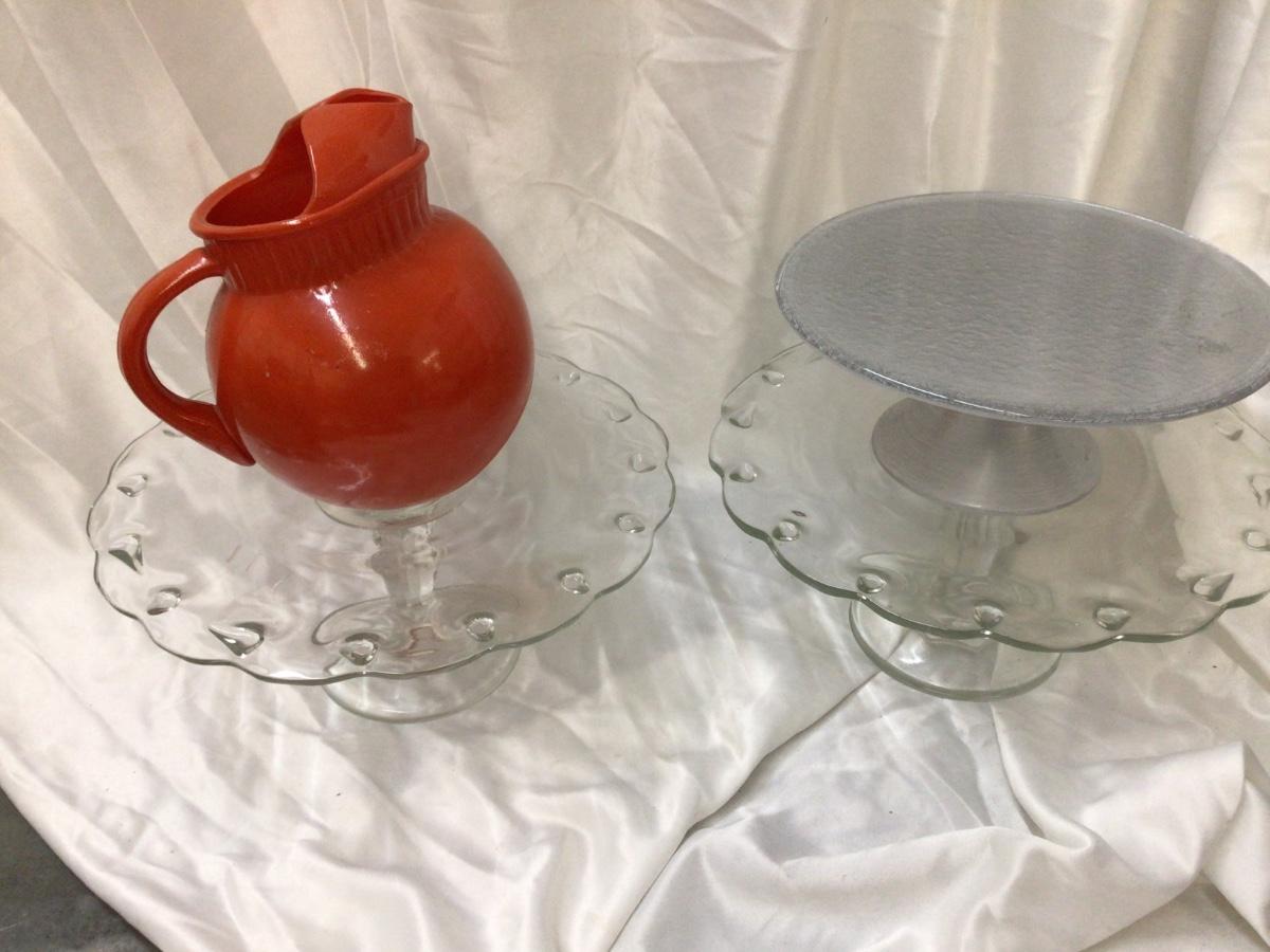 You get two large clear glass pedestal cake plates, a medium silver top glass pedestal cake plate and a nice reversed painted red glass ball pitcher.