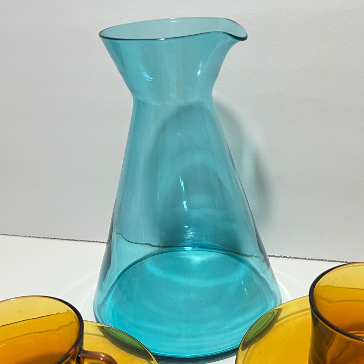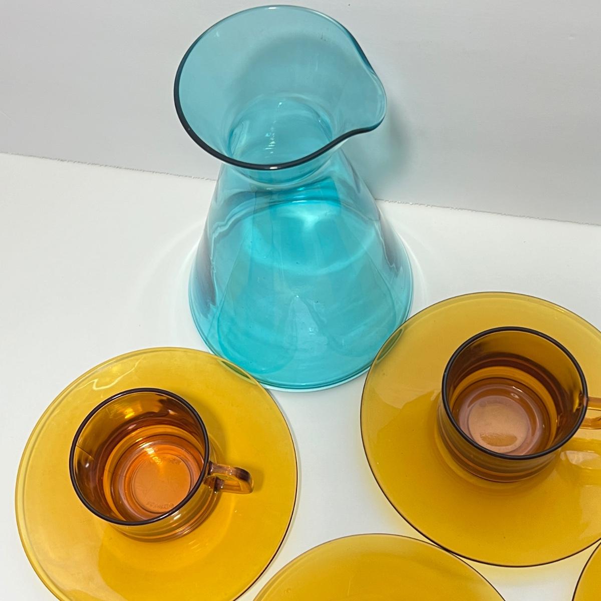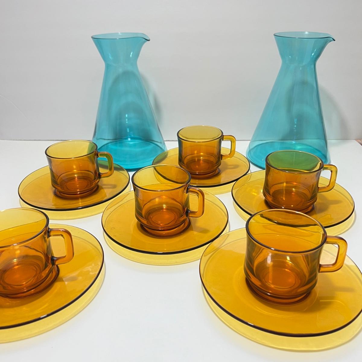 Vintage Glass Lot - 6 Duralex French Cups Saucers, 2 Aurora Borealis Blue Picthers