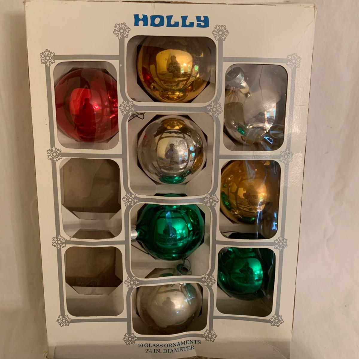Lot includes 105 glass ornaments in a variety of colors by Holly and Pyramid. Sizes included are 2.25”D and 1.75”D. Please note that the finish has worn on a few items. Please see photos for more details. Shipping available.