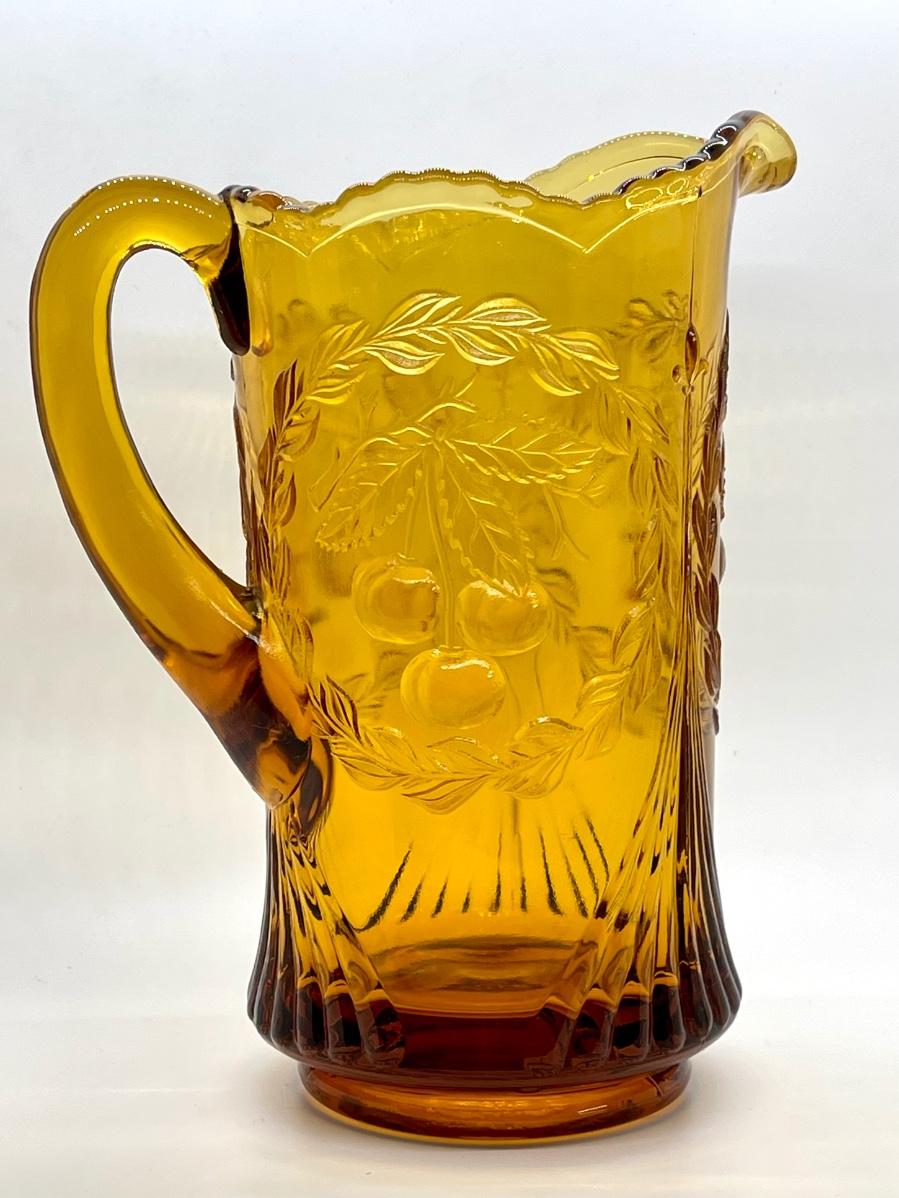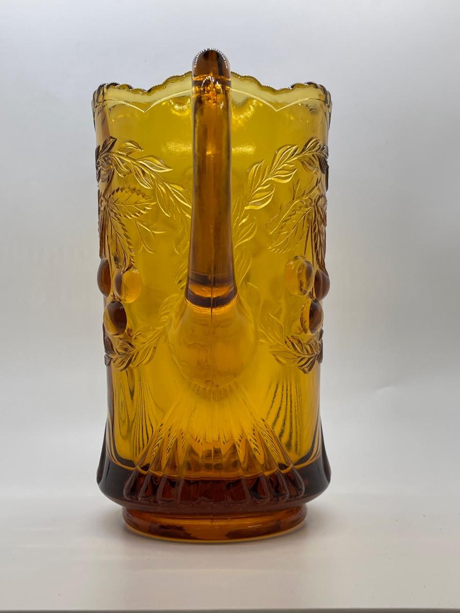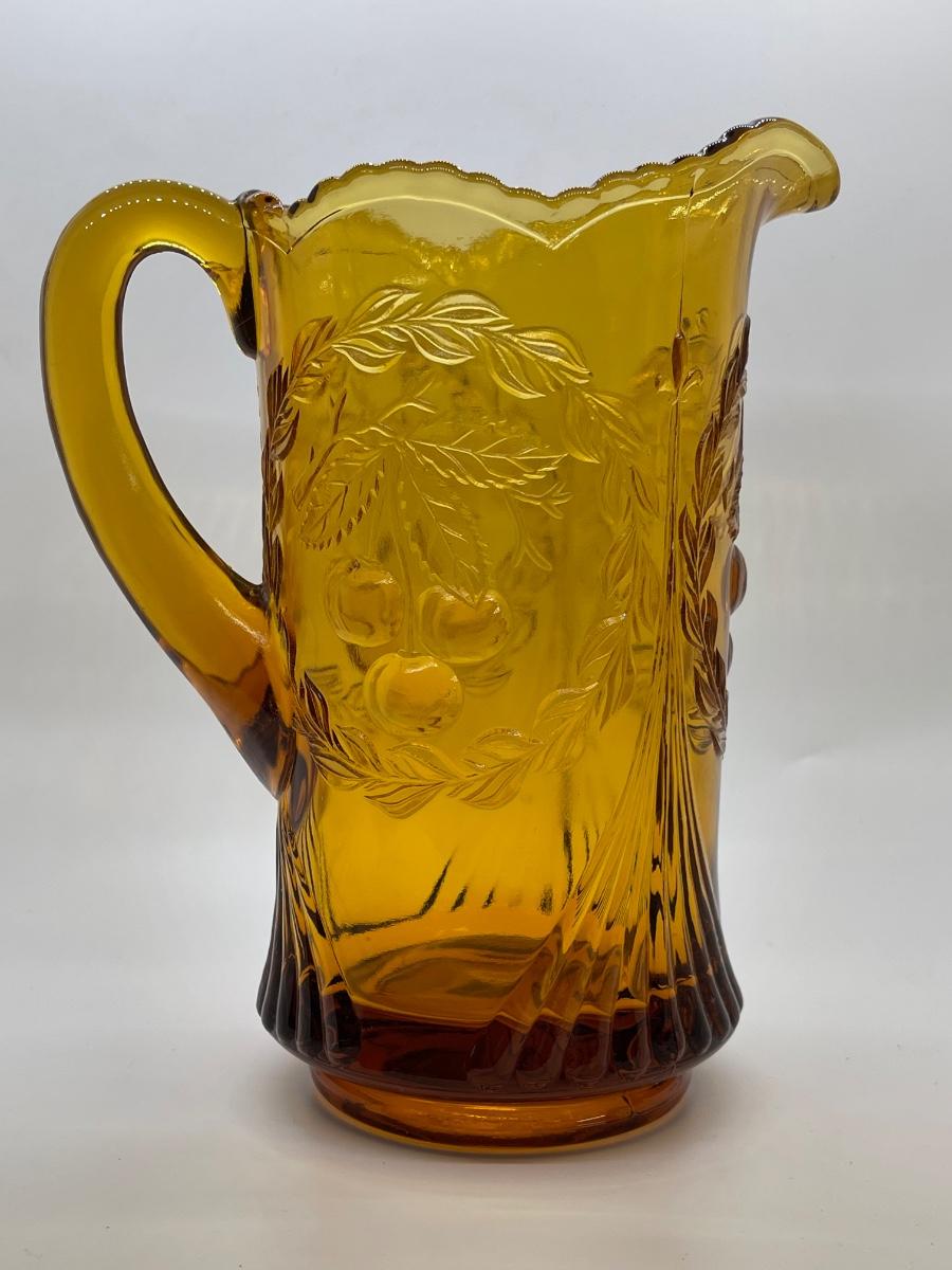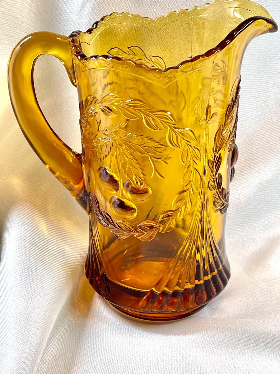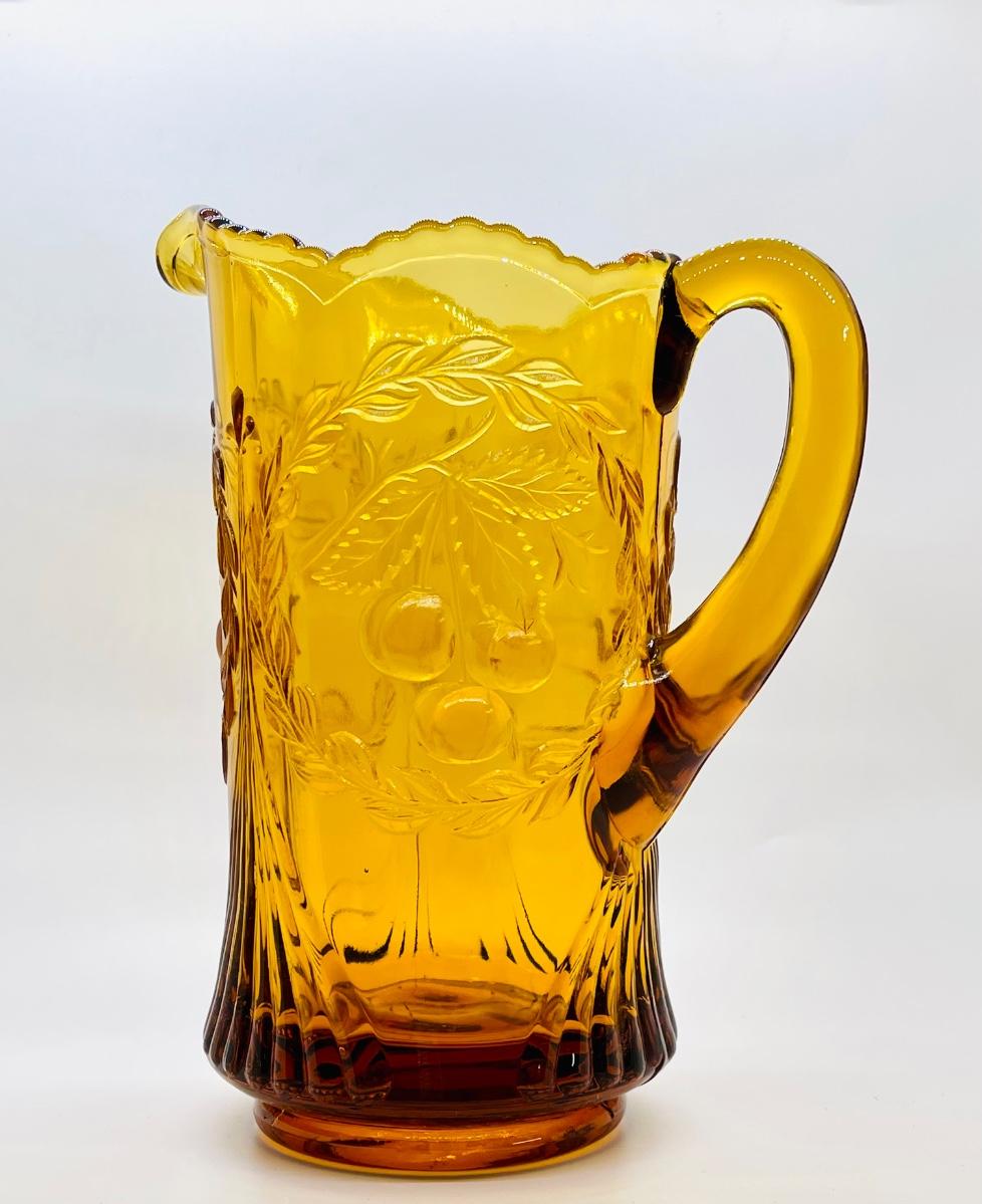 This beautiful piece is HEAVY!!!! Hard to find wreathed cherry pattern. It’s a gorgeous amber with beautiful details to the body, base and handle. You definitely need this one in your glass Collection! She’s a real beauty!