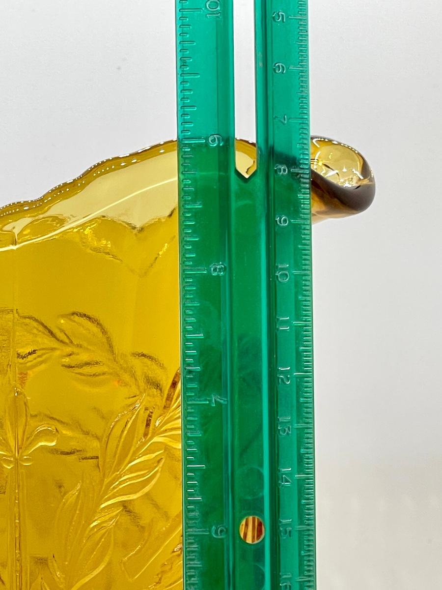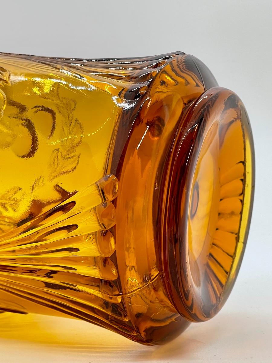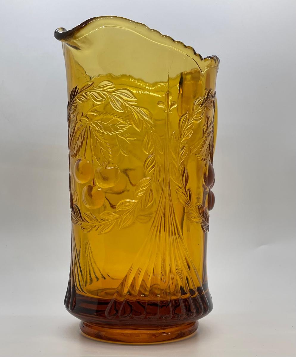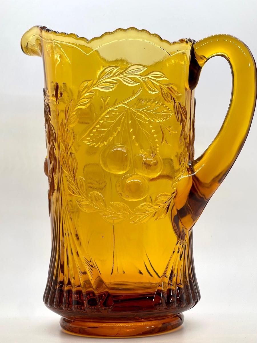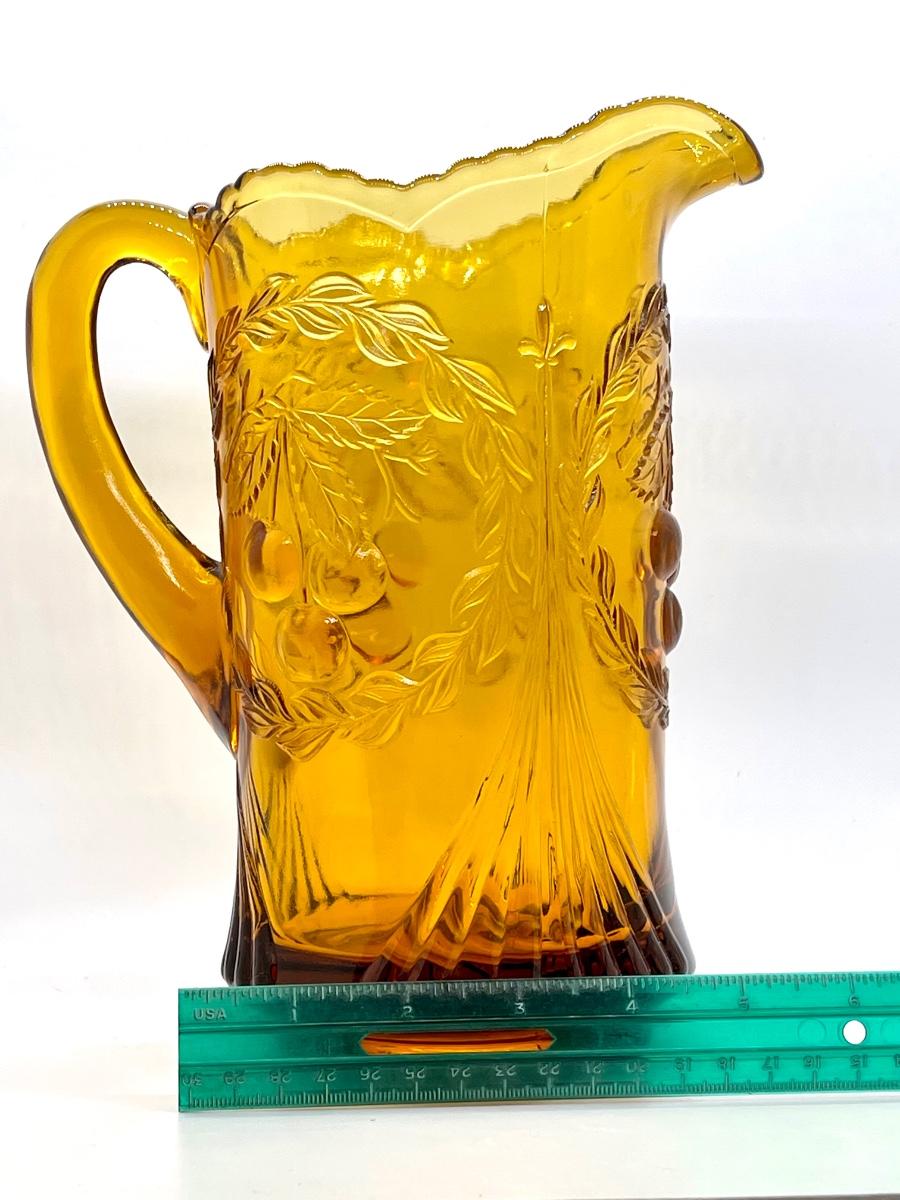 This beautiful piece is HEAVY!!!! Hard to find wreathed cherry pattern. It’s a gorgeous amber with beautiful details to the body, base and handle. You definitely need this one in your glass Collection! She’s a real beauty!