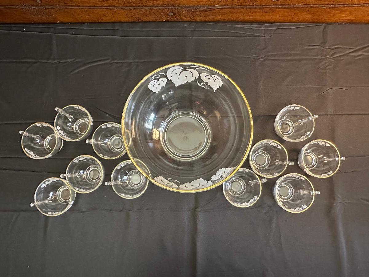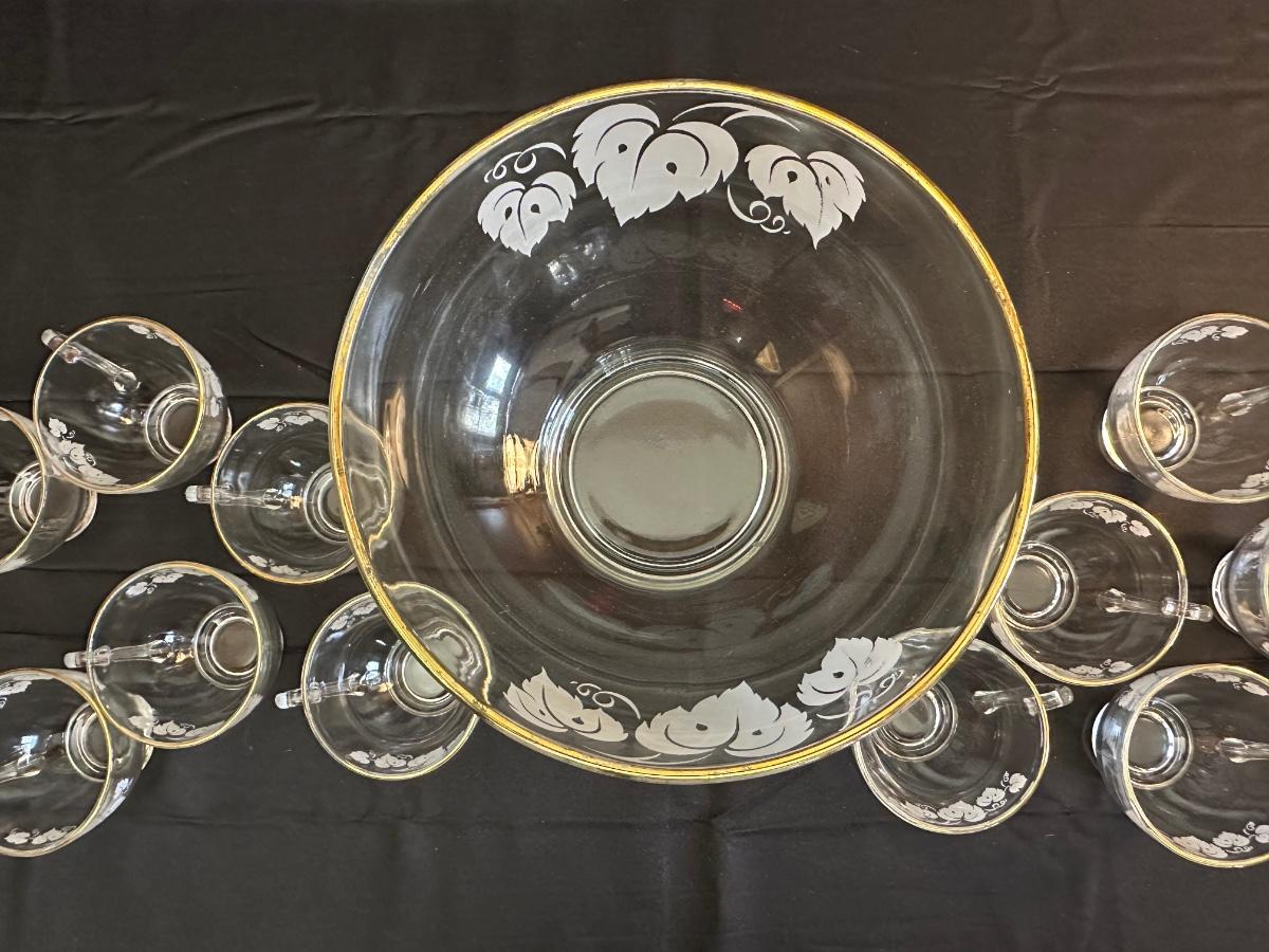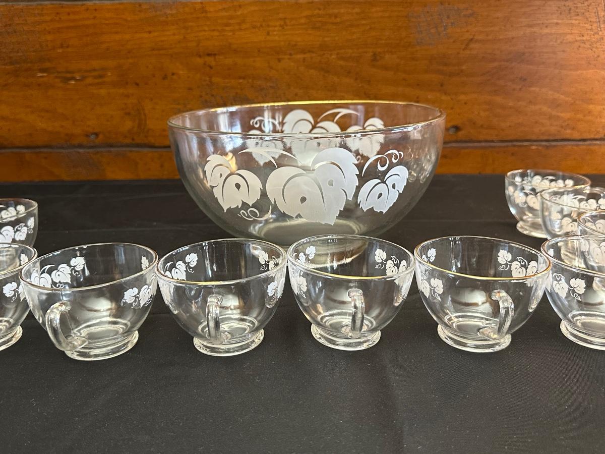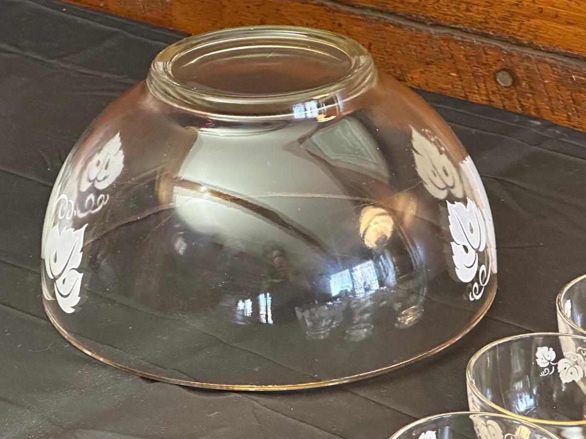 Vintage Glass Punch Bowl and Cups with Frosted Leaf Pattern